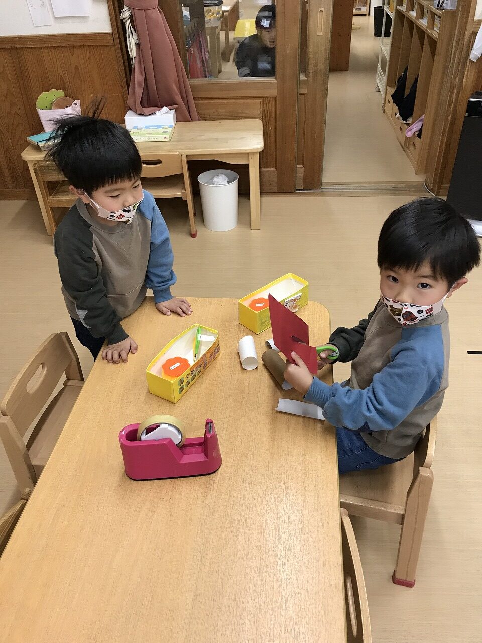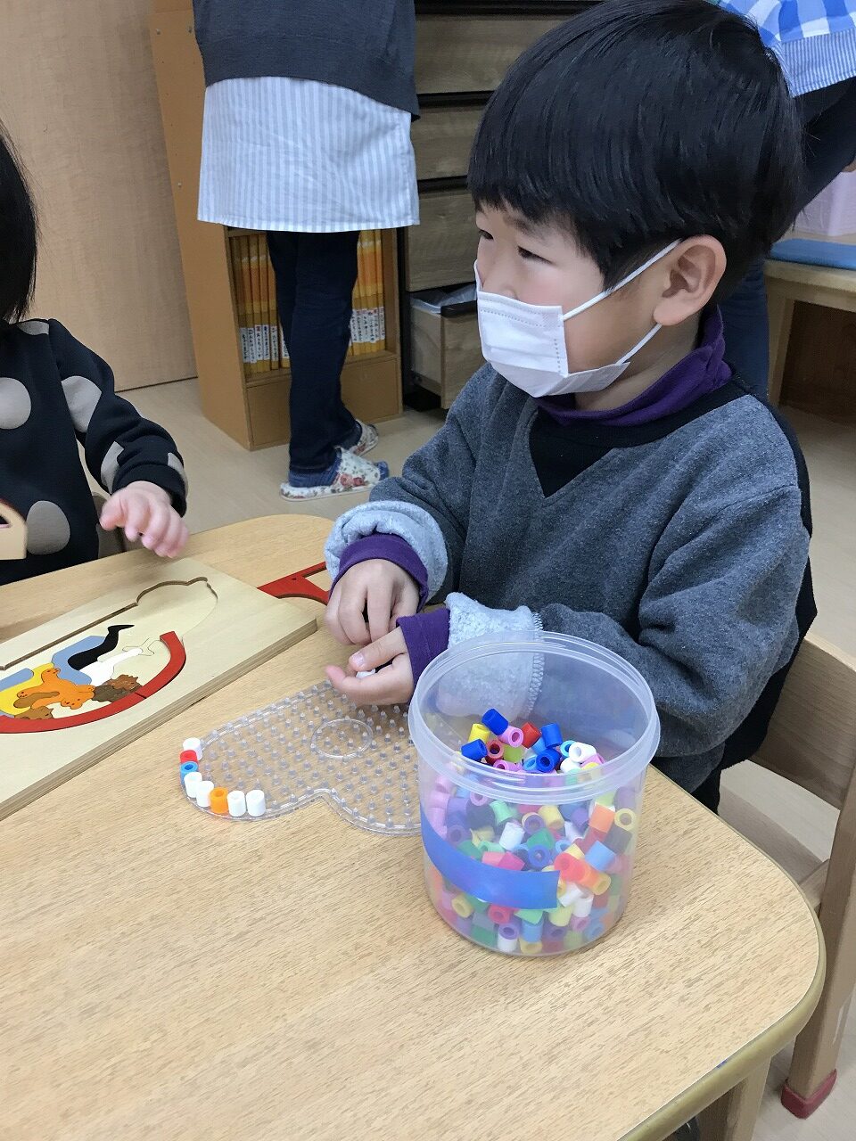 わくわくらんどの自由遊びコーナーの玩具が入れ替わったので、「これしてみる?」と友だちを誘ったり自分に合ったものを選んでいました。