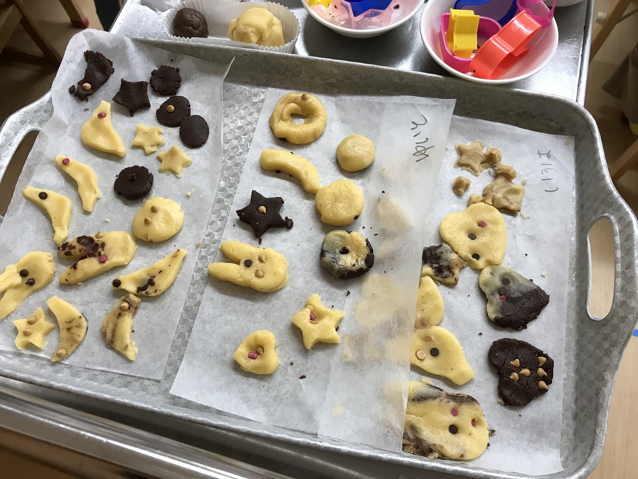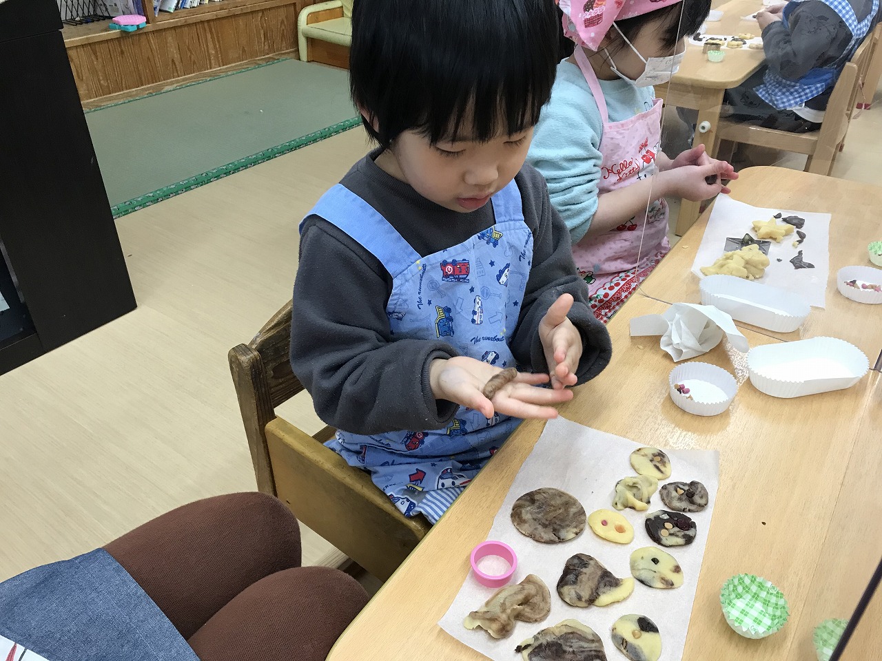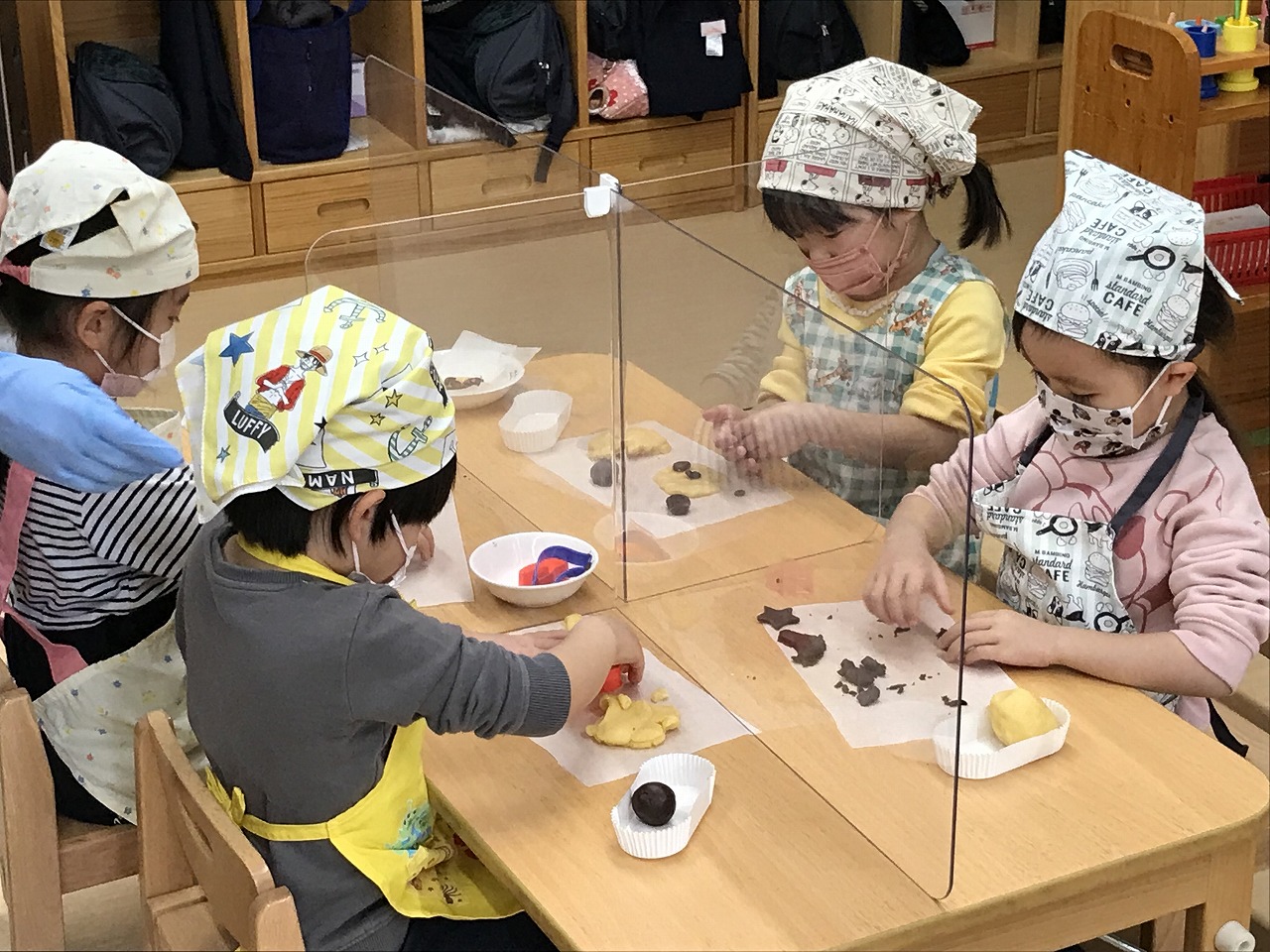 楽しみにしていたクッキング!今日のバレンタインで渡すクッキー作りをしました。生地を手のひらで伸ばし型抜きをしていきます。さくら組は先週描いたクッキーの絵を見ながら、自分の作りたい形のクッキーも作っていきました。「どんなクッキーにしようかな~」と、細かい部分も手先を気ように使いながら生地をくっつけたり、アイデアの溢れるクッキーが出来上がりました!チョコチップやドライフルーツもあったので、飾りつけしたり楽しく作ることができました。まんまるーむで焼けるクッキーのいい匂いがすると、こっそりのぞきに行っているお友達もいました。大好きなお家の人に渡す心を込めたクッキー、お楽しみにしていて下さい☆