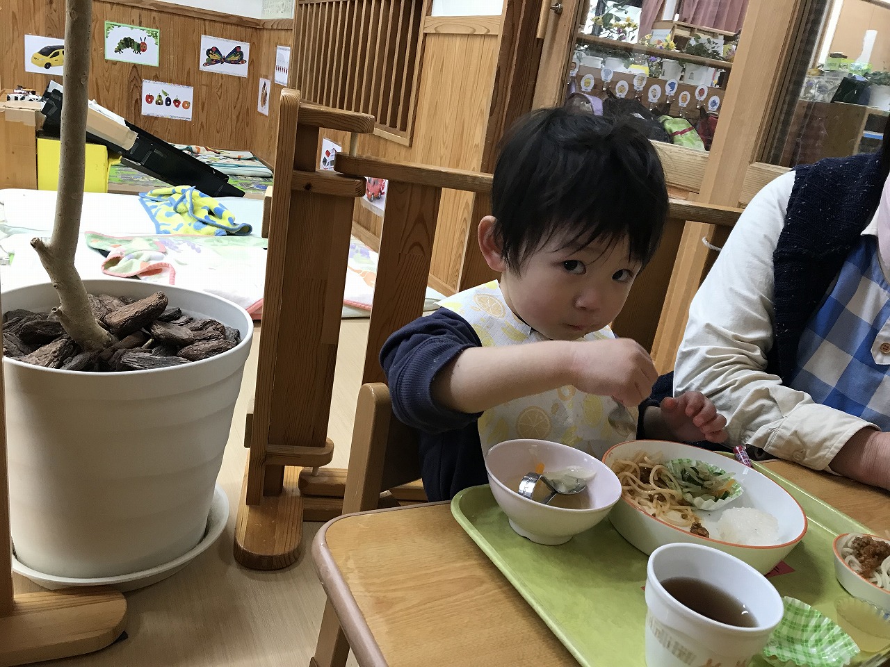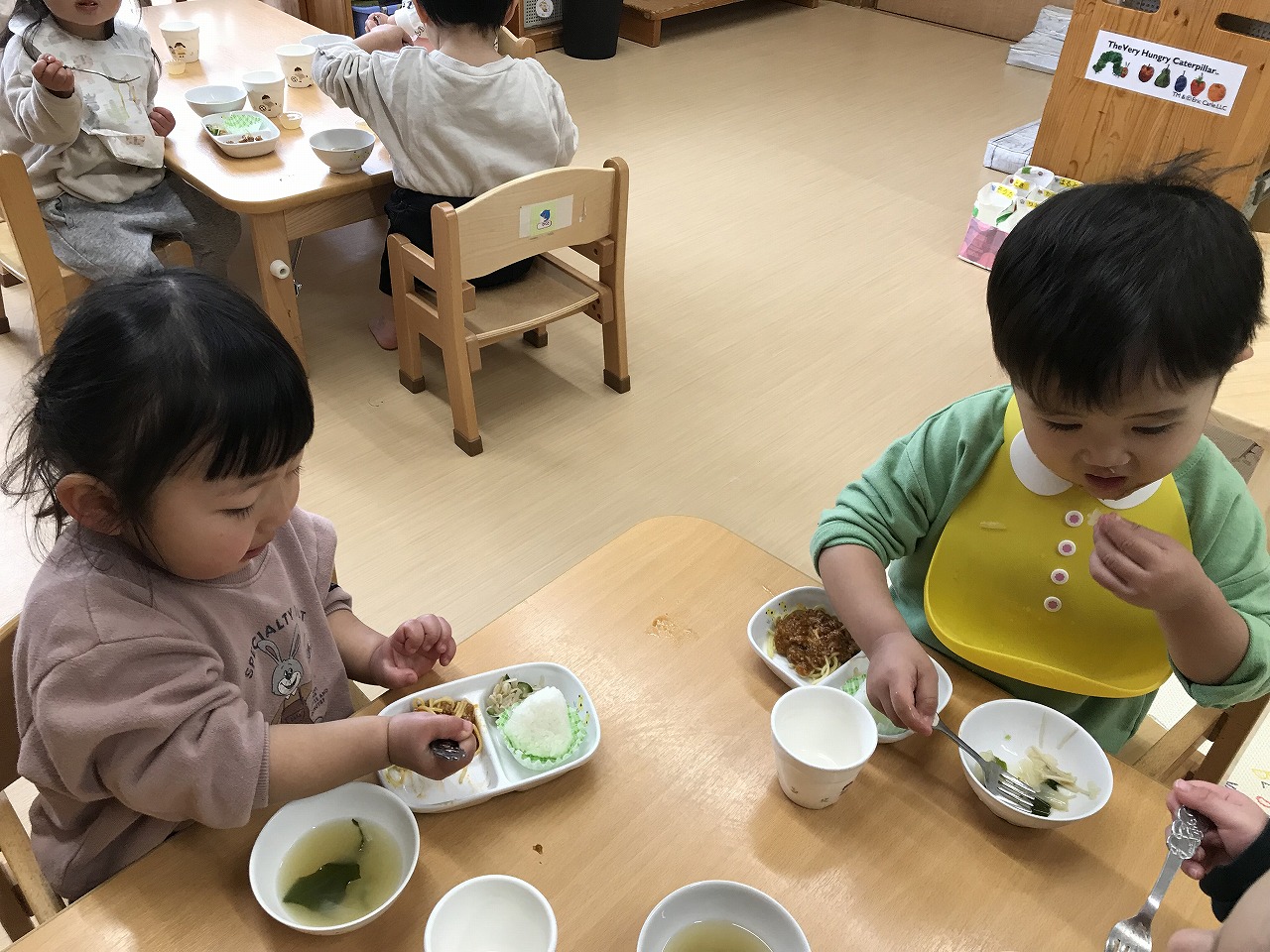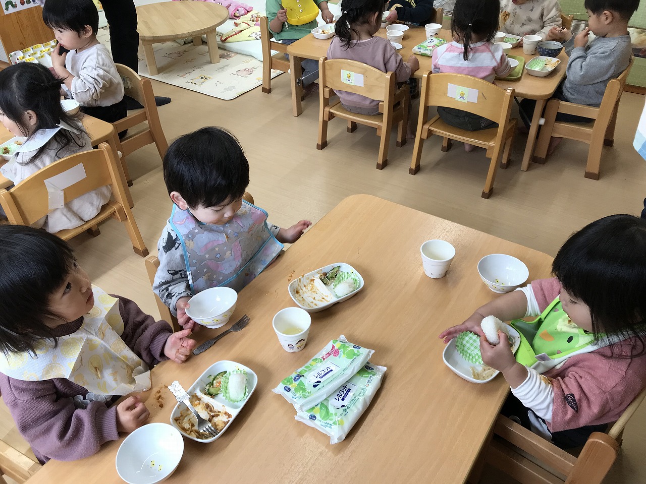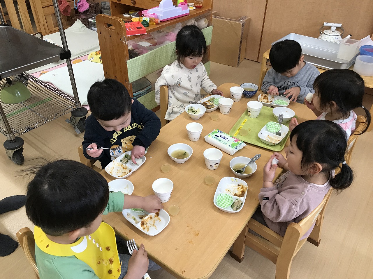 各テーブルごとに「いただきます」をして食べ始めると「見てー!お野菜食べれるよー」と食べて見せてくれたり、「これなにかな?」とお友達と話しながら楽しそうに食べている姿がたくさん見られます。フォークやスプーンの持ち方や使い方も上手になってきて「見て!こうやって持ってるよ」っと下から握っているのを見せてくれる子や器を持ち食べている子など食べるのが日に日に上手になってきているすみれ組(1歳児)さんです。