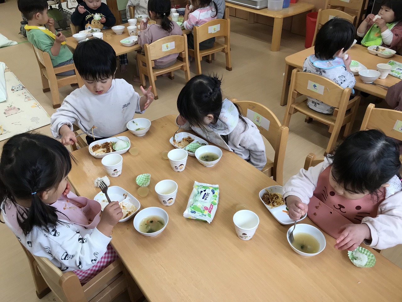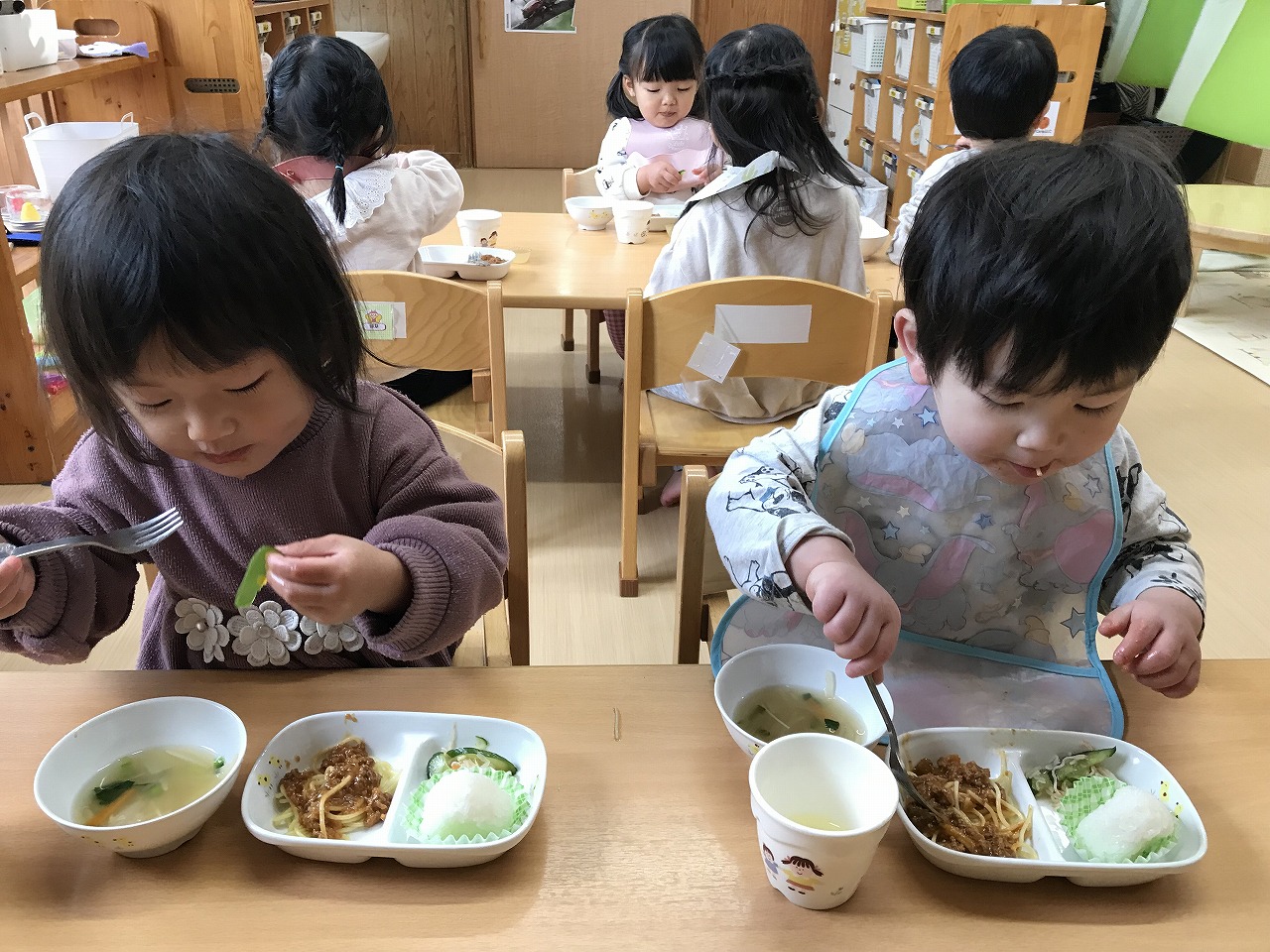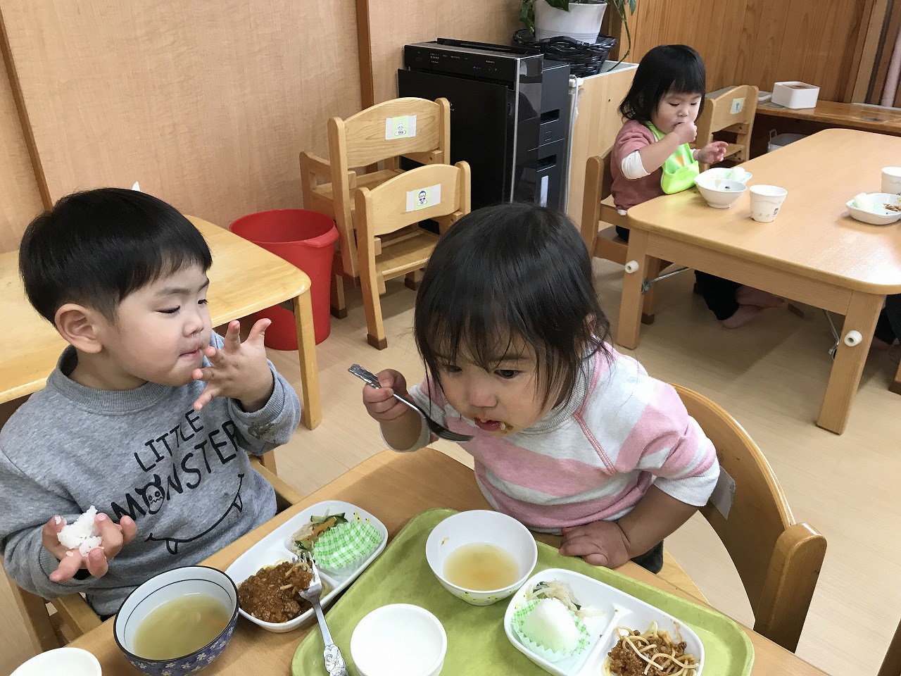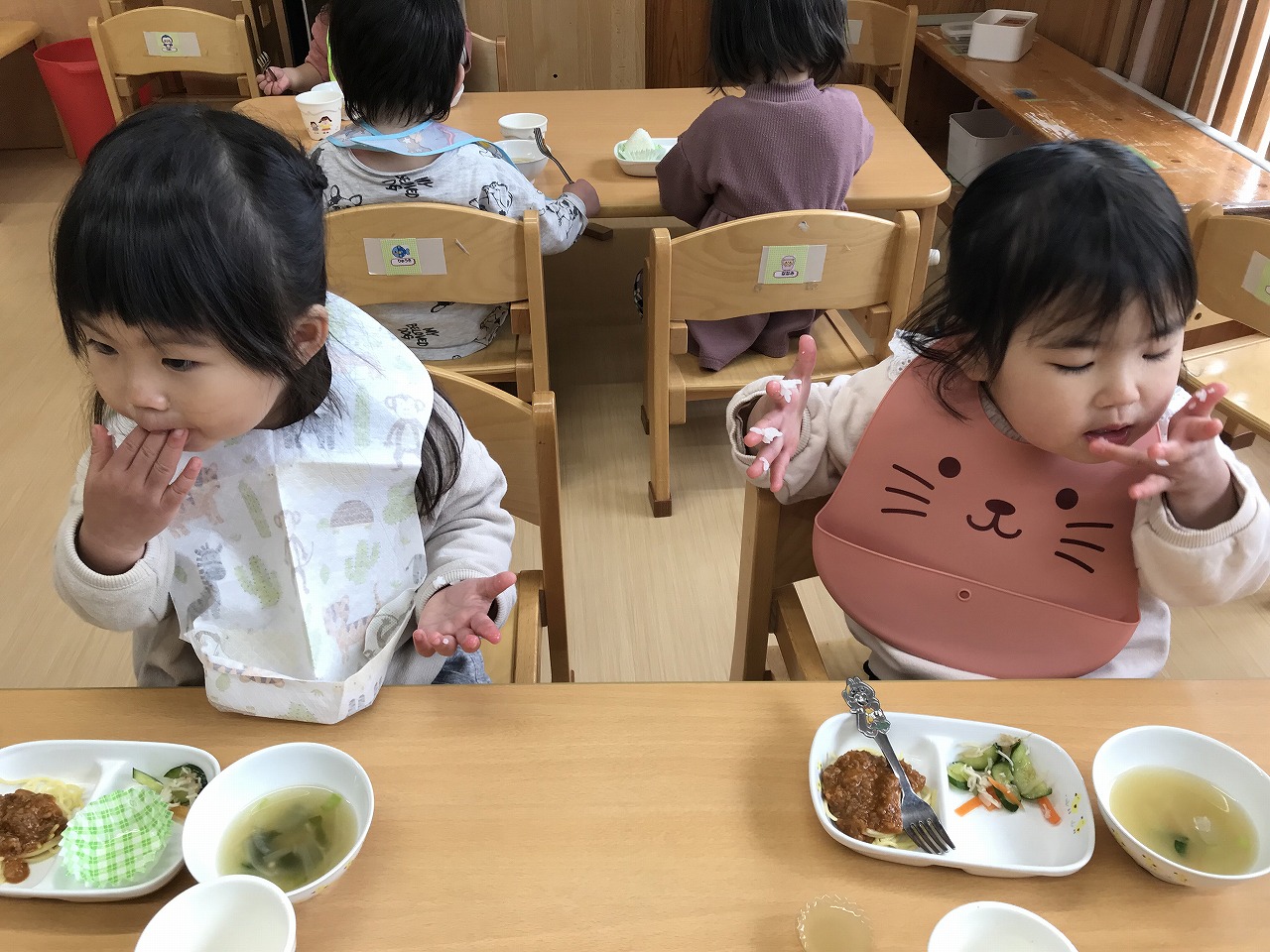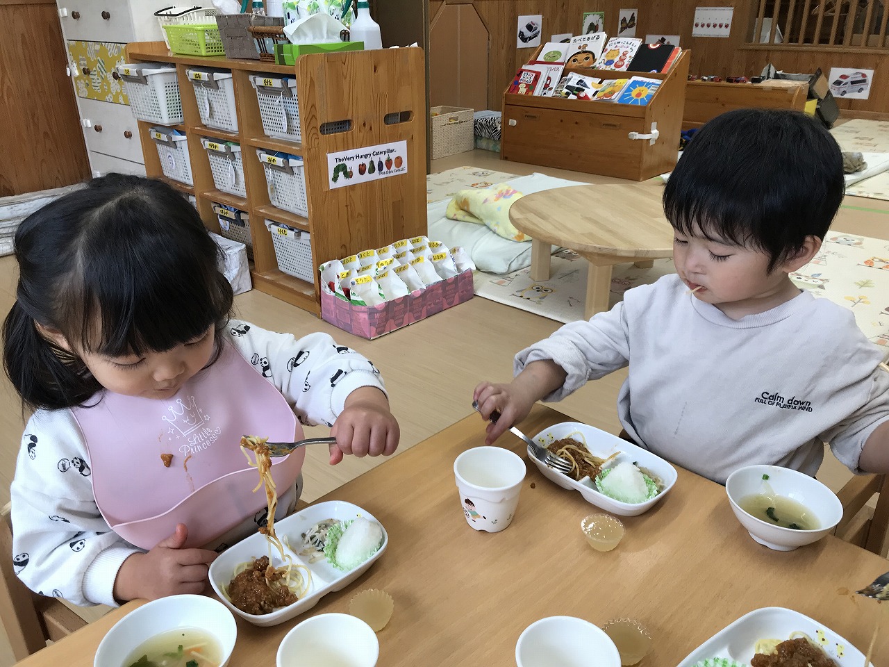 各テーブルごとに「いただきます」をして食べ始めると「見てー!お野菜食べれるよー」と食べて見せてくれたり、「これなにかな?」とお友達と話しながら楽しそうに食べている姿がたくさん見られます。フォークやスプーンの持ち方や使い方も上手になってきて「見て!こうやって持ってるよ」っと下から握っているのを見せてくれる子や器を持ち食べている子など食べるのが日に日に上手になってきているすみれ組(1歳児)さんです。