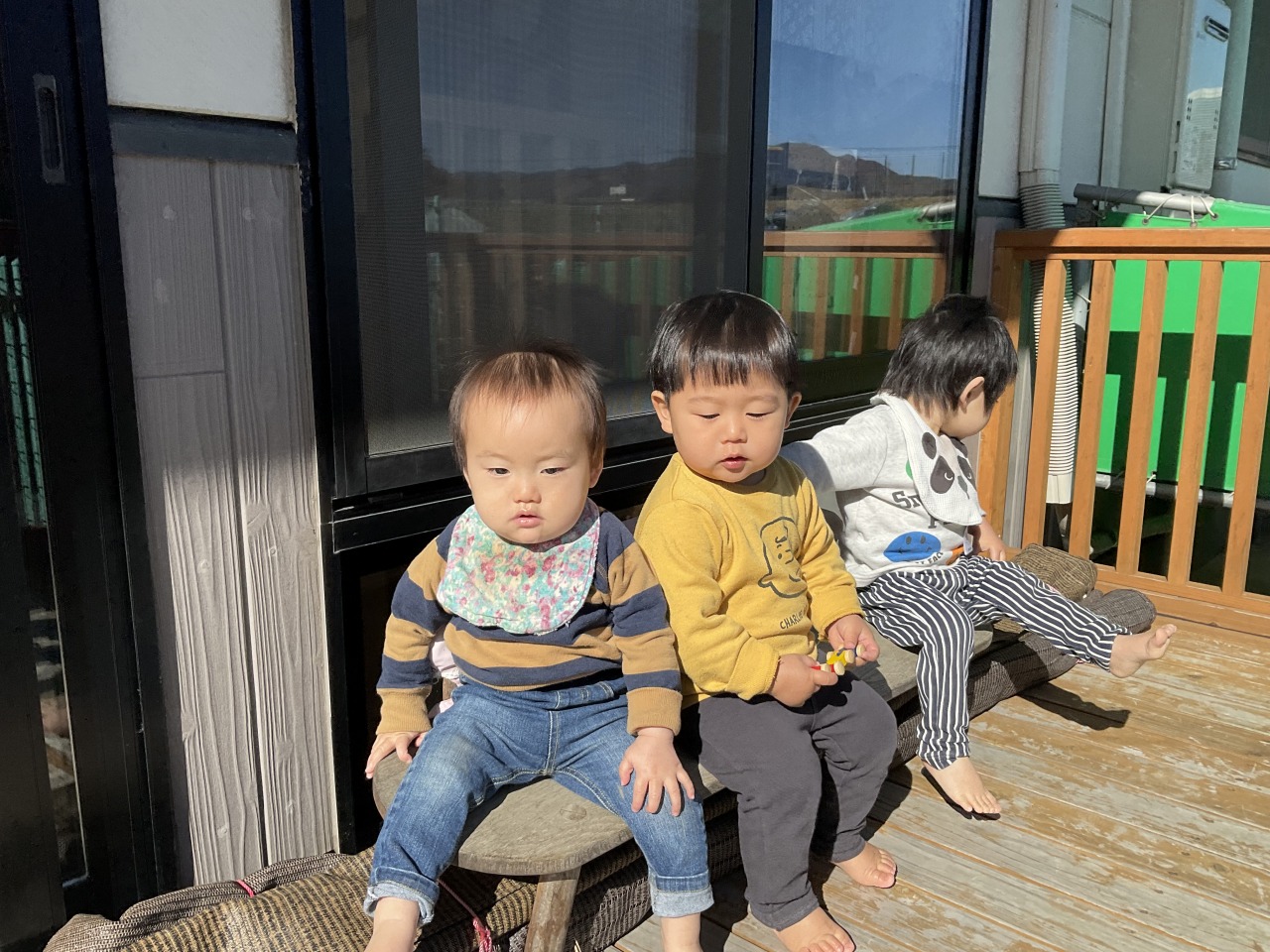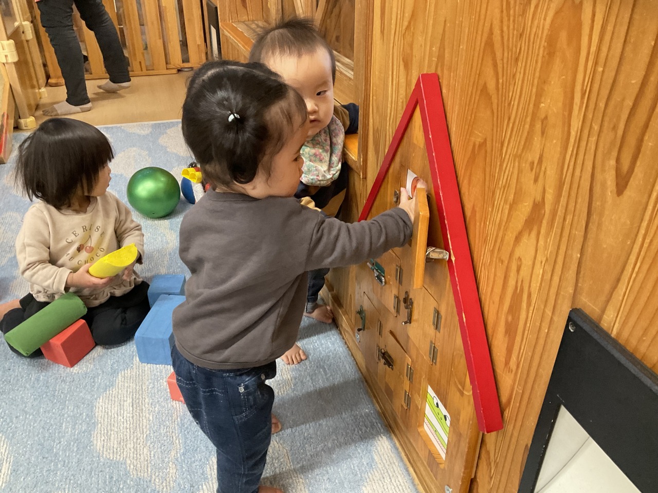 お部屋で過ごした子どもは少しテラスに出て外気浴をして気分転換をしたり、リトルジムでお友だちと「ばあ!」と顔を出して遊んだりしていました。室内でも身体を動かして遊べるようにしていきたいです。
