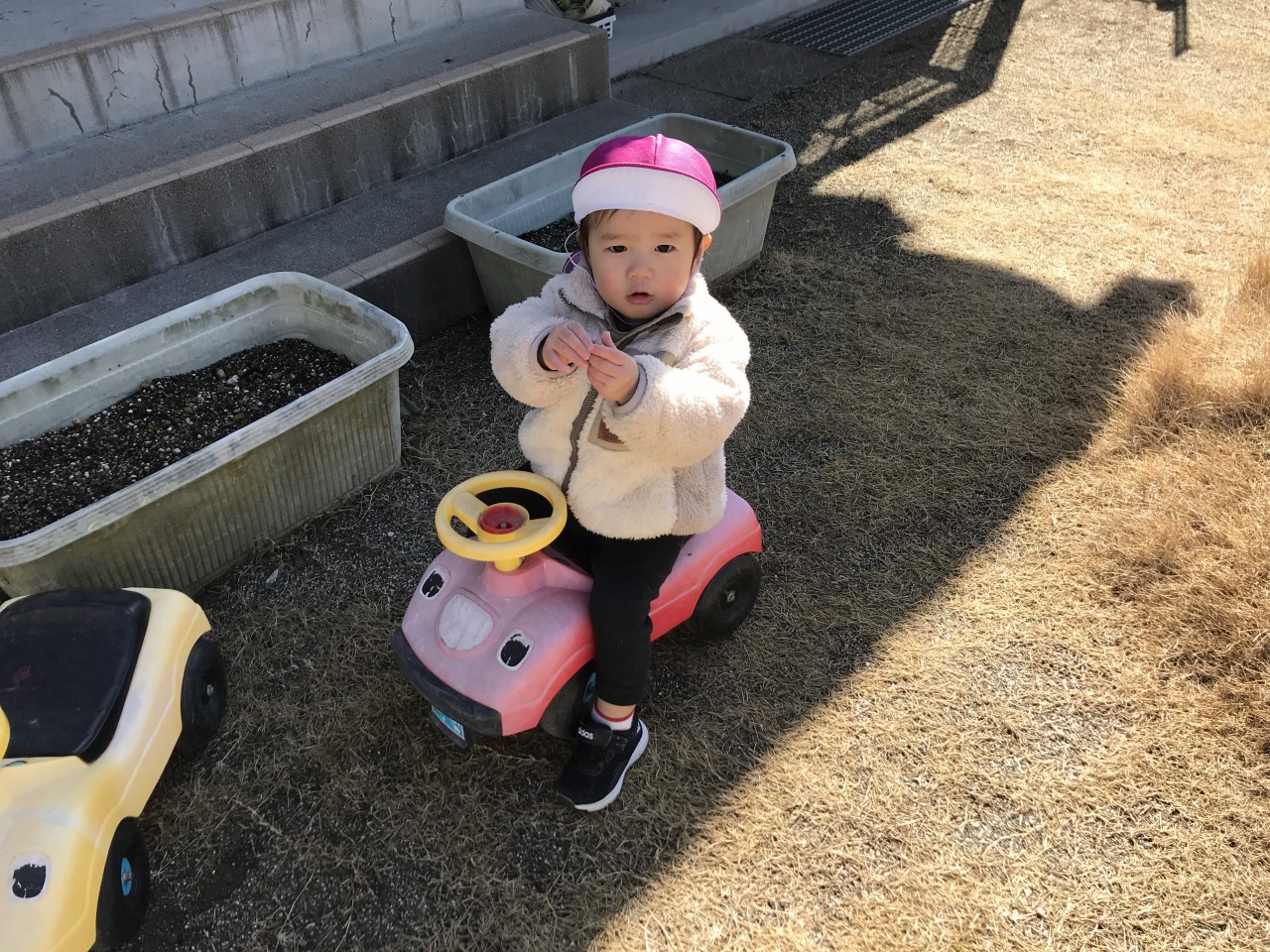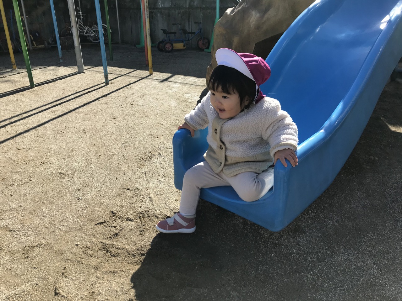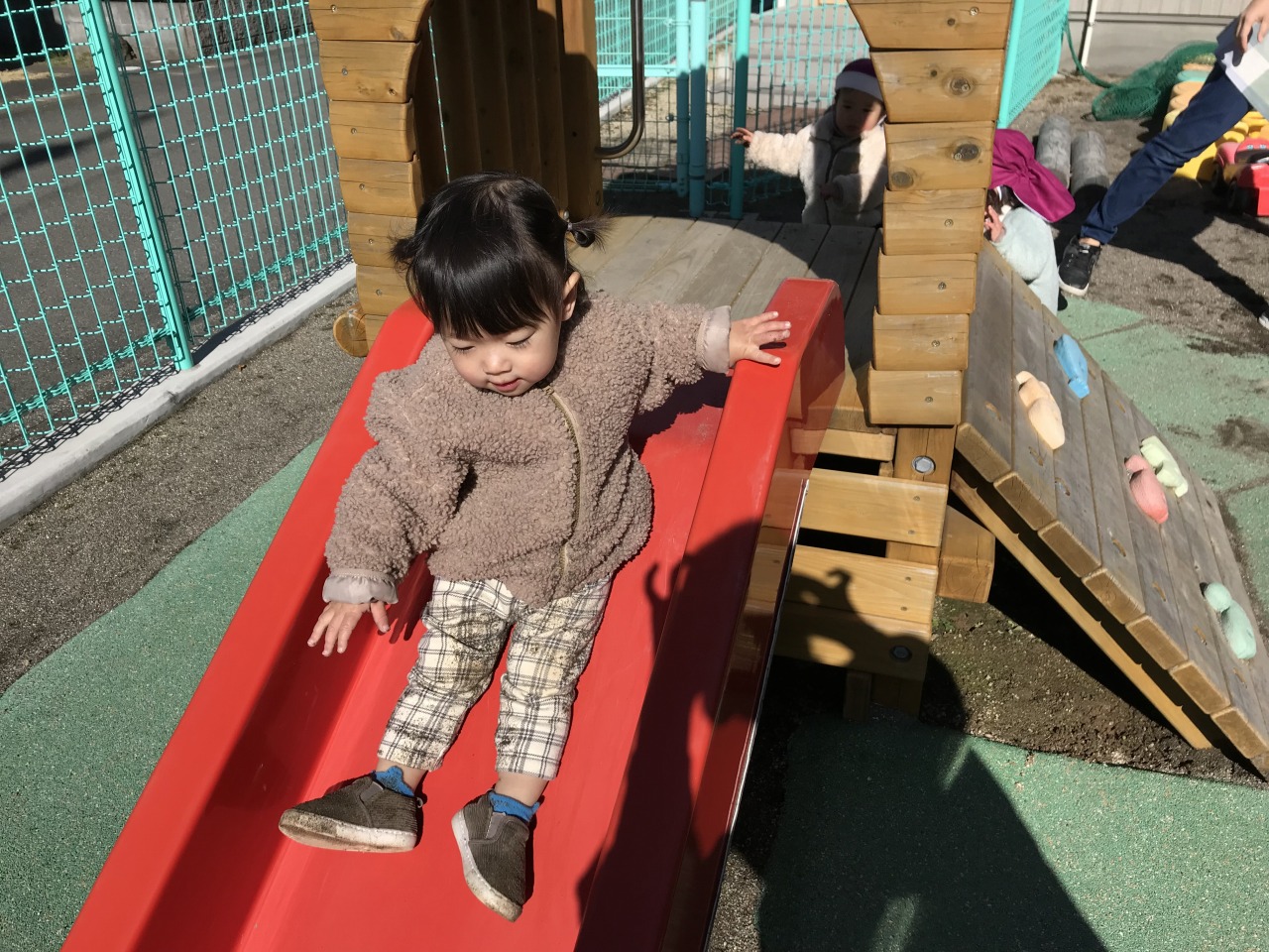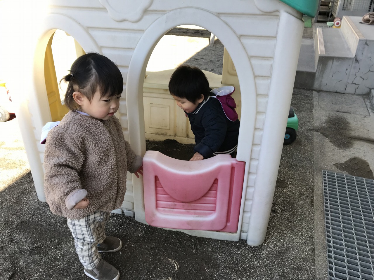 ひよこ組(0歳児)は戸外で遊びました。自分の身の回りのことに興味を持っているので、帽子や靴下を自分の入れ物から取り出したり、保育士等と一緒に上着や靴を履いたりと戸外に行く準備を積極的にしている子ども達です。月齢が高いお友達は園庭で遊び、月齢が低いお友達は裏庭で遊びました。園庭で遊んだお友達は初めての遊具ばかりで遊び方が分からない様子でしたが、保育士等が遊び方を伝えながら一緒に遊ぶと滑り台を滑ったり三輪車に乗ったりして遊んでいました。裏庭で遊んだお友達も小さい家の中に入って遊んだり、車に乗って遊んだりと楽しく全身を動かして遊んでいました。寒い日が続きますが、天気が良い日は戸外に出て身体を動かして遊べるようにしていきたいと思います。