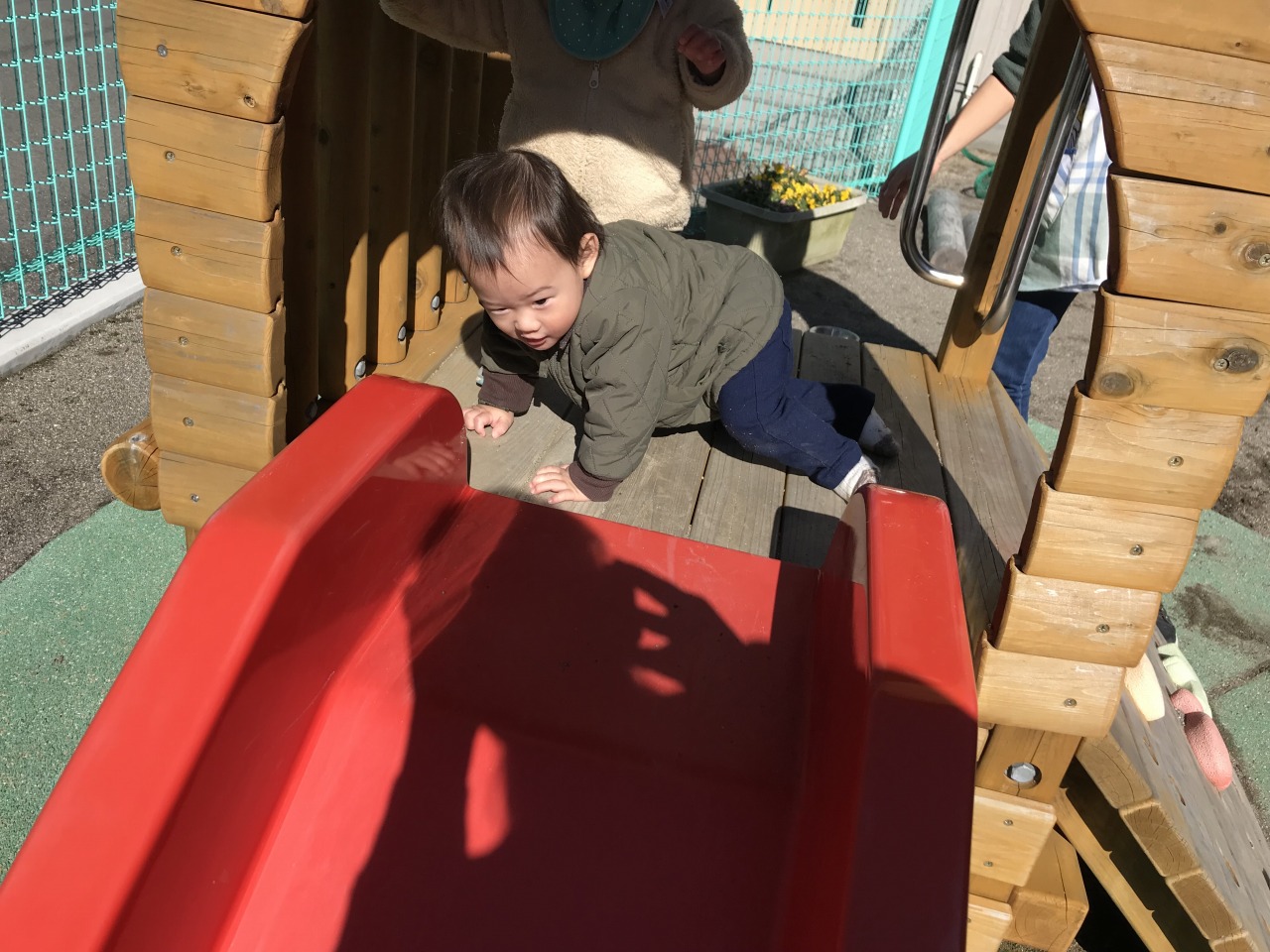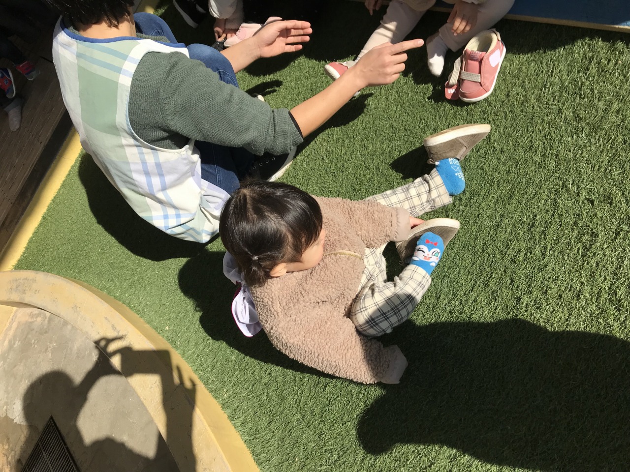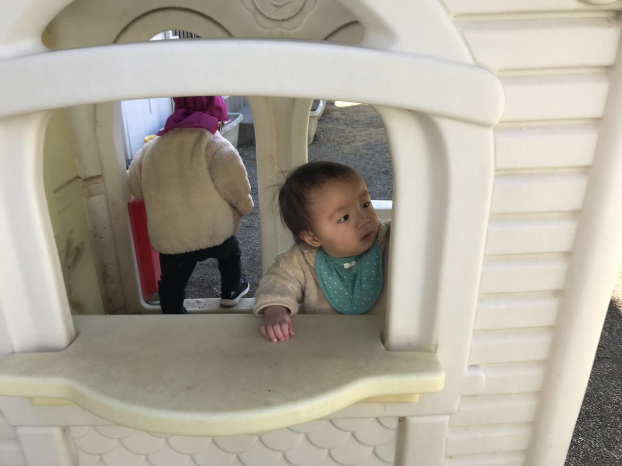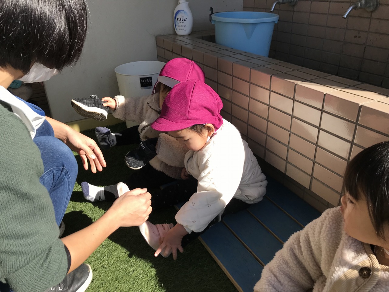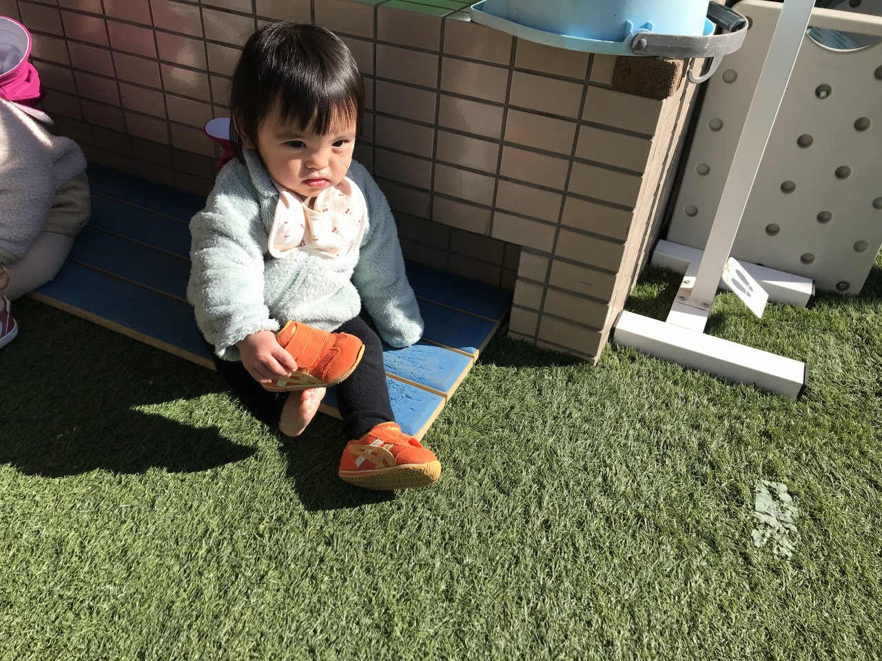 ひよこ組(0歳児)は戸外で遊びました。自分の身の回りのことに興味を持っているので、帽子や靴下を自分の入れ物から取り出したり、保育士等と一緒に上着や靴を履いたりと戸外に行く準備を積極的にしている子ども達です。月齢が高いお友達は園庭で遊び、月齢が低いお友達は裏庭で遊びました。園庭で遊んだお友達は初めての遊具ばかりで遊び方が分からない様子でしたが、保育士等が遊び方を伝えながら一緒に遊ぶと滑り台を滑ったり三輪車に乗ったりして遊んでいました。裏庭で遊んだお友達も小さい家の中に入って遊んだり、車に乗って遊んだりと楽しく全身を動かして遊んでいました。寒い日が続きますが、天気が良い日は戸外に出て身体を動かして遊べるようにしていきたいと思います。