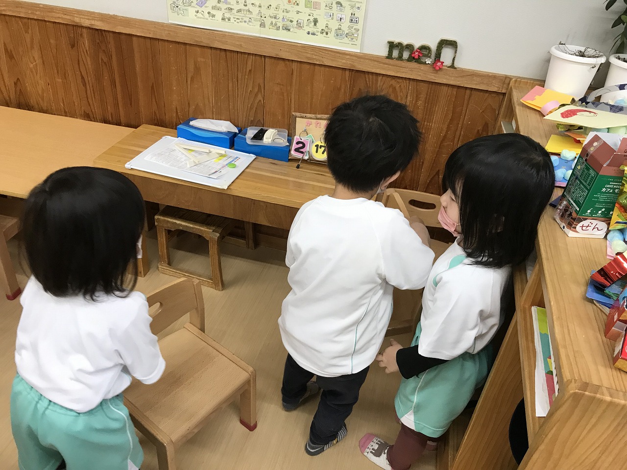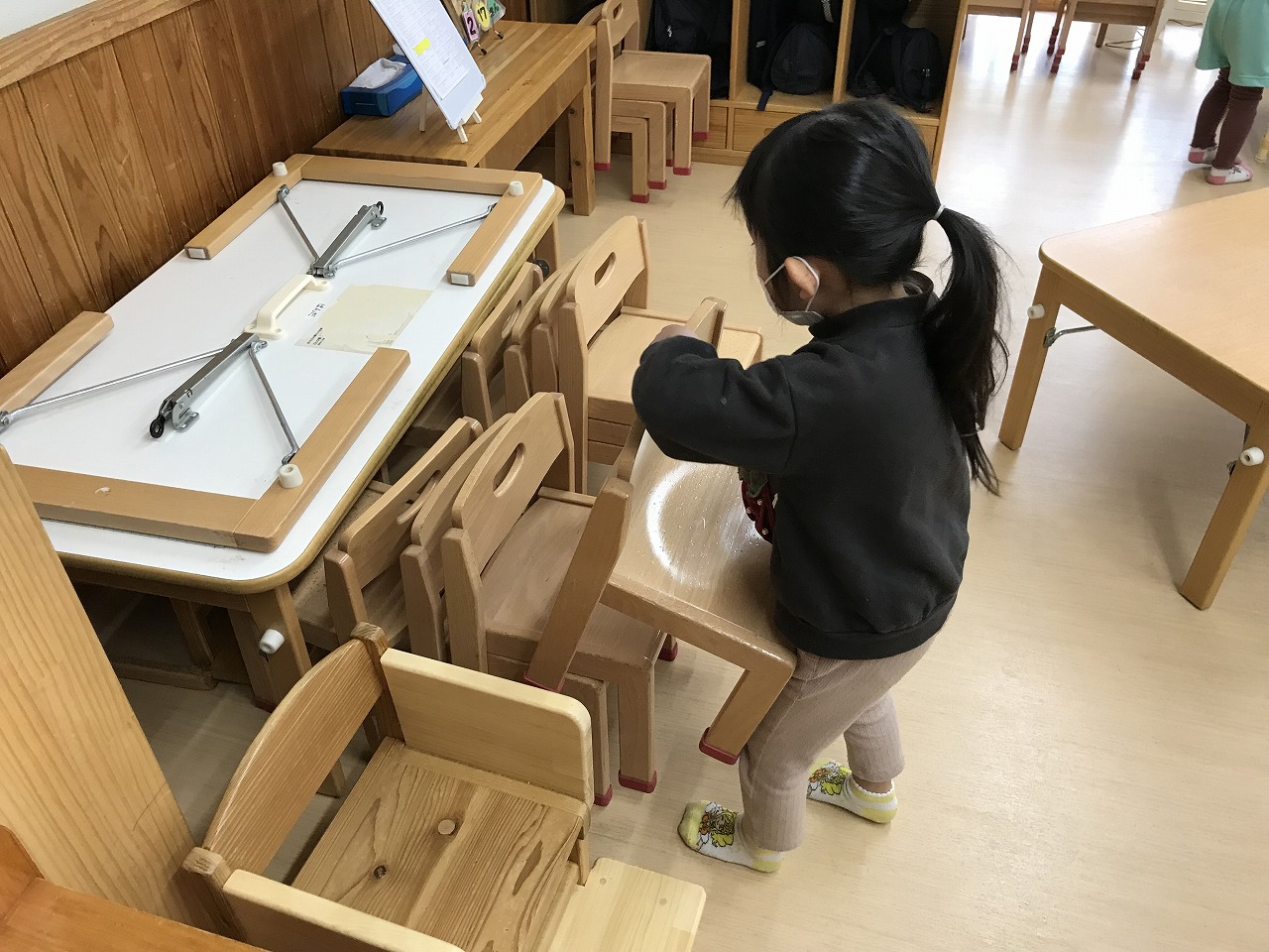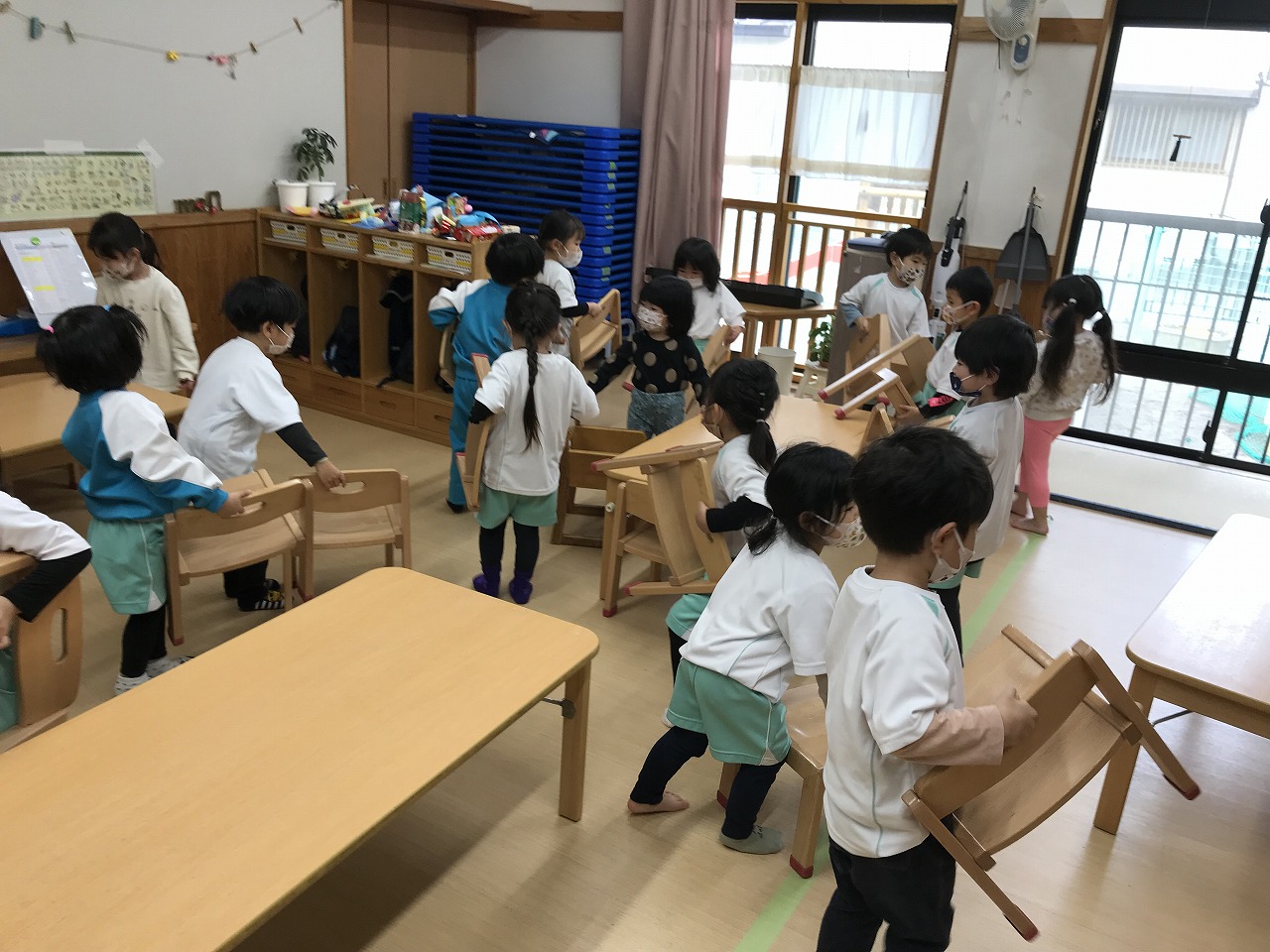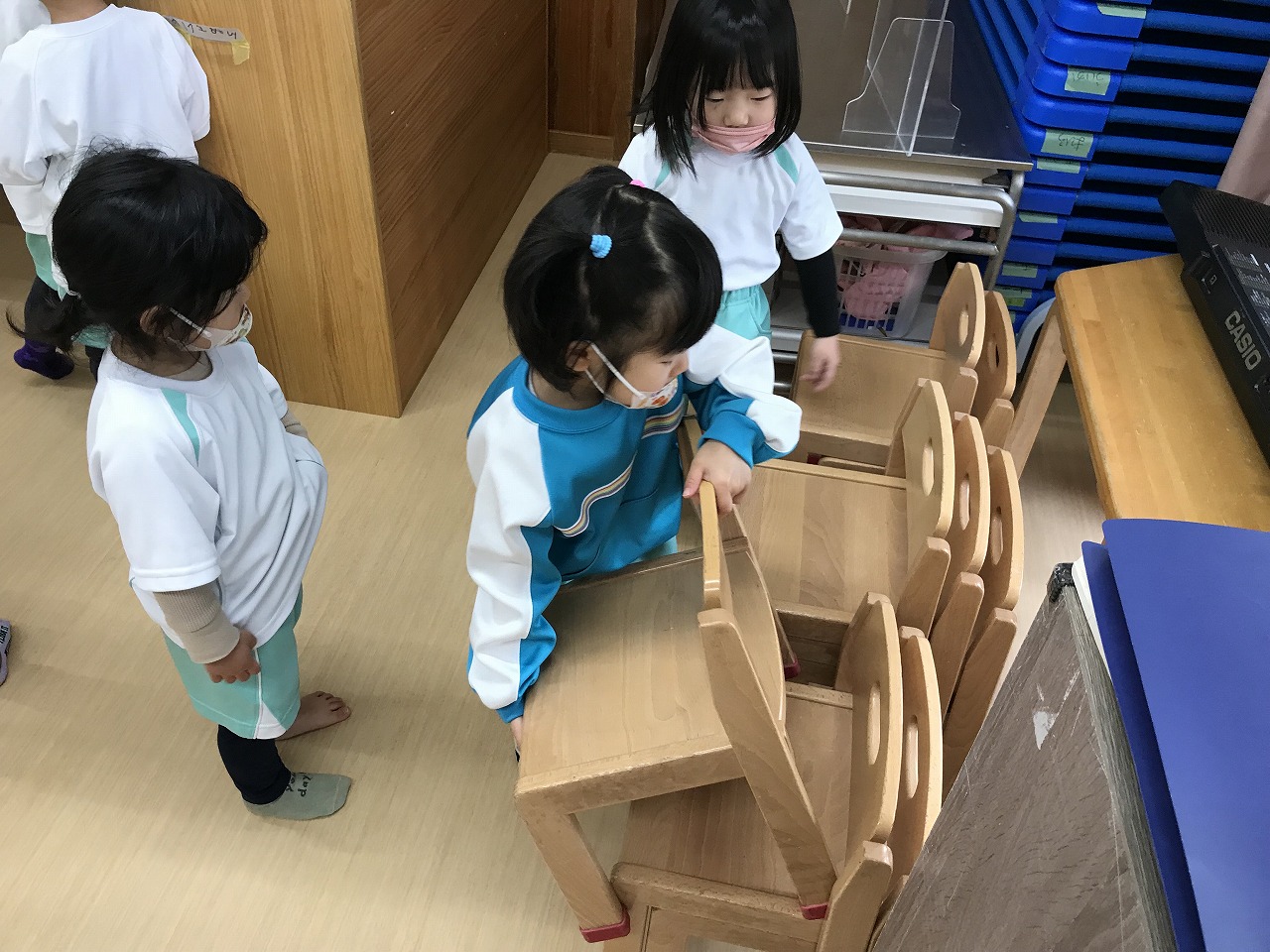 うめ組(3歳児)は、体操教室の準備もだんだん自分達で出来るようになりました。部屋を広くするために椅子を運んだり、また椅子も3つまで重ねることを考えながら
