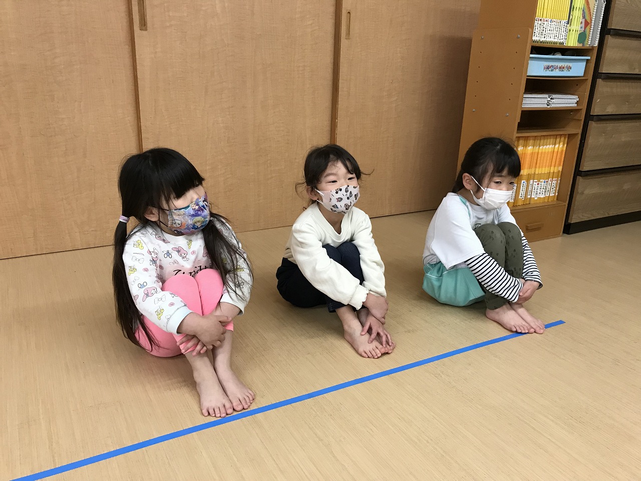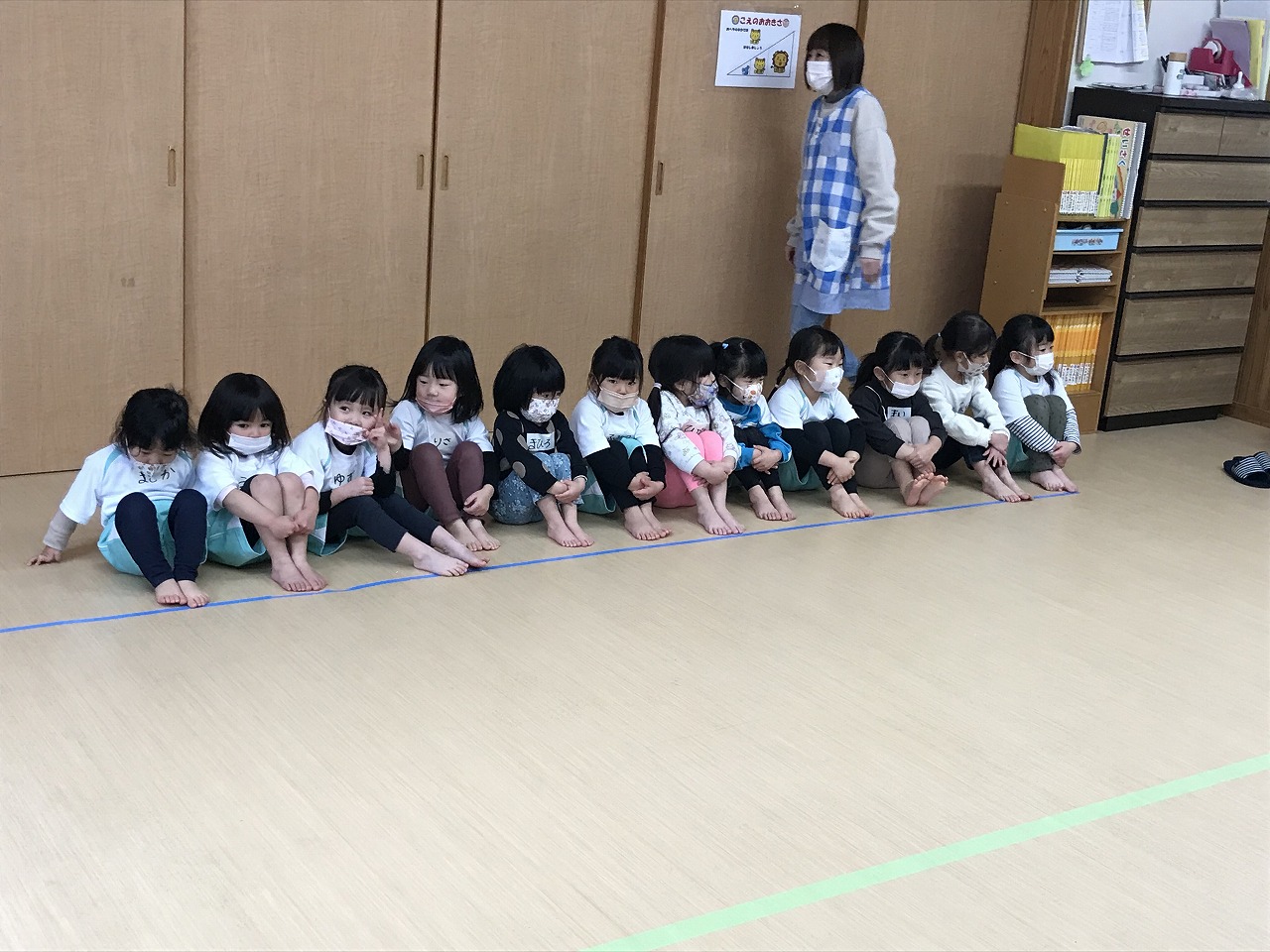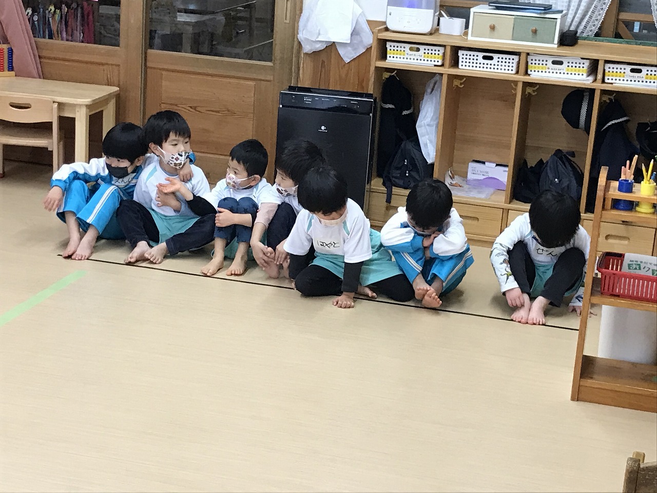 協力して動かしていました。滑るので靴下を脱いだり、名前を胸に貼りますが自分の名前も探せるようになった子もいます。終わった子から格好よく体操座りで待っていました。