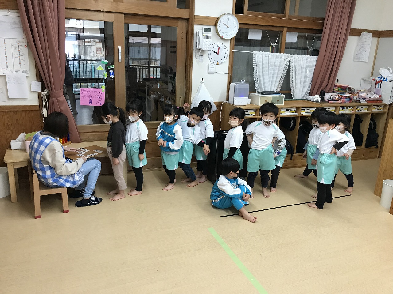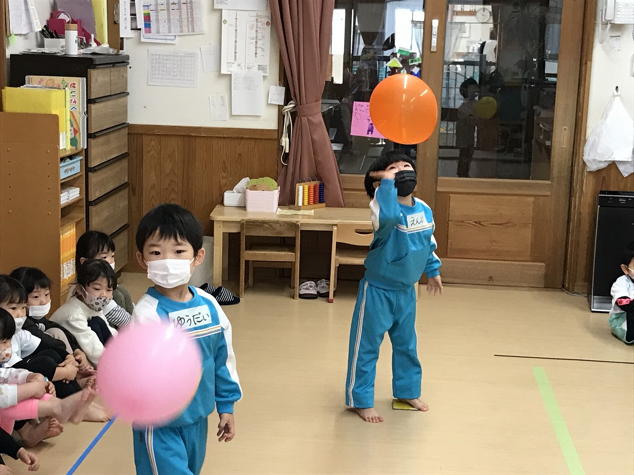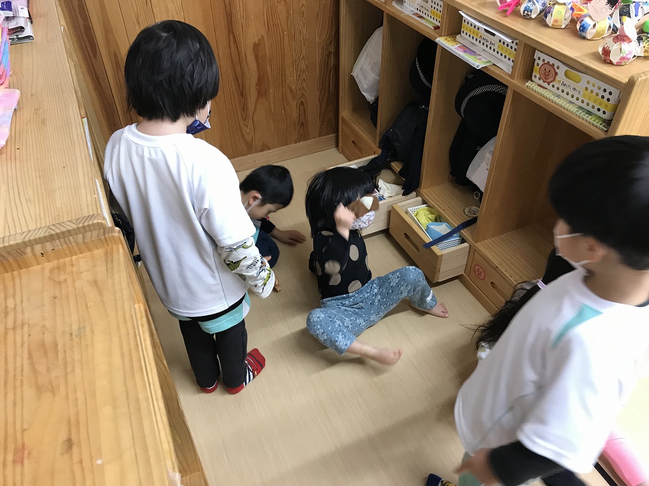 協力して動かしていました。滑るので靴下を脱いだり、名前を胸に貼りますが自分の名前も探せるようになった子もいます。終わった子から格好よく体操座りで待っていました。