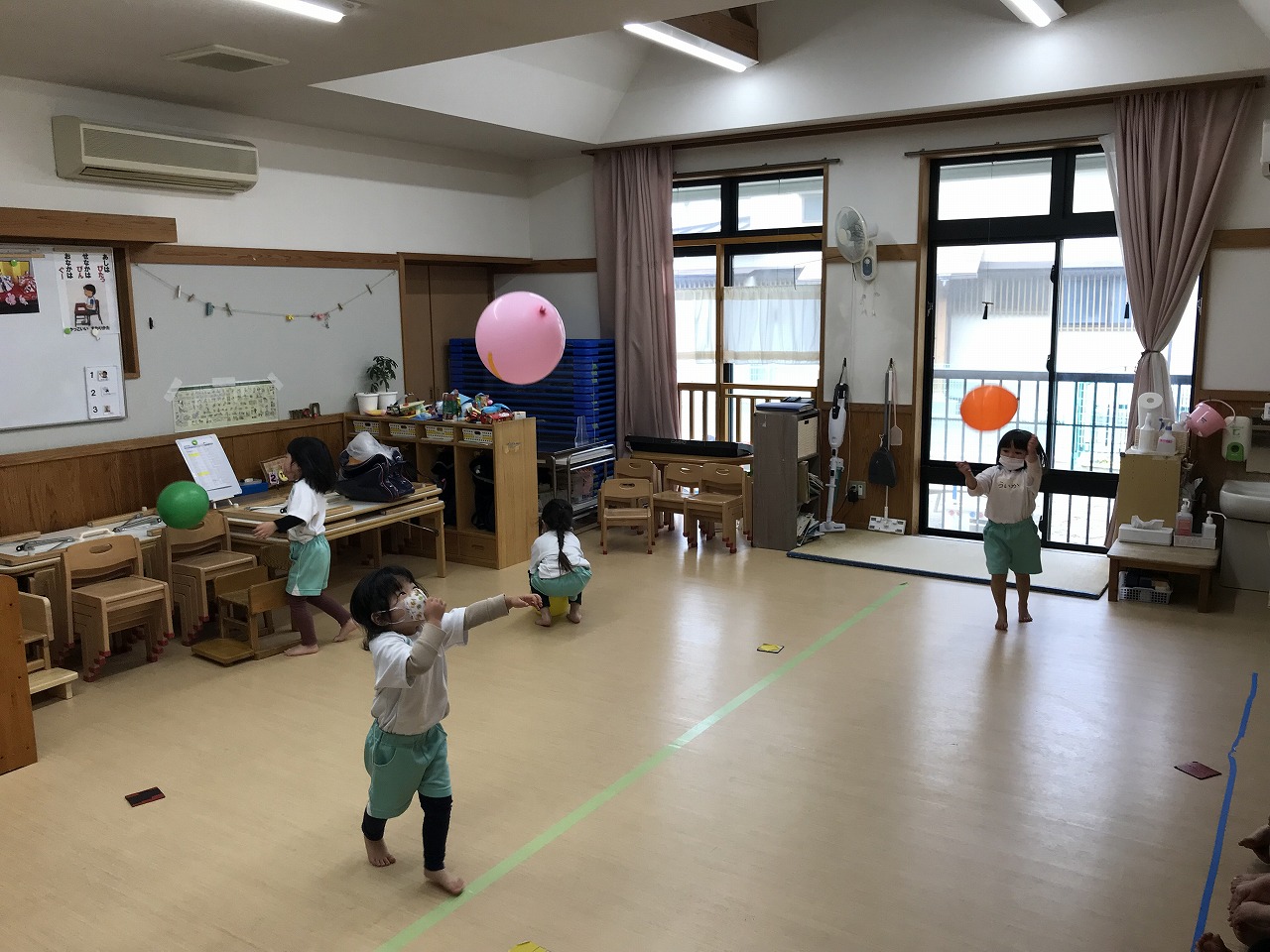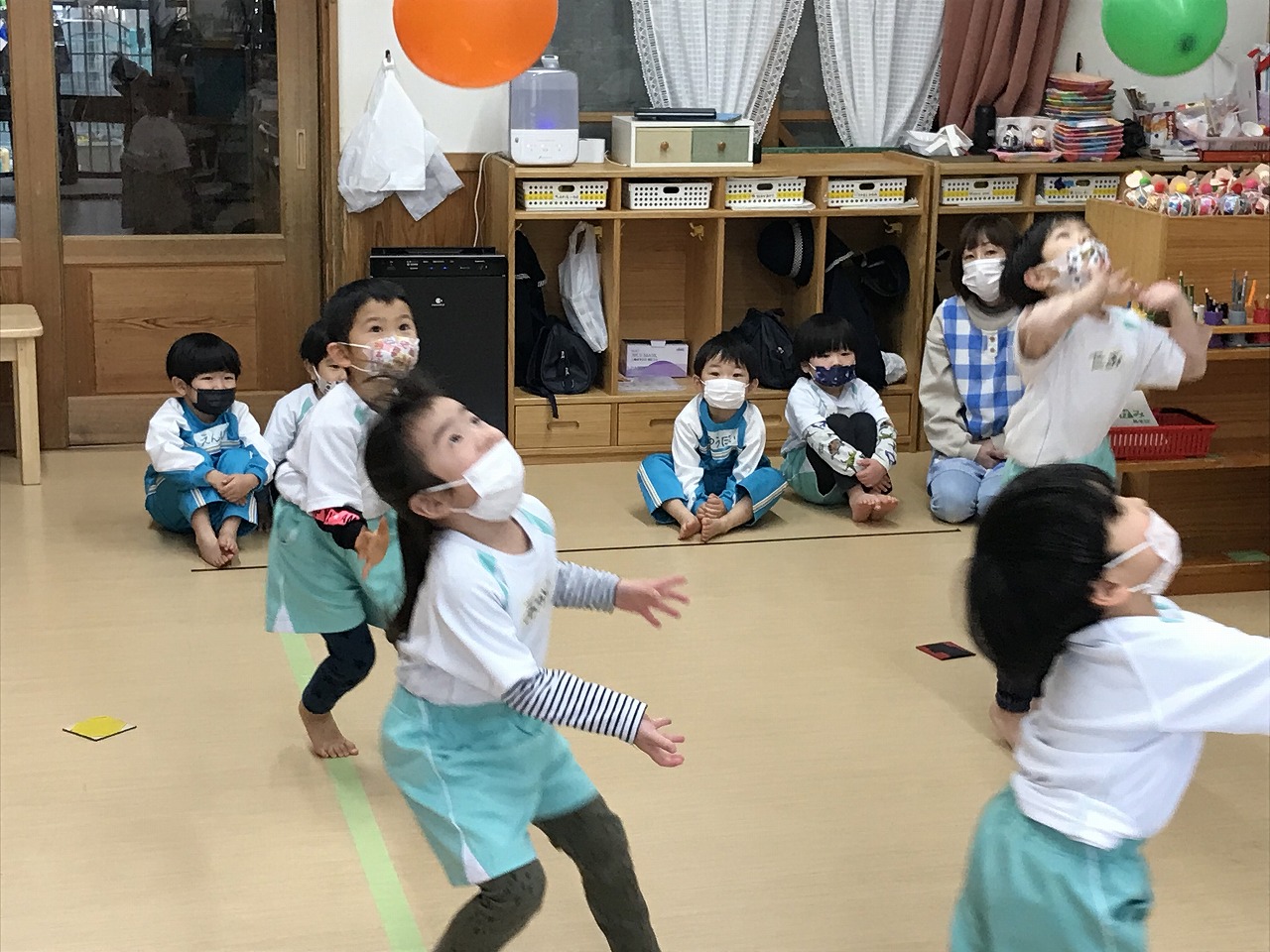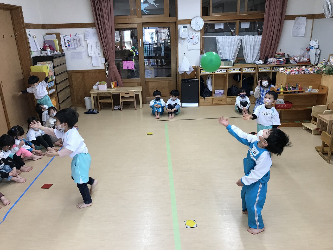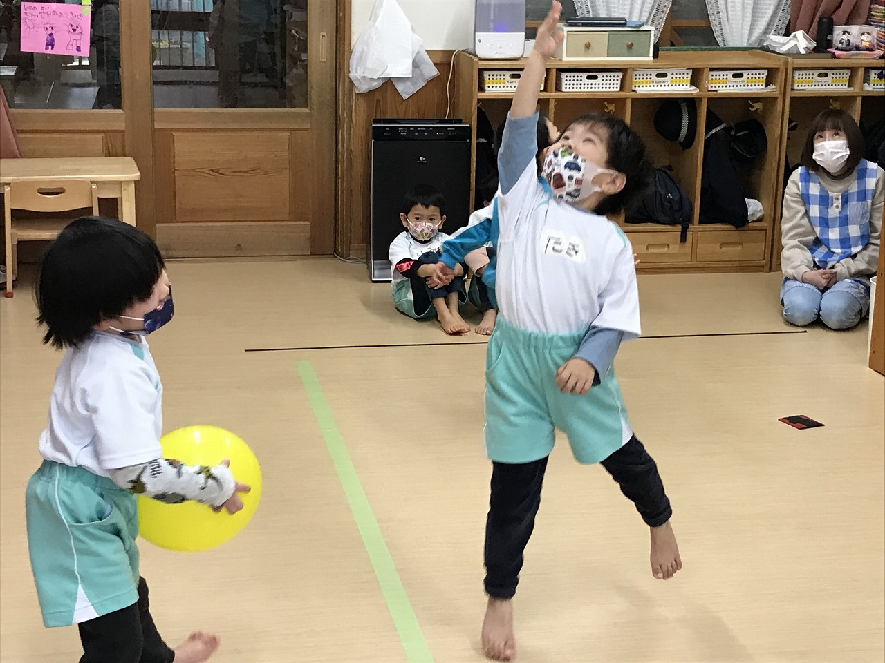 今日は風船を使って高く飛ばし、落ちないようにまた手で打って高く飛ばしました。最初は感覚のつかめなかった子も数回するうちに要領よくなり、「〇〇ちゃん、良くなったね!」と