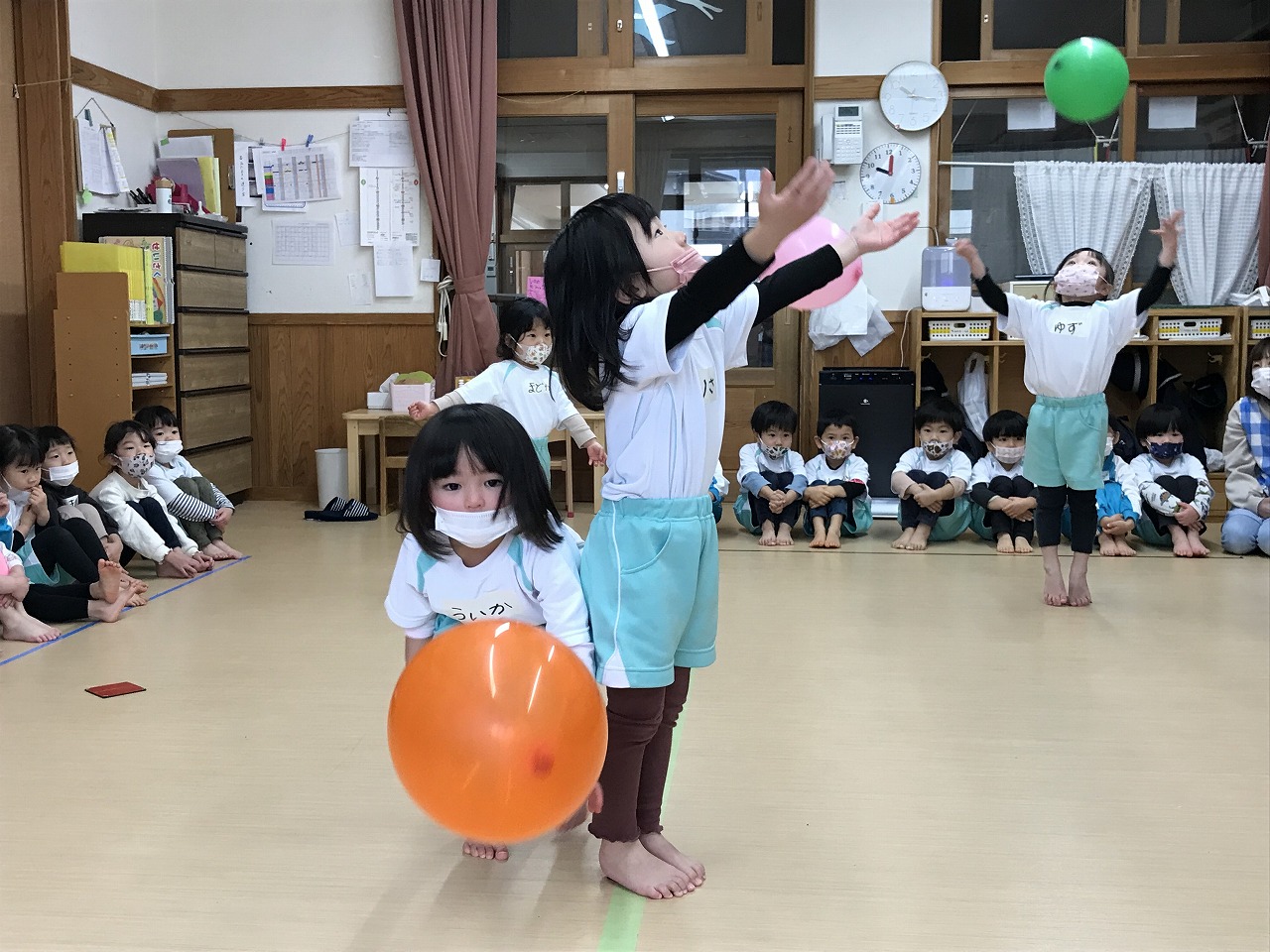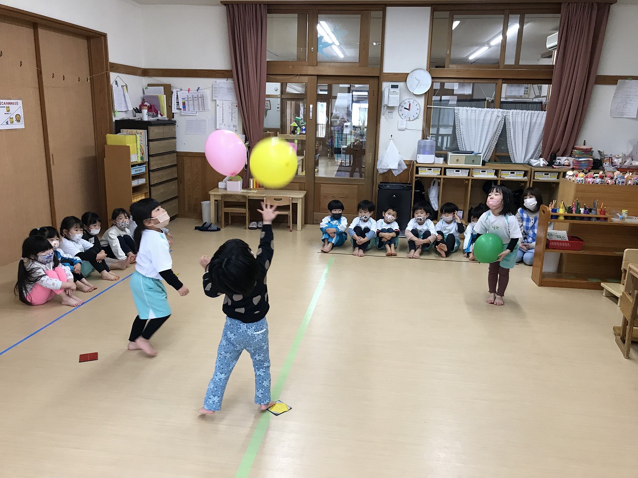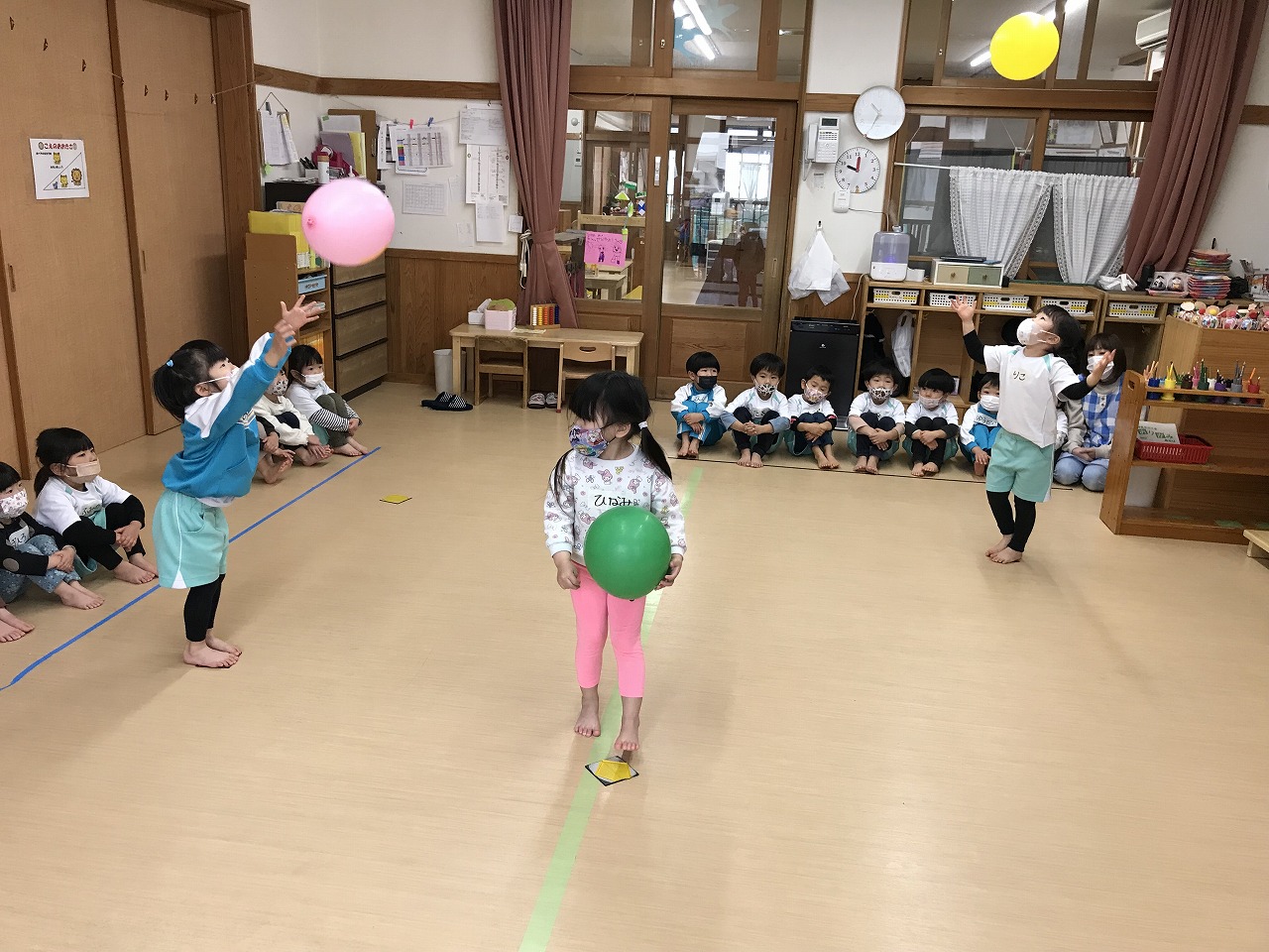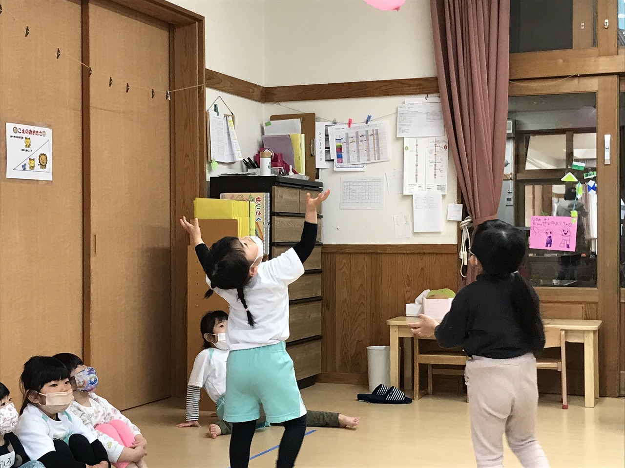 今日は風船を使って高く飛ばし、落ちないようにまた手で打って高く飛ばしました。最初は感覚のつかめなかった子も数回するうちに要領よくなり、「〇〇ちゃん、良くなったね!」と