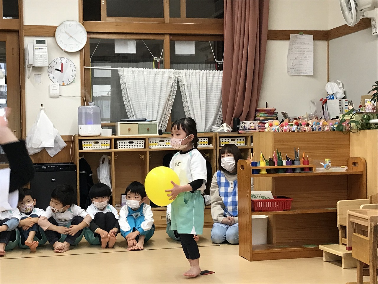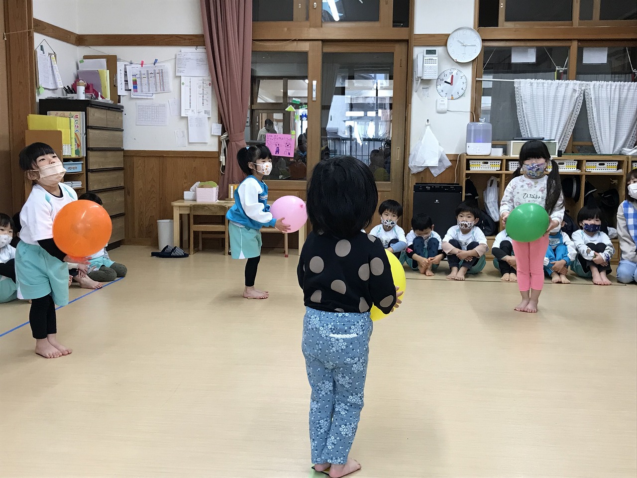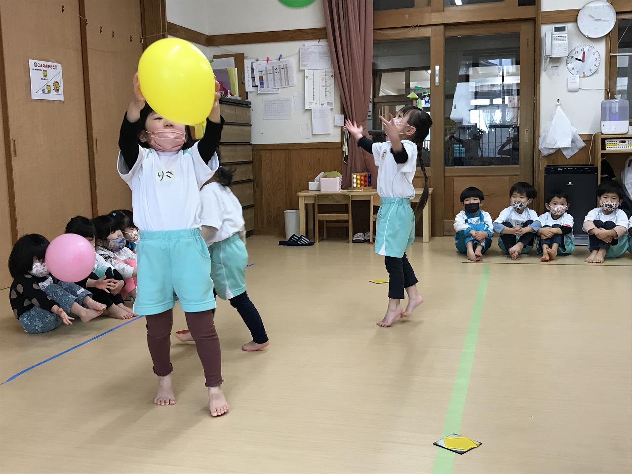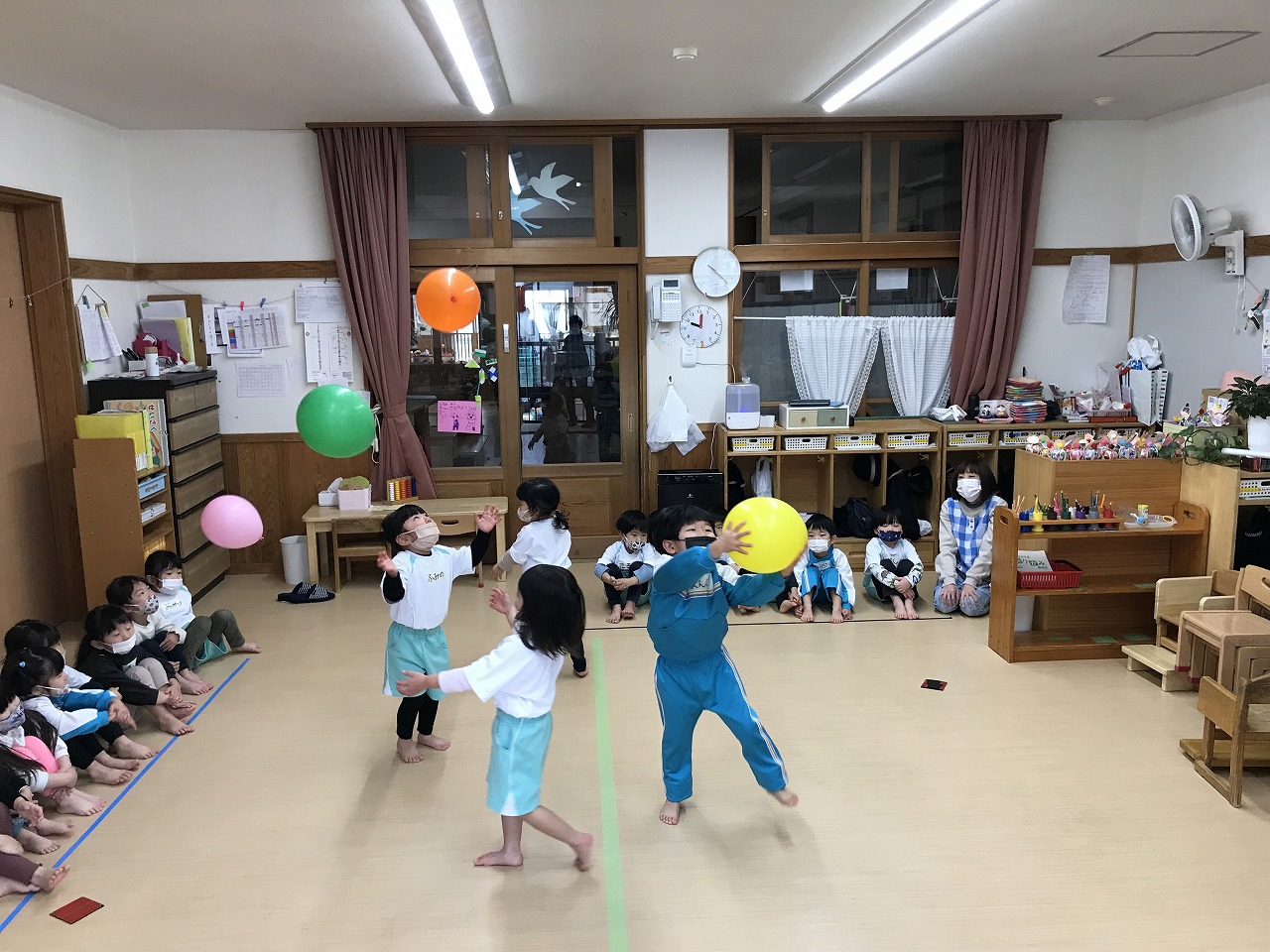 今日は風船を使って高く飛ばし、落ちないようにまた手で打って高く飛ばしました。最初は感覚のつかめなかった子も数回するうちに要領よくなり、「〇〇ちゃん、良くなったね!」と