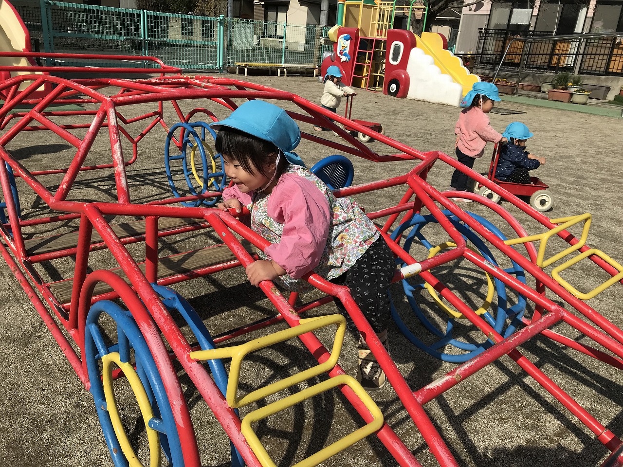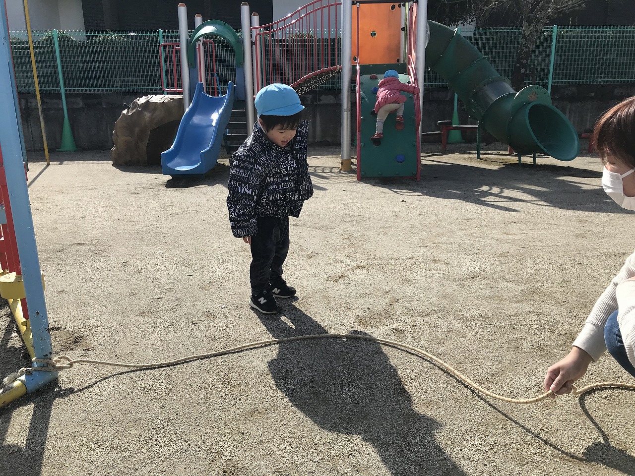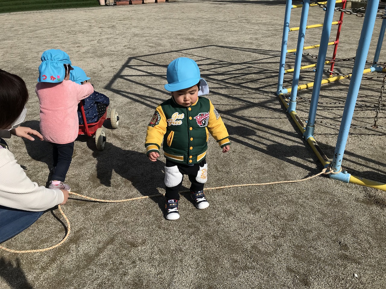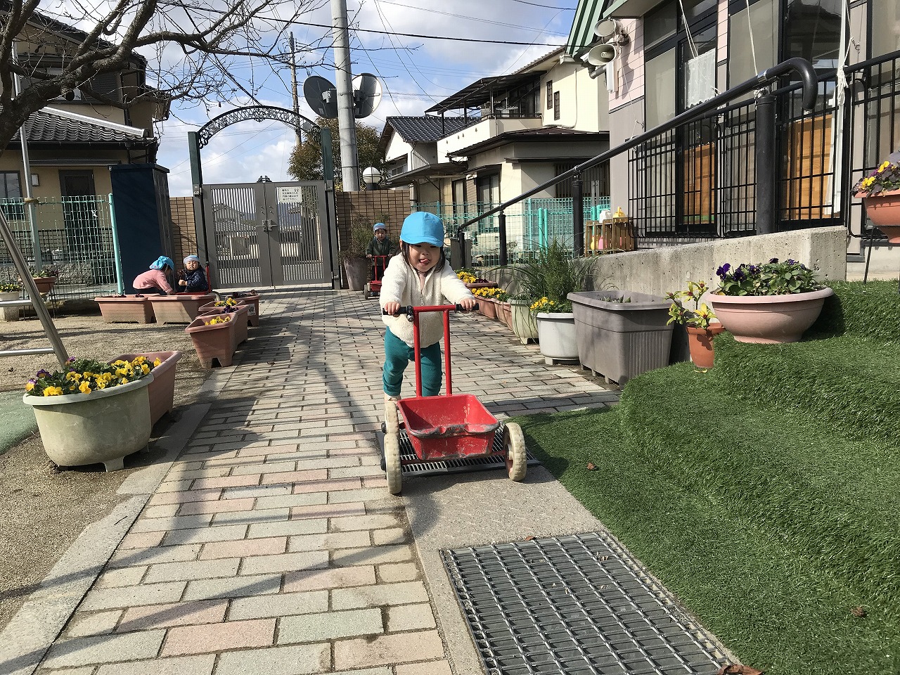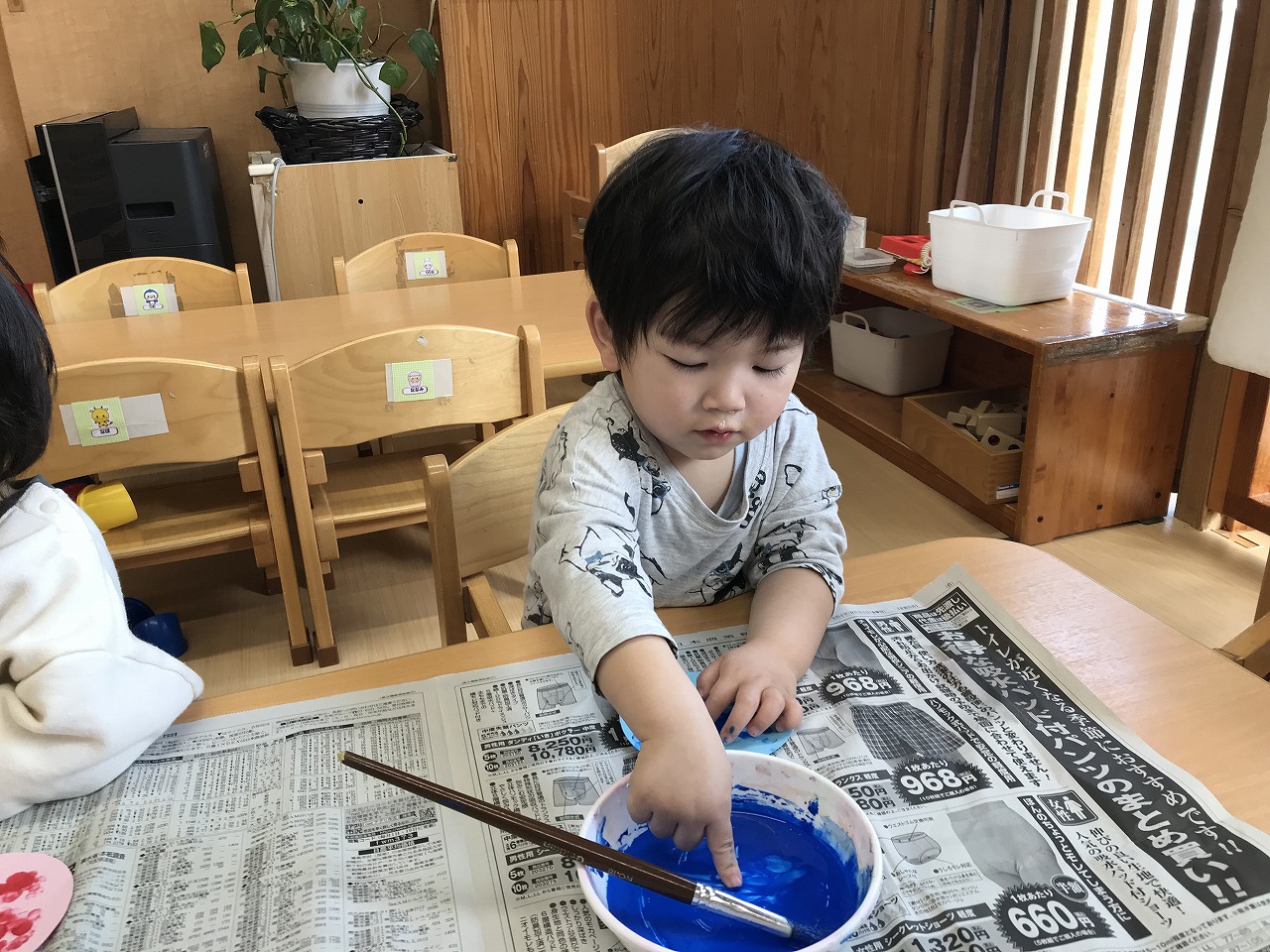 すみれ組(1歳児)は、おひなさま制作をしました。赤色、青色の絵の具を使って指スタンプで、おだいりさま、おひなさまの着物の柄をつけました。ポンポンと楽しそうにスタンプしていました。子どもたちは、次回も制作の続きをするのを楽しみにしているようです。その後、ぽかぽか陽気の園庭に出て、それぞれ好きな遊びを楽しむ姿が見られました。すべり台を滑ったり、スーパーカーに登ったり、三輪車にまたがったり、縄の上を飛び越したり、お友達と仲良くポーターを押しあったりしていました。日に日に暖かくなり、子どもたちにとっても遊びやすい季節になってきています。これから、もっともっとたくさん戸外遊びを楽しみたいと思います。