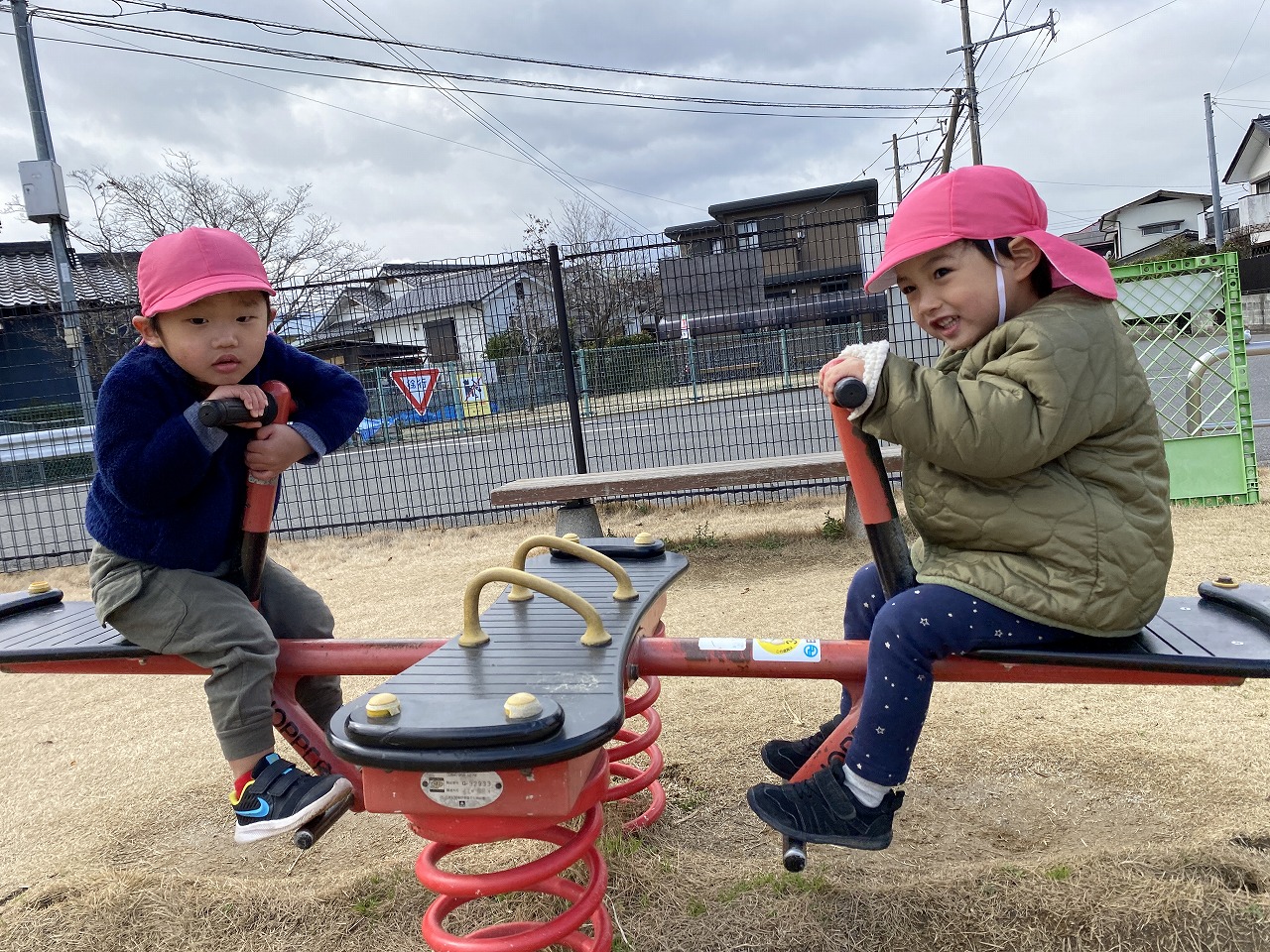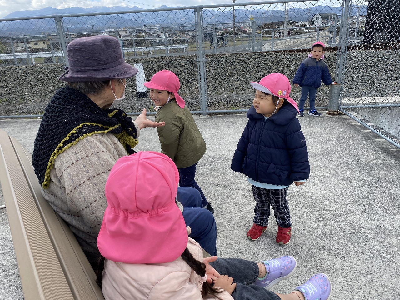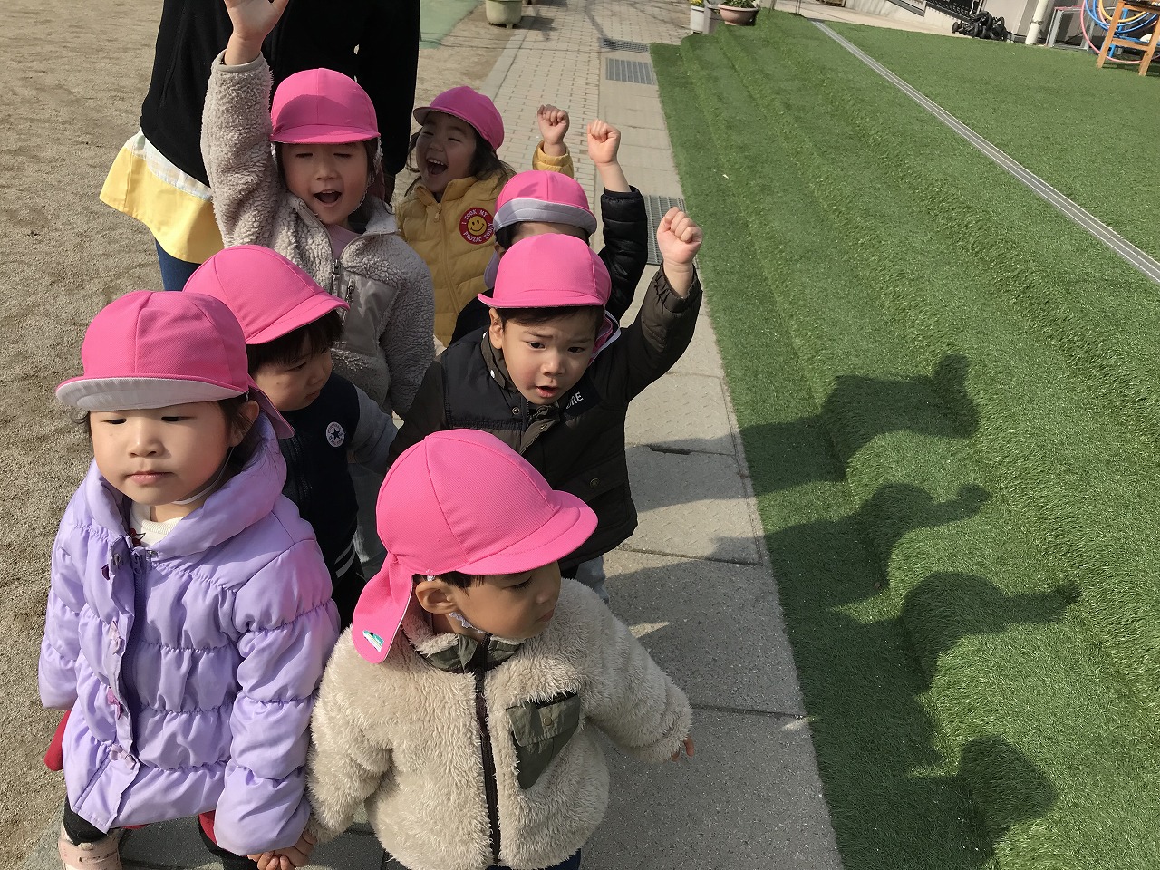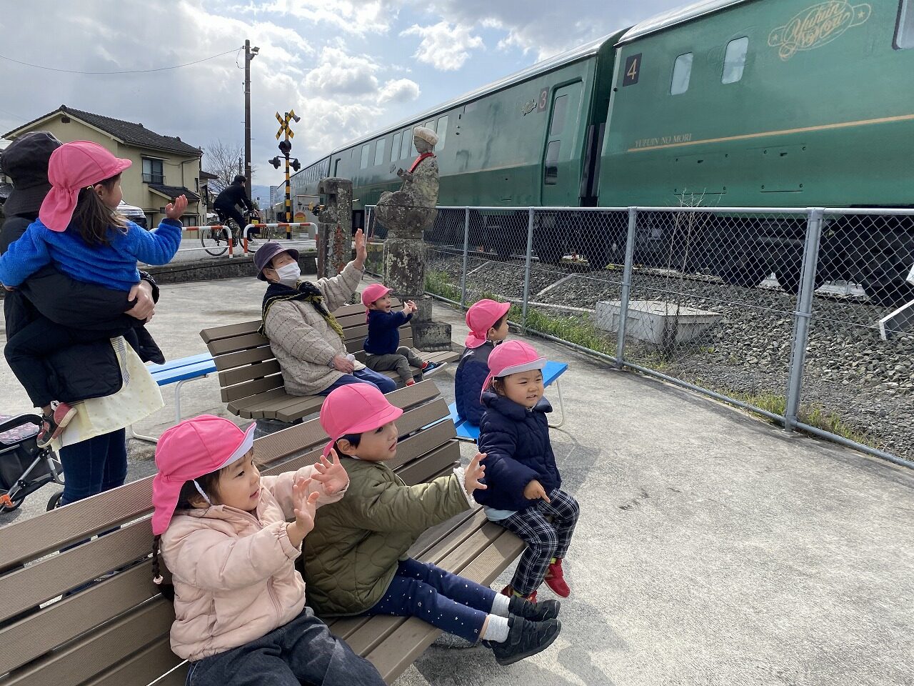 みんなでお散歩に出かけました。 今日はいつものお散歩とはちょっと違います。 「どこに行きたい?」との保育士等の声掛けに 「汽車を見に行きたい!」という子たちと、「カモを見たい!」という子たち。「じゃあ、カモさんコースと汽車コースに分かれて行ってみる?」と聞いてみると、「カモ見に行く!」「汽車行きたい!」と思い思いを言葉する子どもたちでした。自分の行きたいコースを決めると、さっそく出発進行!! カモさんコースは河川敷を歩きながら、カモを観察したり、季節の草花に触れたり、石を拾って遊びました。 汽車コースは道路を歩きながら、すれ違う近所の方にご挨拶をしたり、一緒に遊んでもらったり。お目当ての湯布院の森号や赤の列車を見てバイバイ!!と元気に手を振ります。最後は丸の内公園に行って沢山遊んで帰りました。 帰り着くと、先生たちに「あのね、湯布院の森号みたよ。おばあちゃんと遊んだ!」「赤ちゃんカモさん、迷子になって一人やった・・・」など、先生たちに色んな出来事を話してくれました。言葉でちゃんと伝えてくれることも、また嬉しく、楽しい時間です。