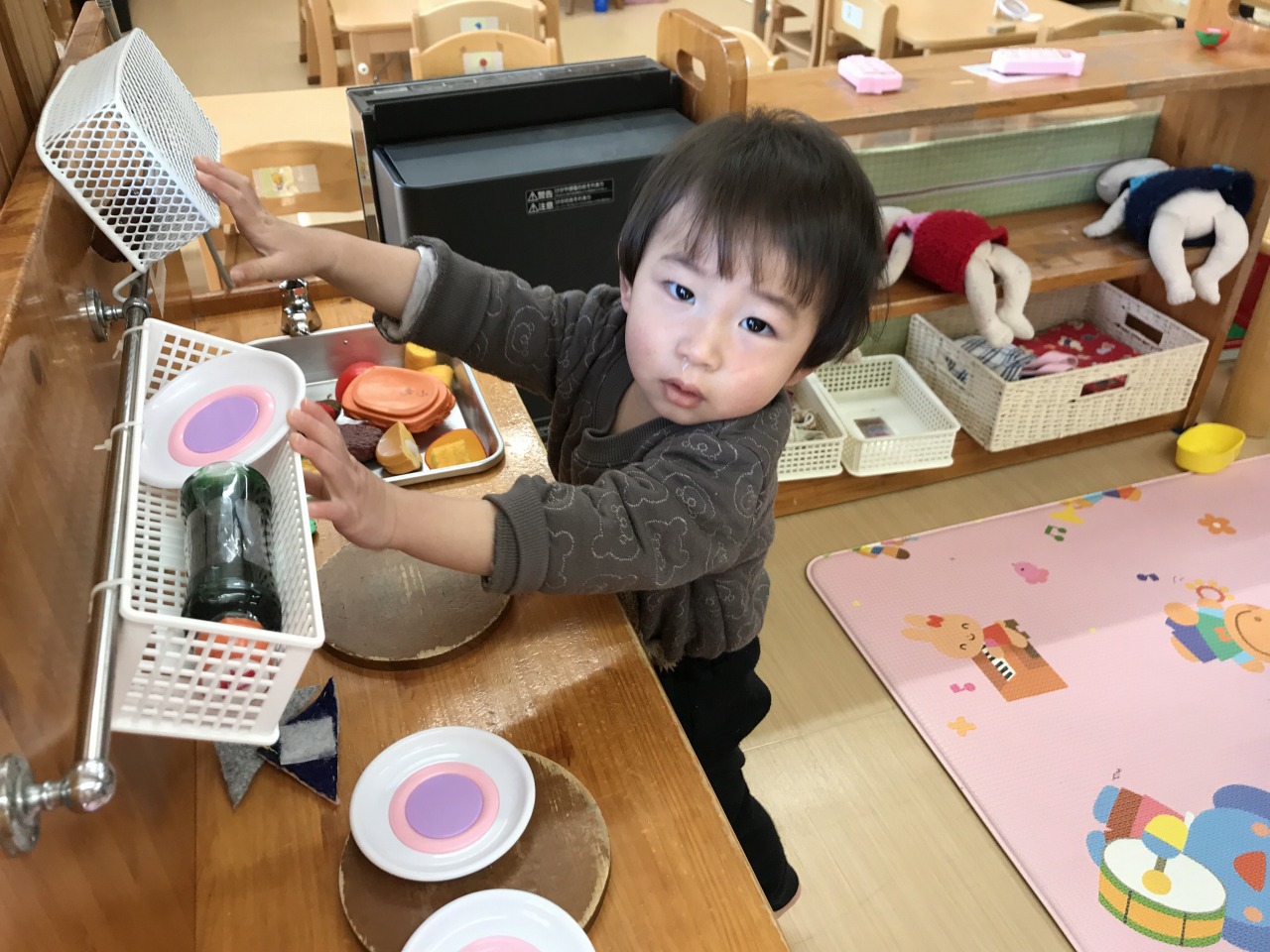 お部屋で遊んだお友だちは保育士等とままごと遊びを楽しみました。お皿に食べ物を乗せたり、保育士等の口元に食べ物を持ってきてくれたりして、見立て遊びを楽しんでいます。