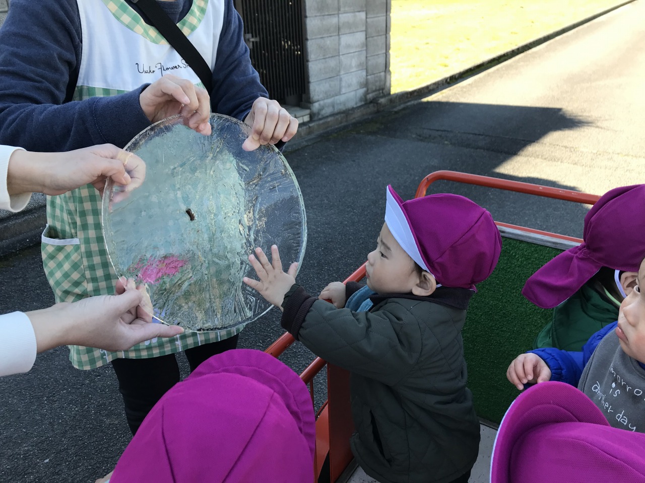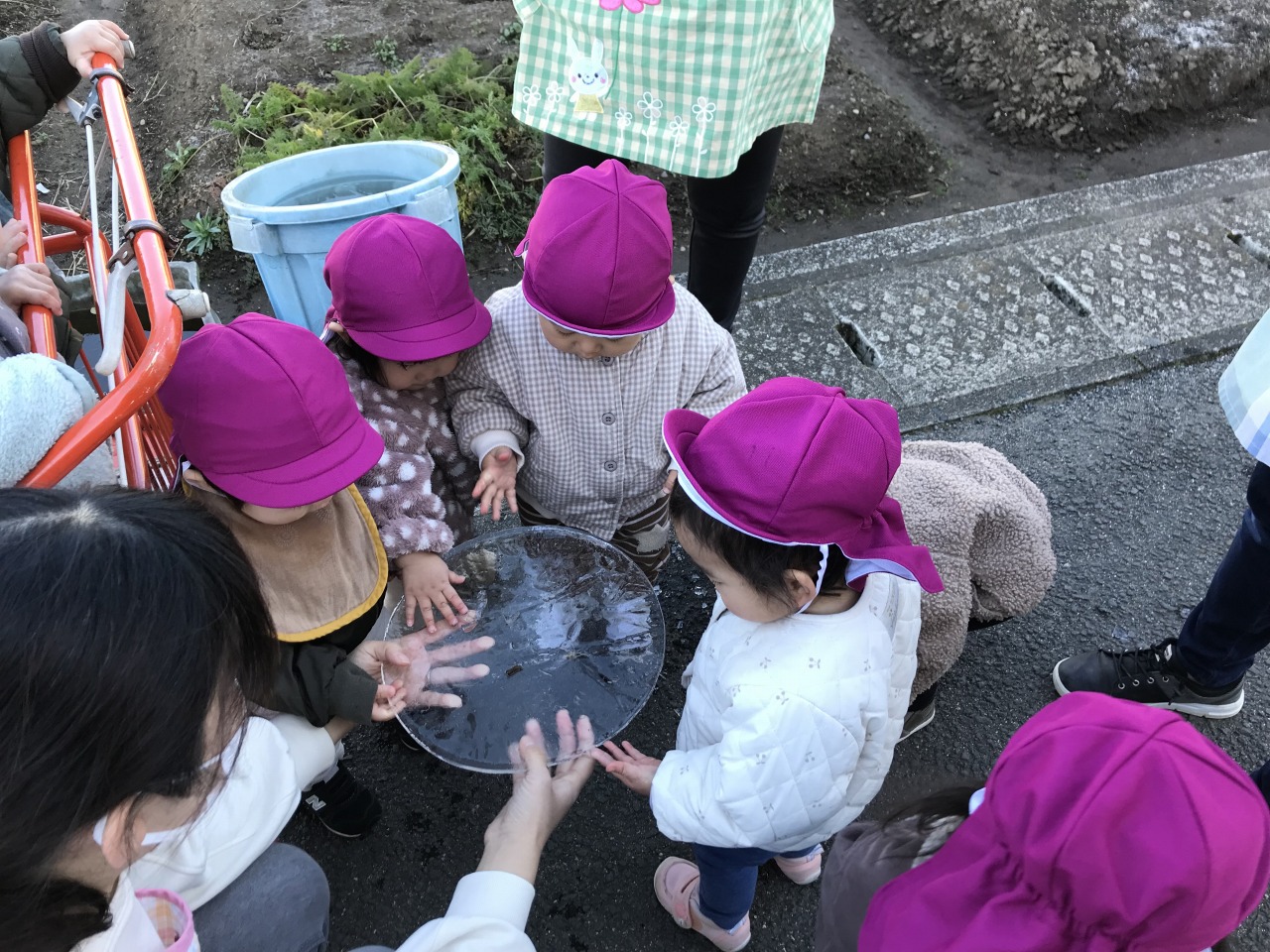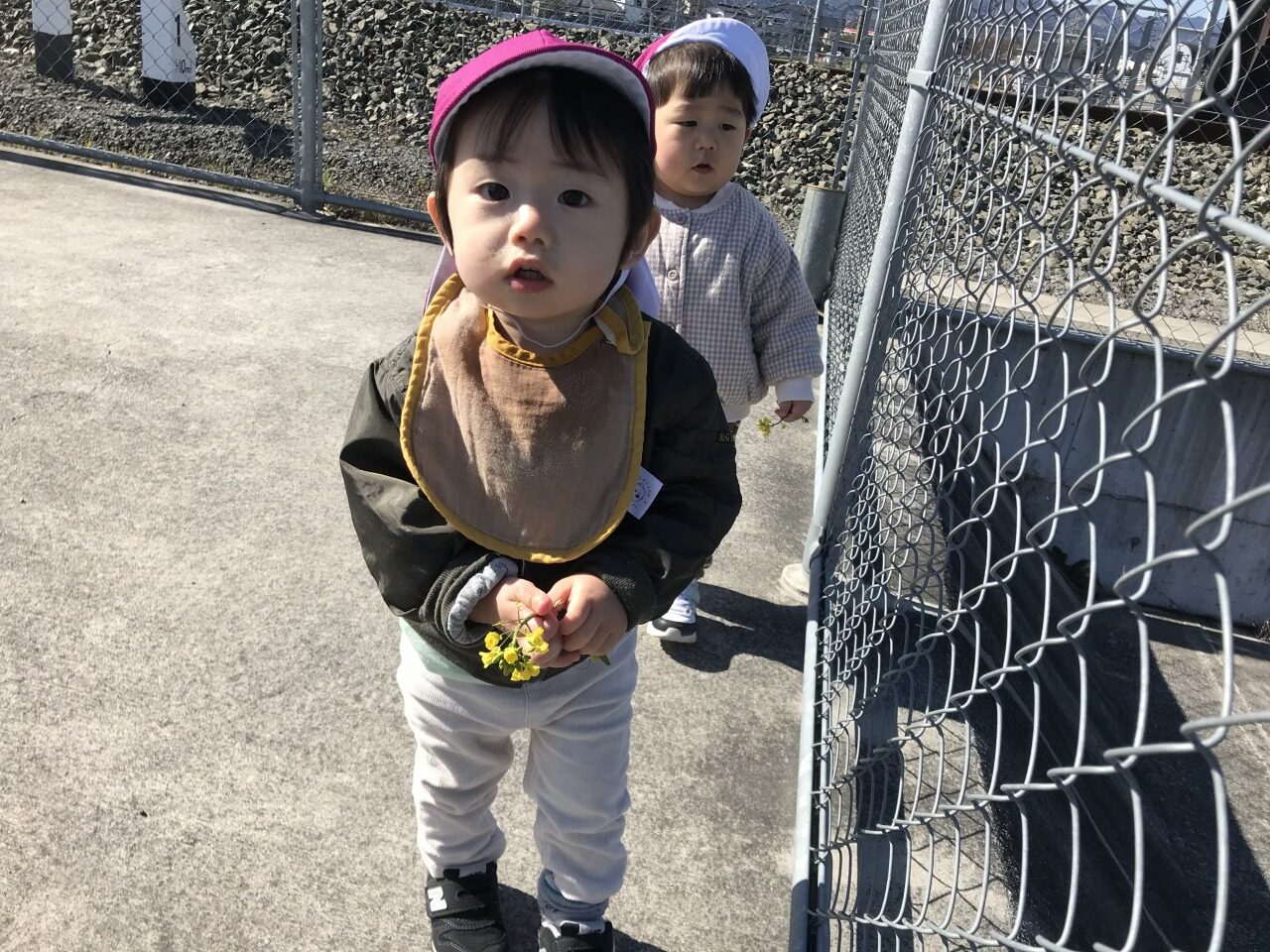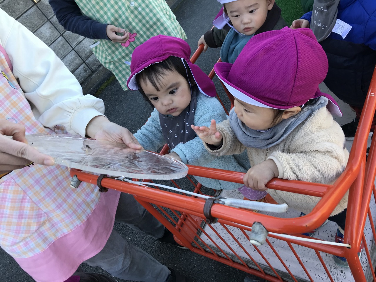 今日はとても天気が良く暖かかったので、ひよこ組(0歳児)は散歩に出掛けました。足腰がしっかりしてきて保育士等と手を繋いで歩くことを楽しんでいる子ども達です。道を歩いているとバケツの中に氷を発見!丸くて大きい氷を足で踏んで”シャリシャリ”という音を楽しんだり、手で触って冷たさを感じたりと夢中で触って遊んでいました。土手道には菜の花などのお花も咲いていて春の訪れも感じました。保育士等も「氷が冷たいね」「菜の花が綺麗だね」などと声を掛けながら自然を感じながら散歩を楽しめるようにしています。少しずつ春が近づいて暖かくなってくると思うので、天気の良い日は積極的に戸外に出て遊んだり散歩に出掛けたりしていきたいと思います。