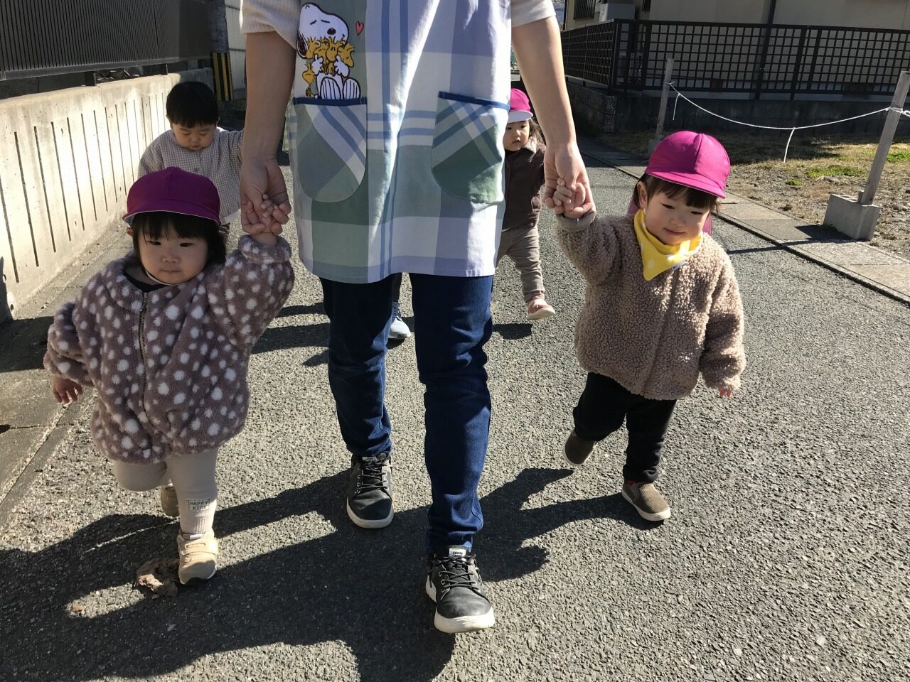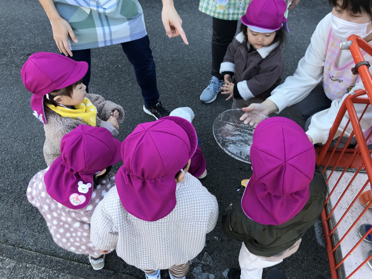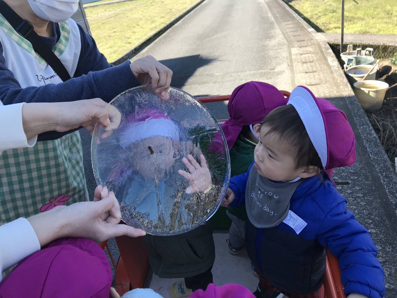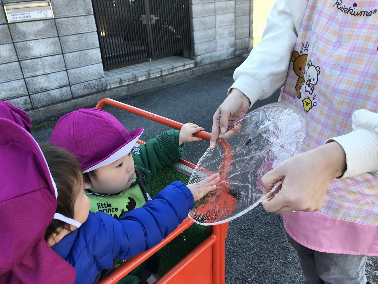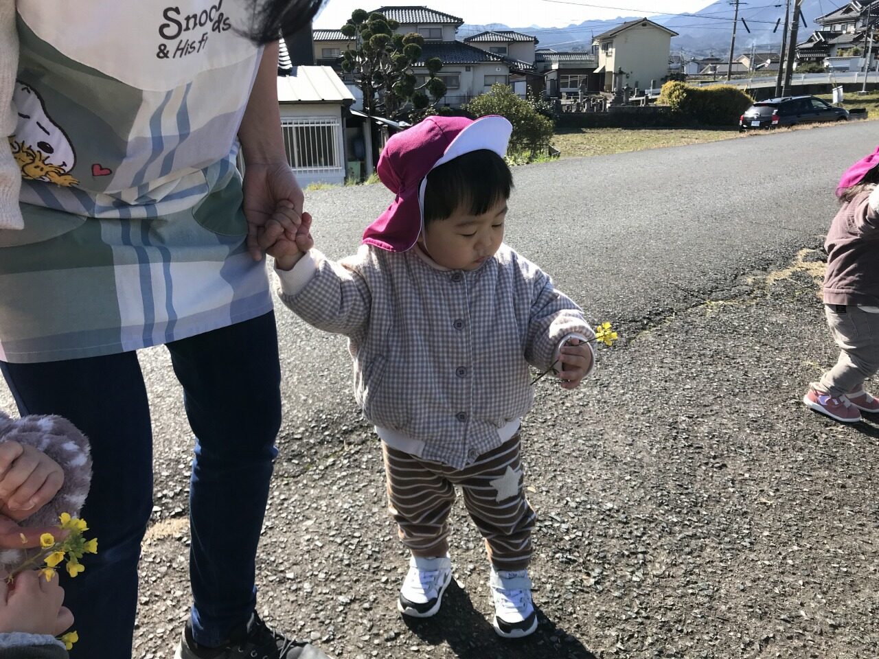 今日はとても天気が良く暖かかったので、ひよこ組(0歳児)は散歩に出掛けました。足腰がしっかりしてきて保育士等と手を繋いで歩くことを楽しんでいる子ども達です。道を歩いているとバケツの中に氷を発見!丸くて大きい氷を足で踏んで”シャリシャリ”という音を楽しんだり、手で触って冷たさを感じたりと夢中で触って遊んでいました。土手道には菜の花などのお花も咲いていて春の訪れも感じました。保育士等も「氷が冷たいね」「菜の花が綺麗だね」などと声を掛けながら自然を感じながら散歩を楽しめるようにしています。少しずつ春が近づいて暖かくなってくると思うので、天気の良い日は積極的に戸外に出て遊んだり散歩に出掛けたりしていきたいと思います。