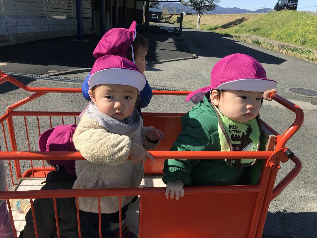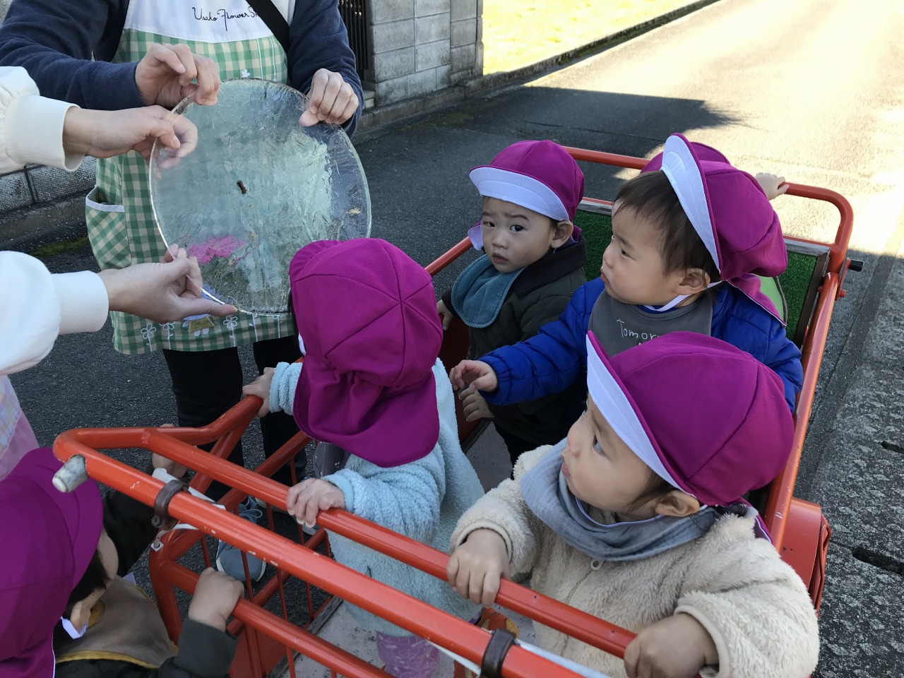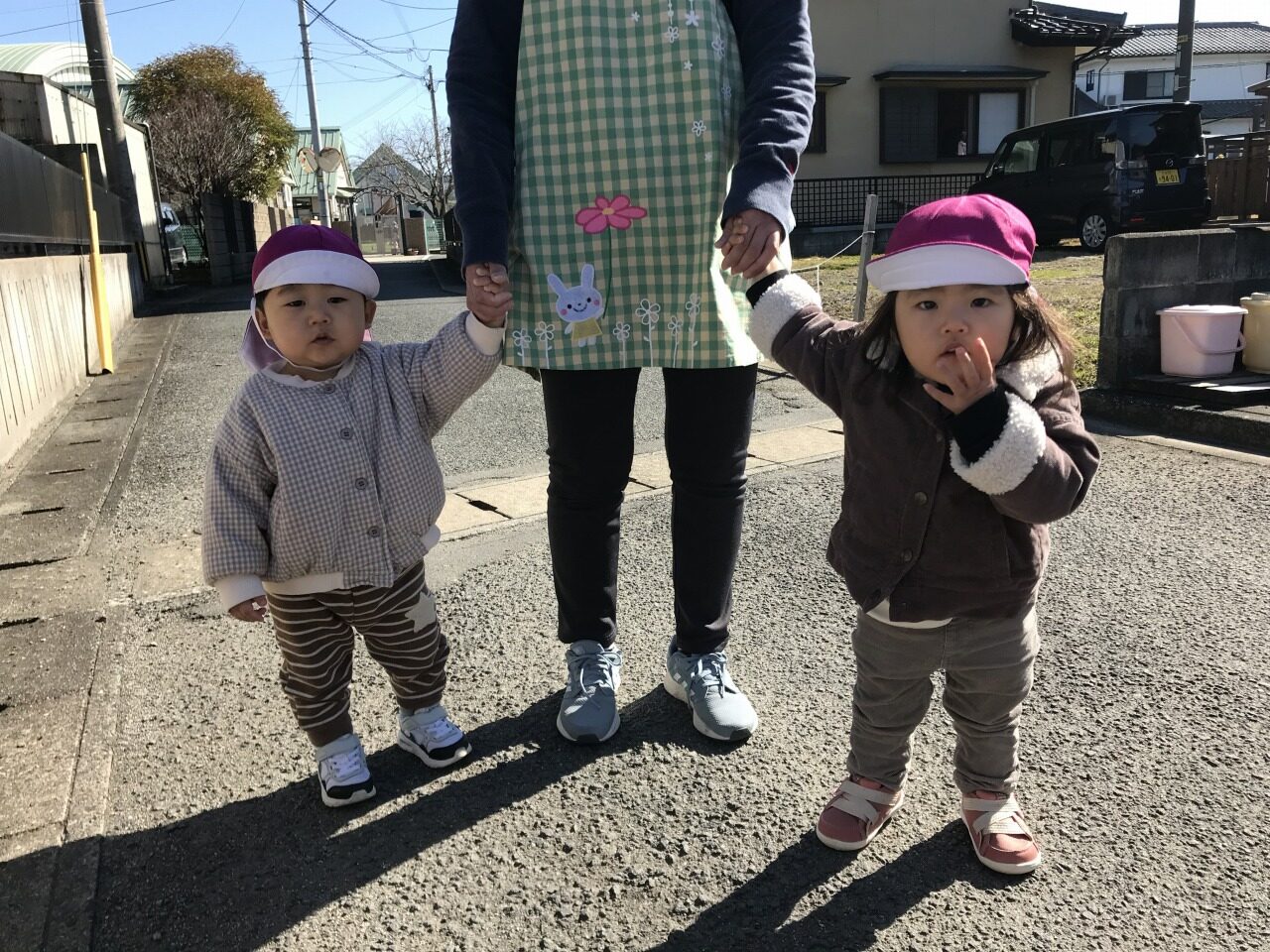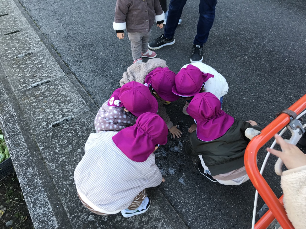 今日はとても天気が良く暖かかったので、ひよこ組(0歳児)は散歩に出掛けました。足腰がしっかりしてきて保育士等と手を繋いで歩くことを楽しんでいる子ども達です。道を歩いているとバケツの中に氷を発見!丸くて大きい氷を足で踏んで”シャリシャリ”という音を楽しんだり、手で触って冷たさを感じたりと夢中で触って遊んでいました。土手道には菜の花などのお花も咲いていて春の訪れも感じました。保育士等も「氷が冷たいね」「菜の花が綺麗だね」などと声を掛けながら自然を感じながら散歩を楽しめるようにしています。少しずつ春が近づいて暖かくなってくると思うので、天気の良い日は積極的に戸外に出て遊んだり散歩に出掛けたりしていきたいと思います。