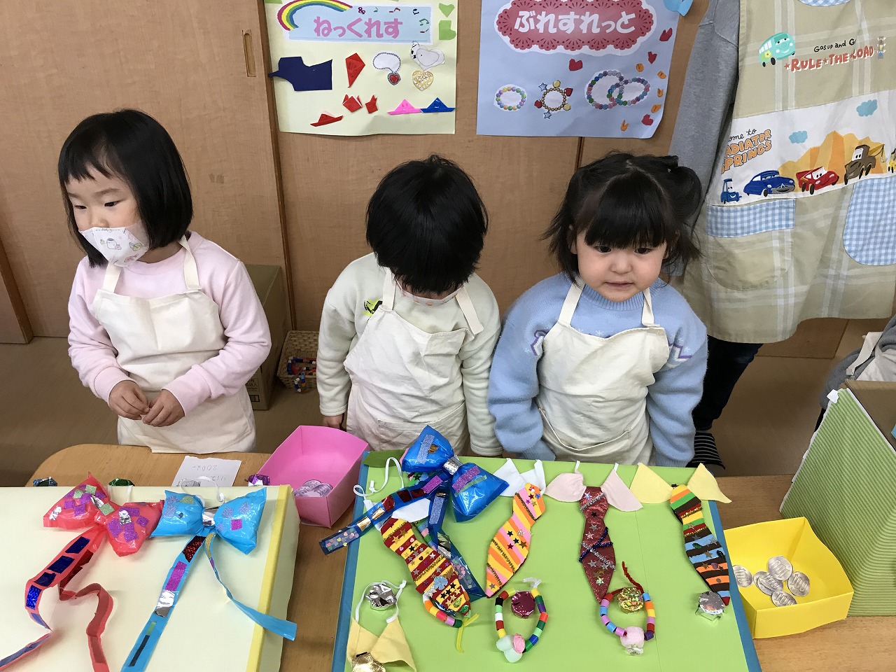 楽しみに準備をしてきたお店屋さん!今日はもも組、さくら組、うめ組みんな一緒にお店屋さんごっこを楽しみました。うめ組はアクセサリー屋さん★可愛い帽子やネックレスがあり、みんなにこにこでアクセサリーを身につけ、お買い物を楽しんでいました♩