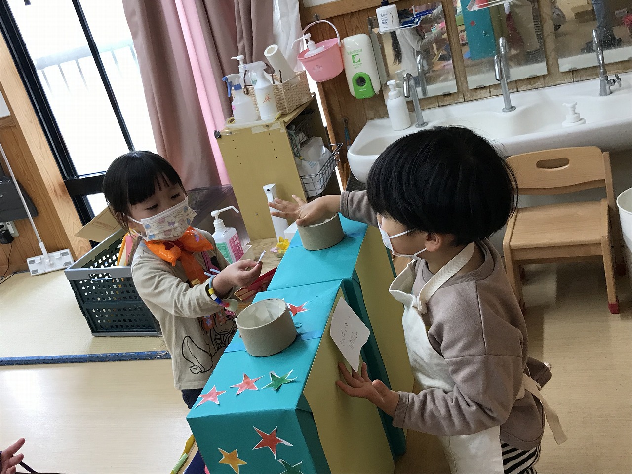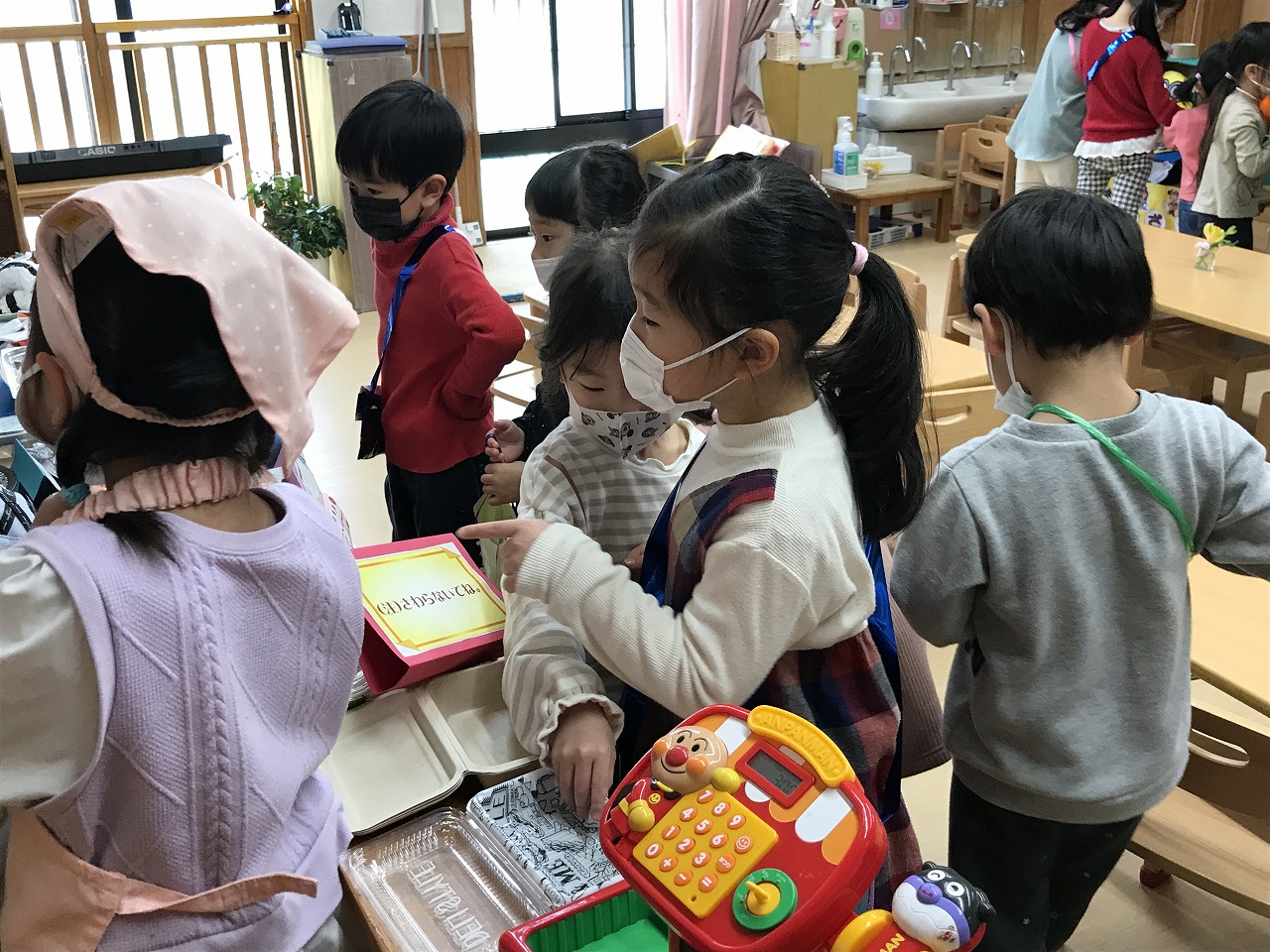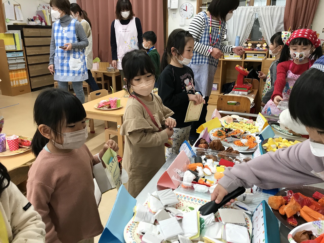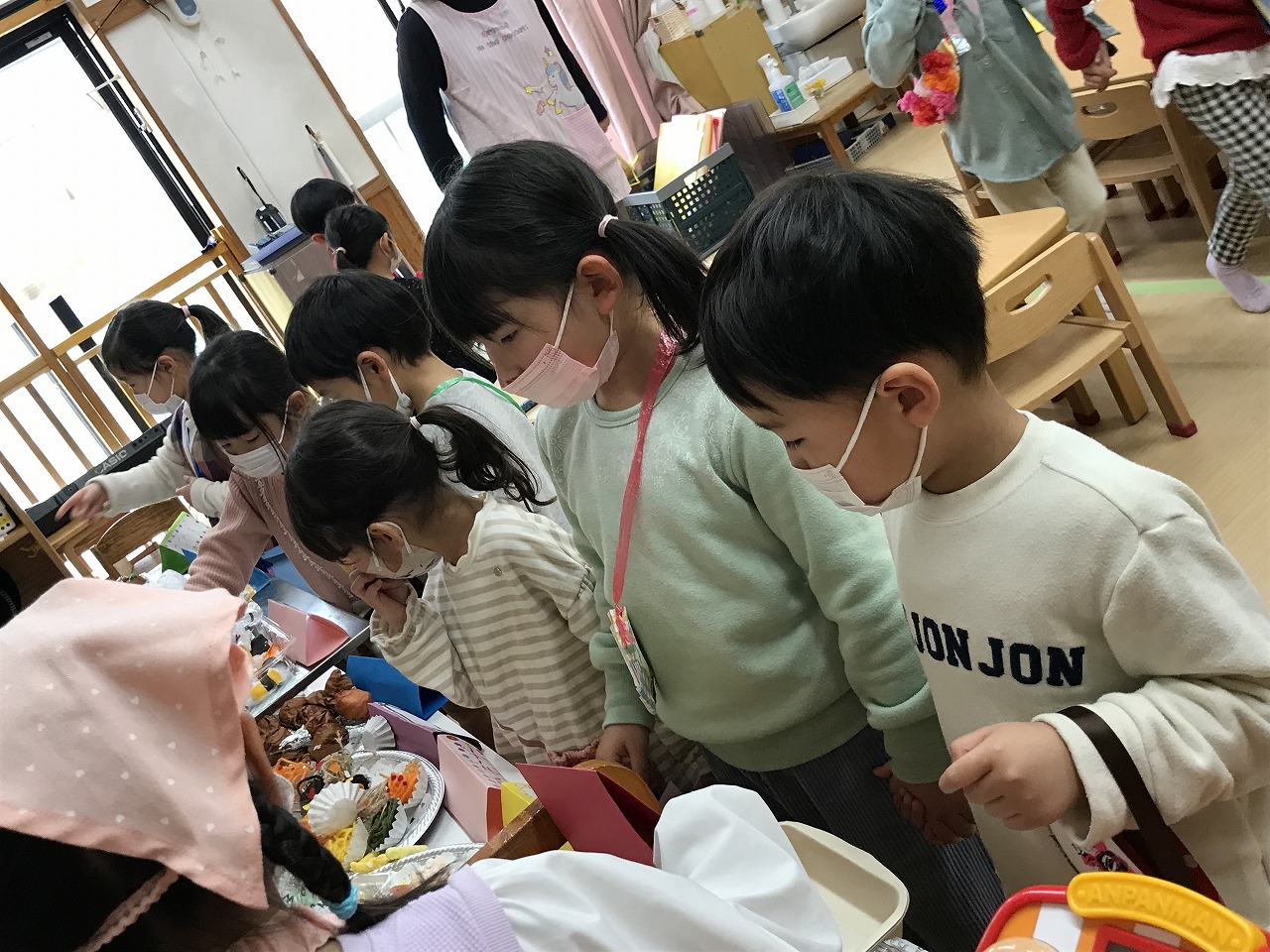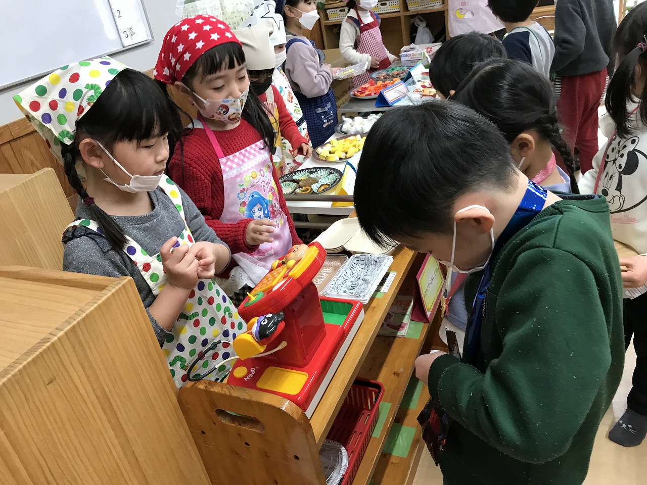 2023年3月1日 2023.03.01 おみせやさんごっこ 3,4,5歳児~きりんぐるーぷ~ 昨日のおみせやさんごっこの続きで、今日はきりんぐるーぷ(3,4,5歳児)で行いました。 自分の好きなアクセサリーを選び「おしゃれに変身」した後は、お弁当屋さんによって映画館へ! 映画館シアターで「おおきなかぶ」のお話がありました。 子ども達が自分達でアイデアを出し合いごっこ遊びを行う中で、文字や数字に関心を持ち遊びの中に取り入れ、お金のやり取りを楽しむ事が出来ました。 ◎今日の献立 ★お昼ごはん★ ちゃんぽん ひじき納豆 たこやき グレープゼリー ★おやつ★ クロレラ おふラスク Follow me! FacebookXBlueskyHatenaPocketCopy