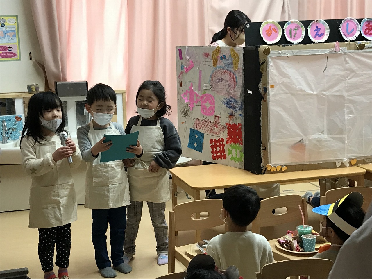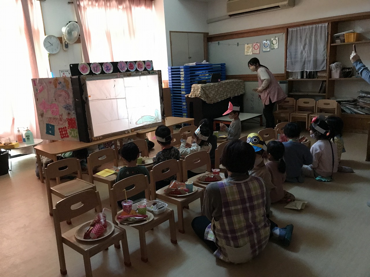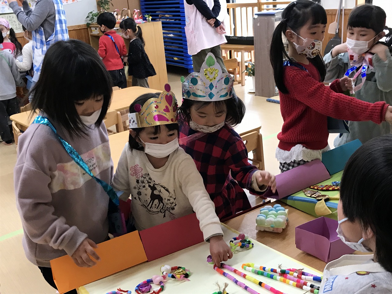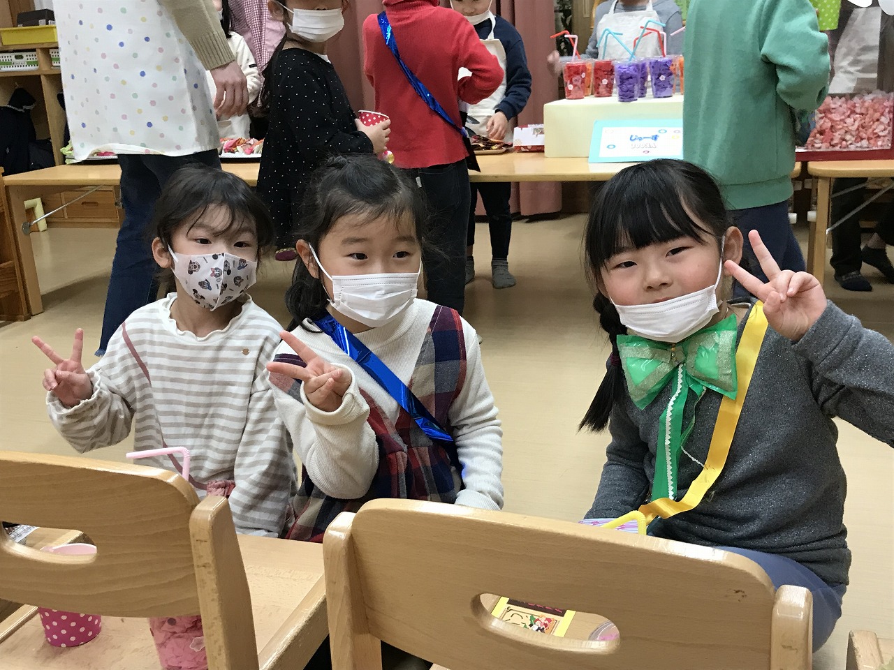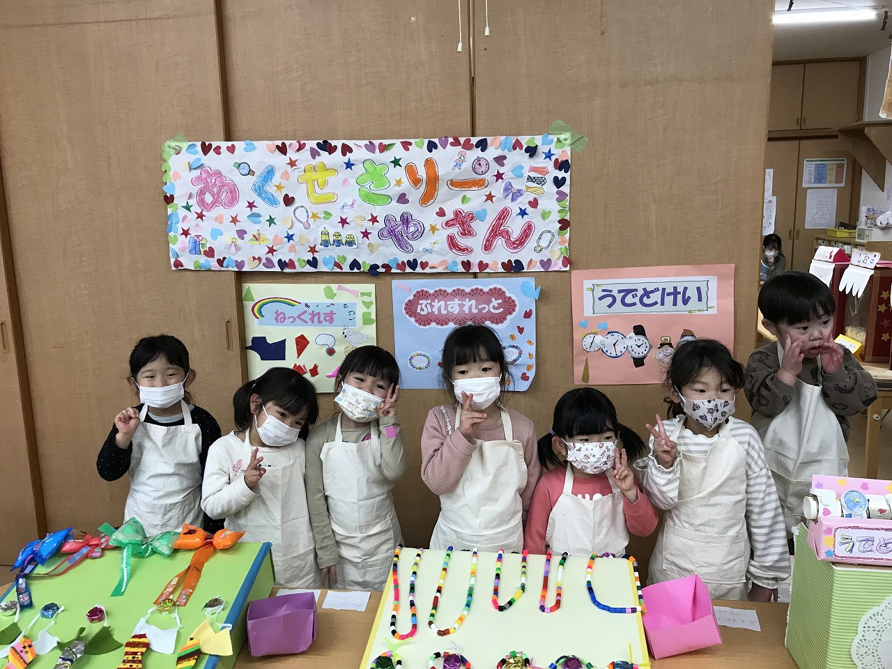 2023年3月1日 2023.03.01 おみせやさんごっこ 3,4,5歳児~きりんぐるーぷ~ 昨日のおみせやさんごっこの続きで、今日はきりんぐるーぷ(3,4,5歳児)で行いました。 自分の好きなアクセサリーを選び「おしゃれに変身」した後は、お弁当屋さんによって映画館へ! 映画館シアターで「おおきなかぶ」のお話がありました。 子ども達が自分達でアイデアを出し合いごっこ遊びを行う中で、文字や数字に関心を持ち遊びの中に取り入れ、お金のやり取りを楽しむ事が出来ました。 ◎今日の献立 ★お昼ごはん★ ちゃんぽん ひじき納豆 たこやき グレープゼリー ★おやつ★ クロレラ おふラスク Follow me! FacebookXBlueskyHatenaPocketCopy