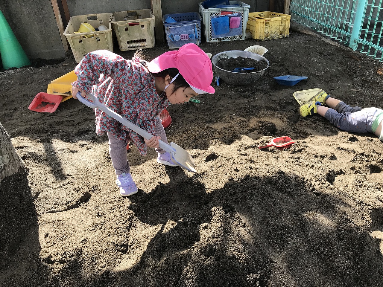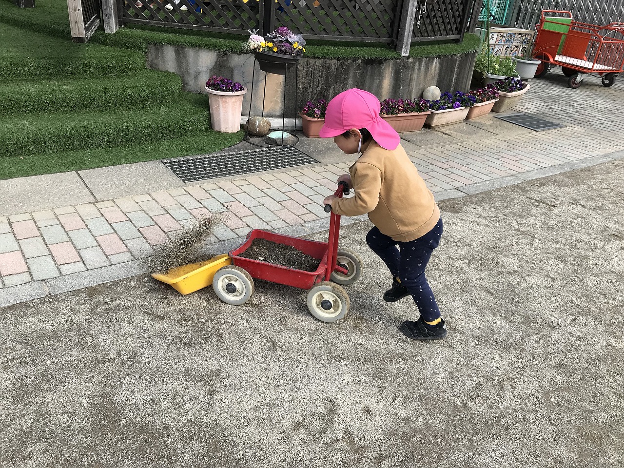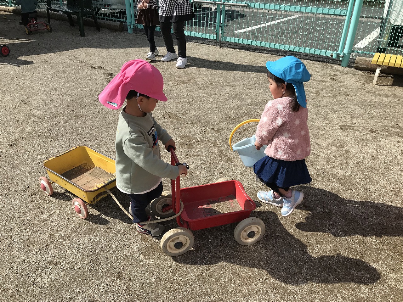 子どもたちは遊びを生み出す天才で、手押し車とポーターを組み合わせてショベルカーを作ったり砂場では砂を集めて山を作ったりと自分で考えながら遊びを楽しむ姿が見られました。大人が思いつかないような発想を持っていて、子どもたちの遊ぶ様子を見守っているととても面白いです。
