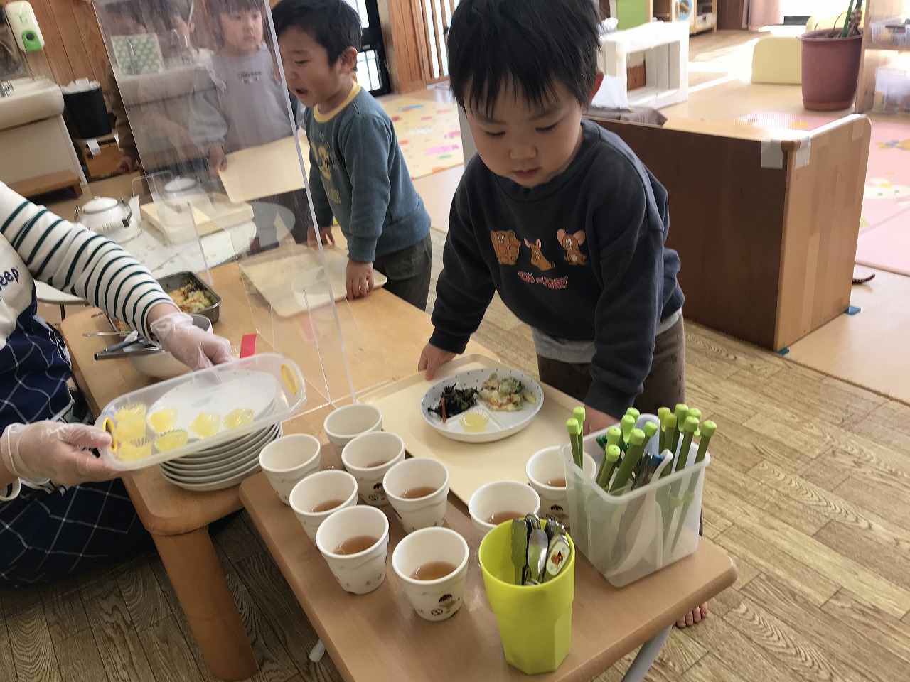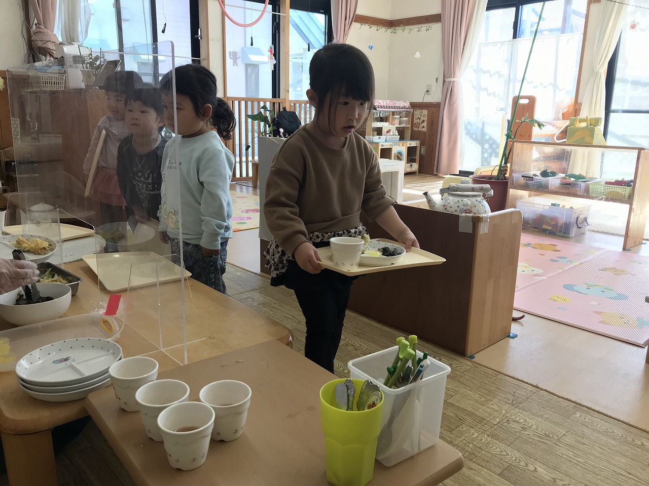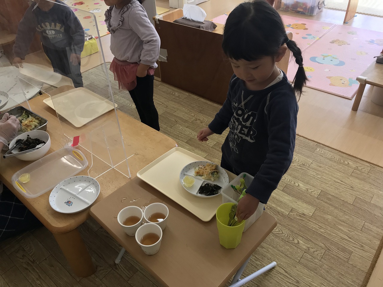 いつもと違う雰囲気に少し緊張ぎみの子どもたちでしたが、悩みながらも「いっぱいください」「すこしください」と保育士等に伝えることが出来ました。