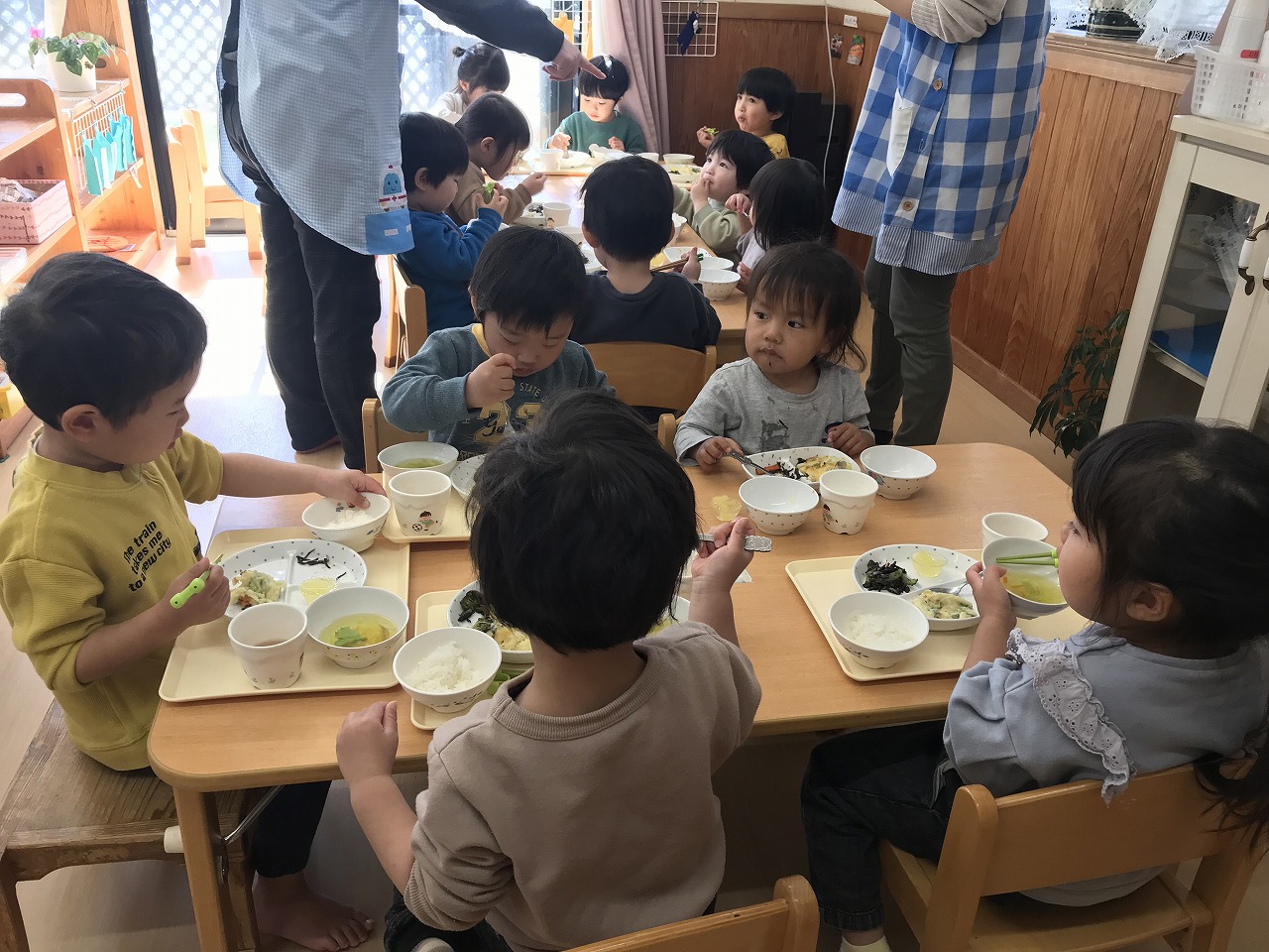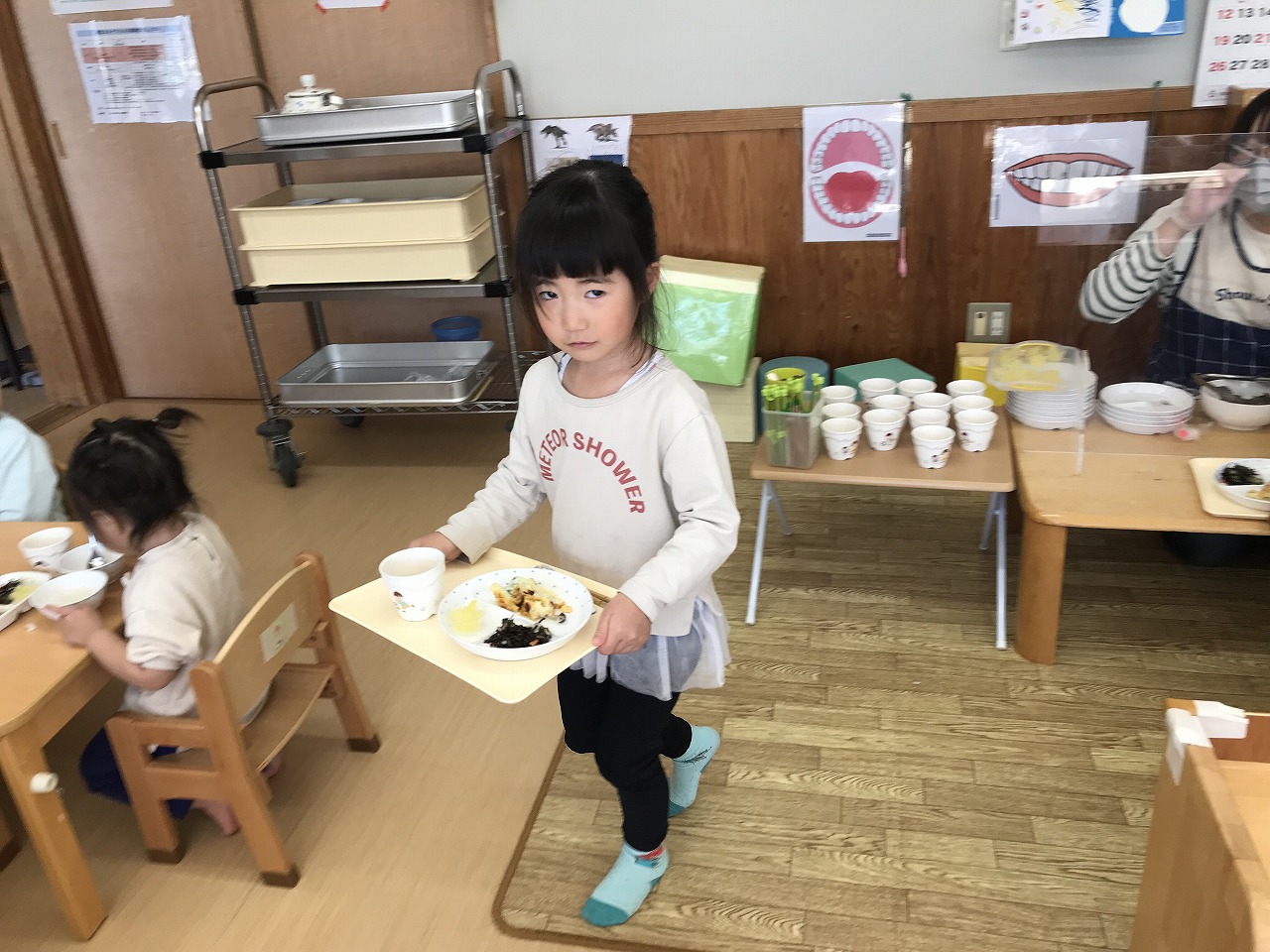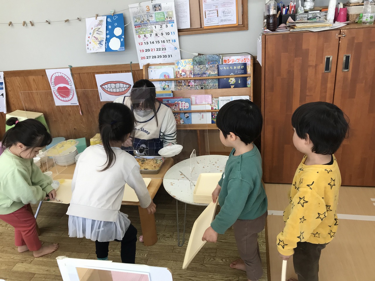 いつもと違う雰囲気に少し緊張ぎみの子どもたちでしたが、悩みながらも「いっぱいください」「すこしください」と保育士等に伝えることが出来ました。