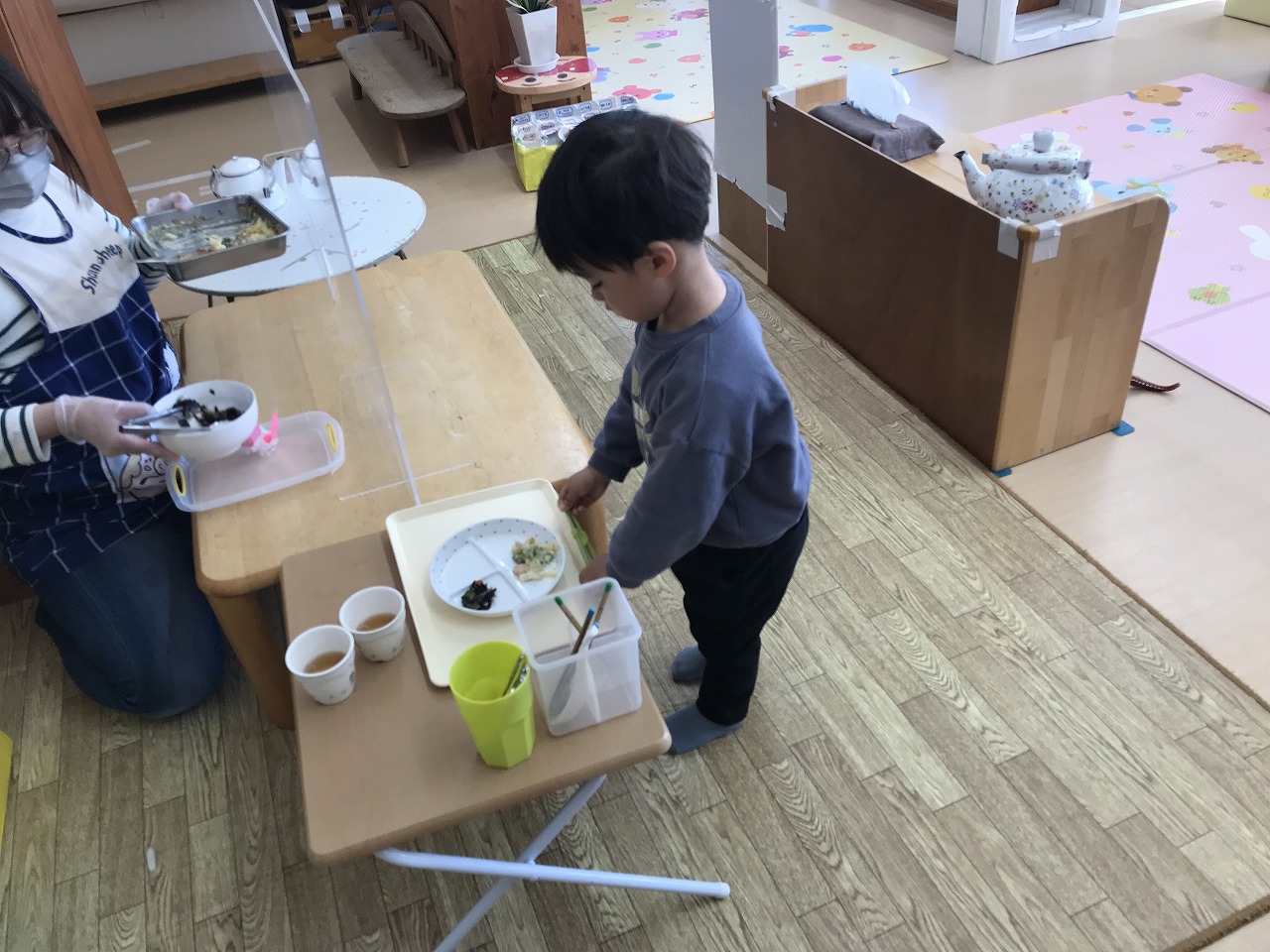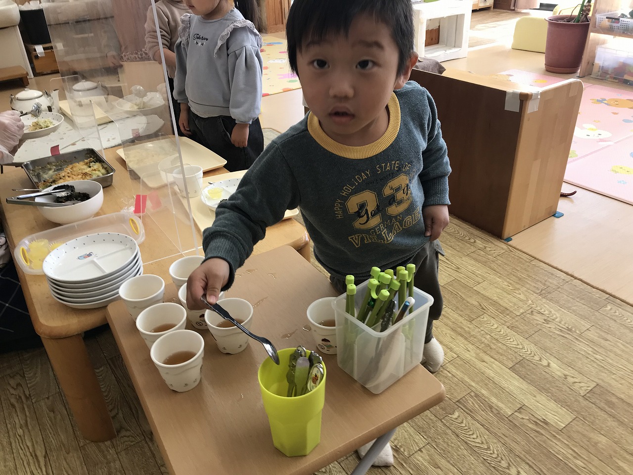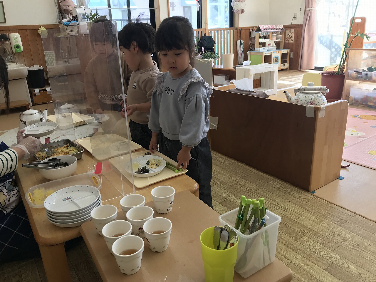 以上児クラスに向けて準備の一つとして、たんぽぽ組(2歳児)でもバイキングの練習をスタートしました。