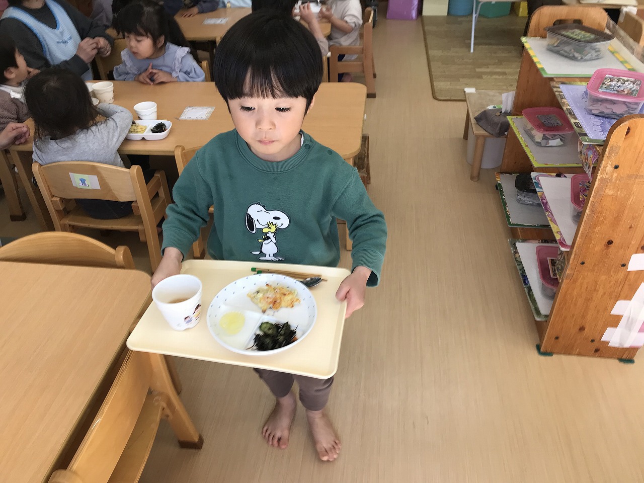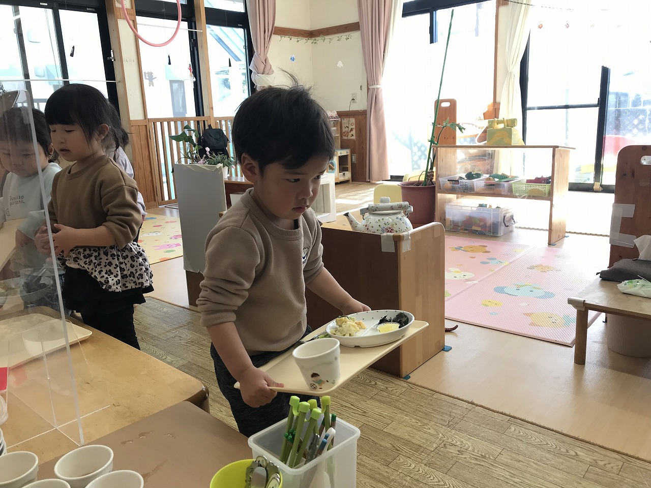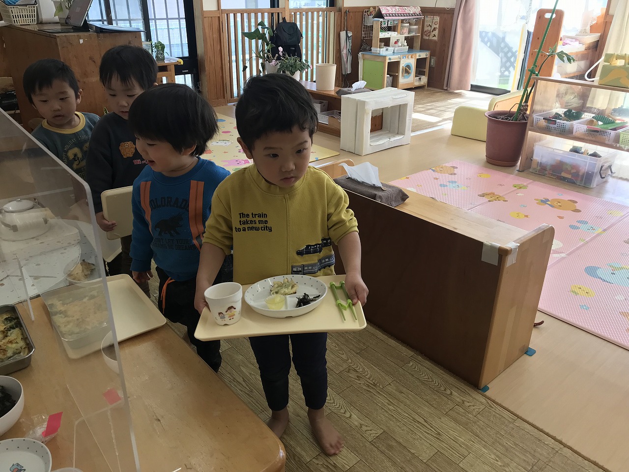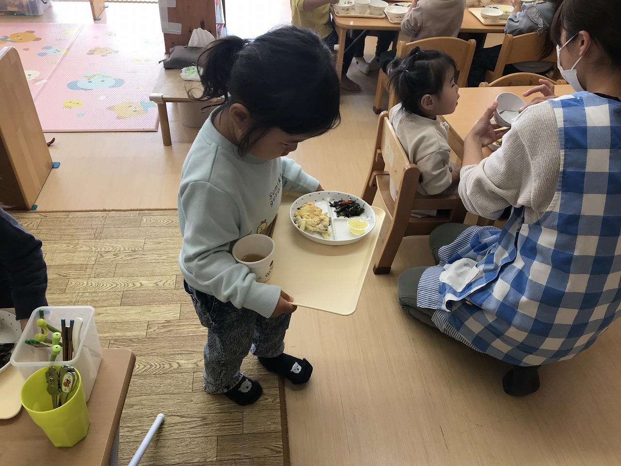 以上児クラスに向けて準備の一つとして、たんぽぽ組(2歳児)でもバイキングの練習をスタートしました。
