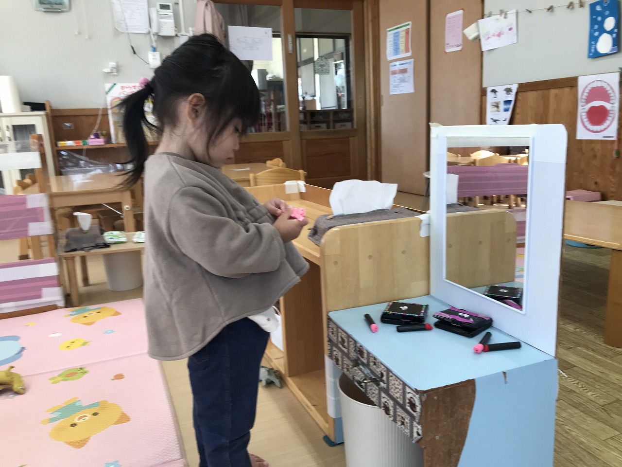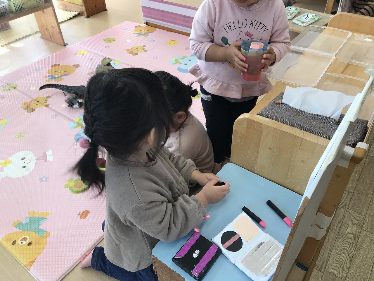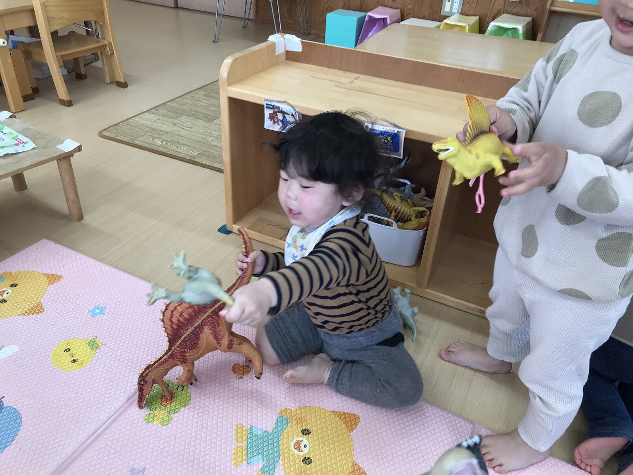 今日はみんなでたんぽぽ組(2歳児)に遊びに行きました。進級に向けて、新しい部屋で過ごすことに少しずつ慣れていけるように、今週から少人数ずつで昼食まで一緒に過ごしています。今日はたんぽぽ組さんが活動でいなかったので、部屋をお借りして好きな遊びを楽しんだ子ども達です。おままごとコーナーでごっこ遊びを楽しんだり、パズルコーナーで保育士等と一緒に集中してパズルをはめていったり、ブロックコーナーでは自分で考えながらブロックを組み立てたりと、それぞれに興味のある玩具を自分で選んで集中して遊んでいました。使った玩具は元の場所に戻すことも覚えていきながら、日常生活の流れも少しずつ身につけていけるようにしていきたいと思います。その後は、天気も良かったので戸外で沢山遊んで体を動かしました。