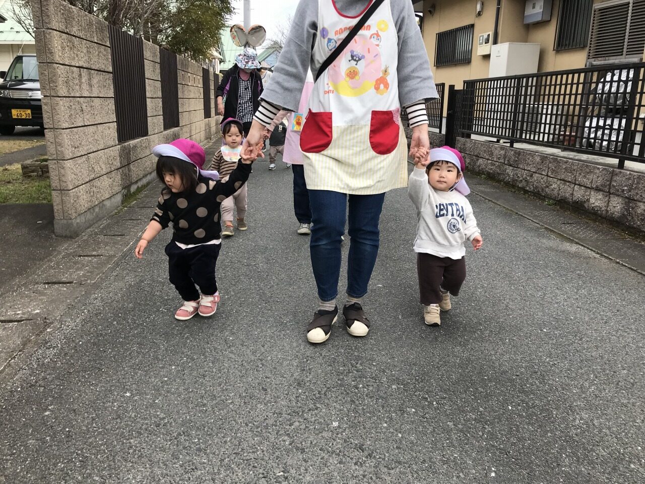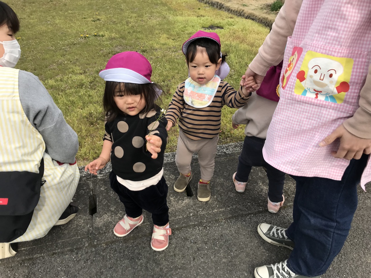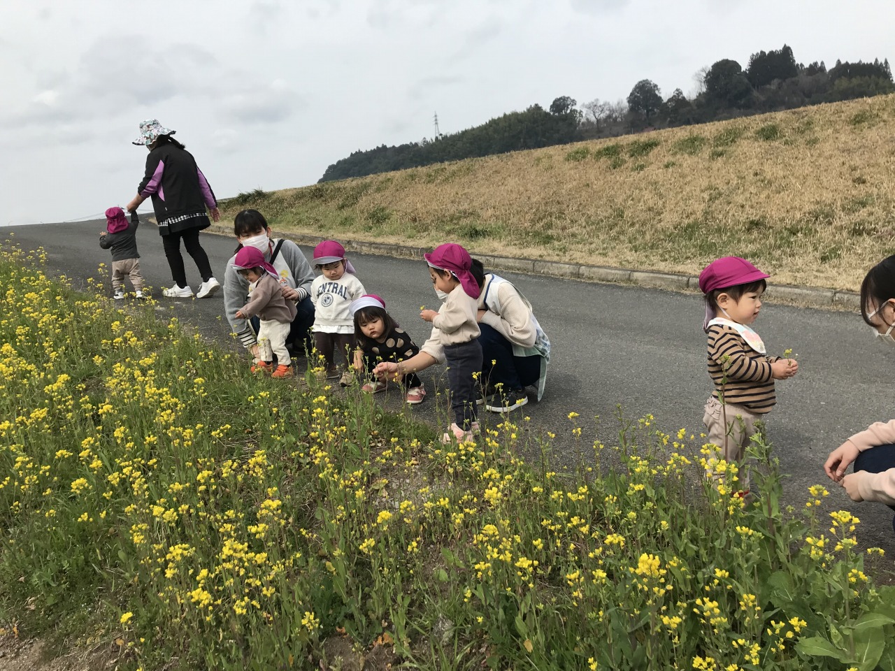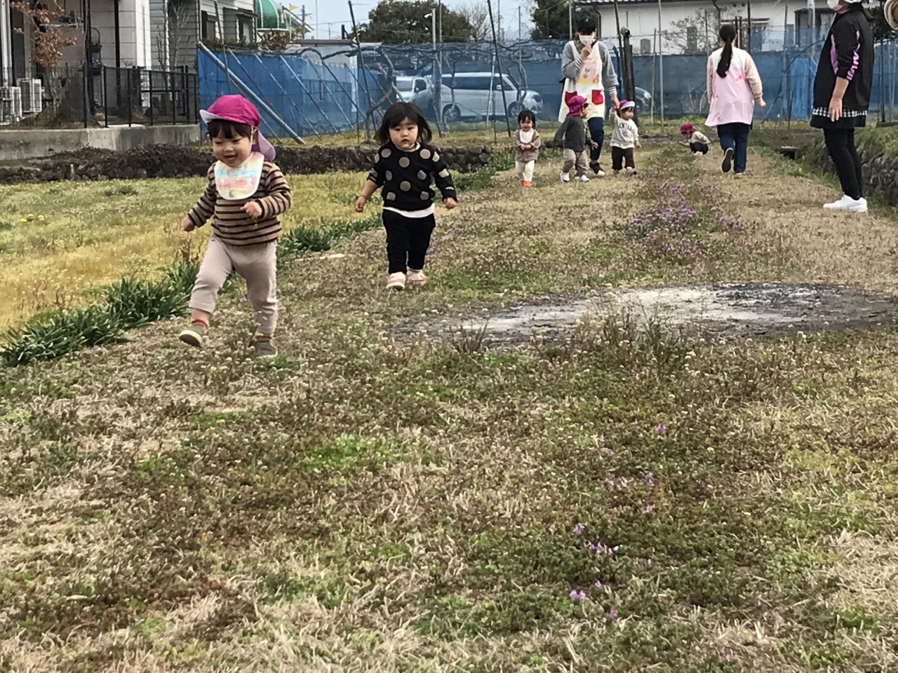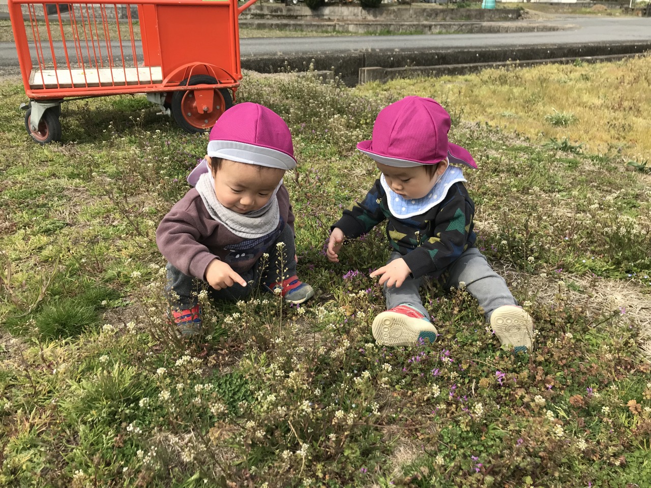 ひよこ組(0歳児)は散歩に出掛けました。水分補給をして自分で帽子を被ったり靴下を履いたりして戸外に行く準備をします。自分でしてみようとする姿を見守り、できないところはさりげなく援助をすることで、”自分でできた”という達成感を感じられるようにしています。戸外に行く準備ができたら散歩に出発です。靴も自分のマークが付いている靴箱から取り出して、自分で履こうとする姿が見られました。歩行が安定しているお友達は保育士等と手を繋いで歩きました。気温も暖かくなってきて道端には菜の花やホトケノザ、ナズナなど沢山のお花が咲いていました。保育士等に「取って~」と言ったり、自分で菜の花を摘んだりして、春の訪れを感じました。3月の後半には桜も咲くと思うので、見に行きたいと思います。