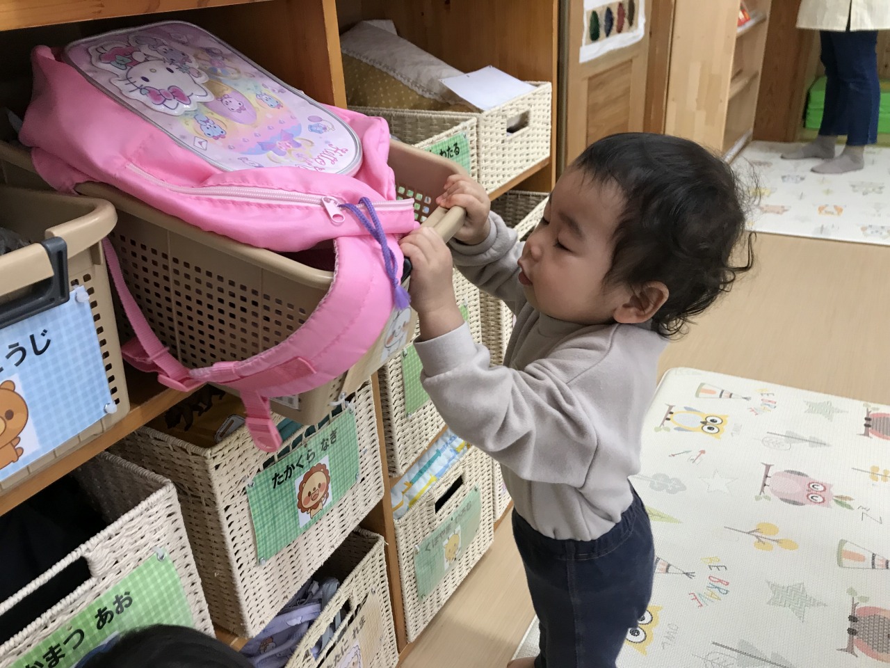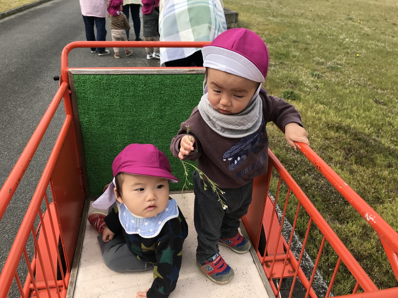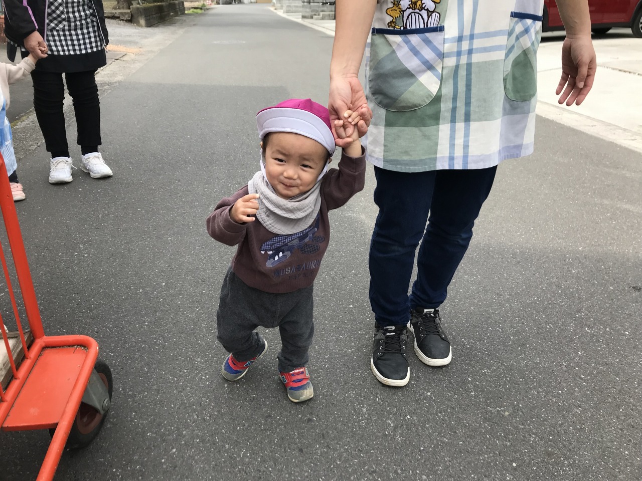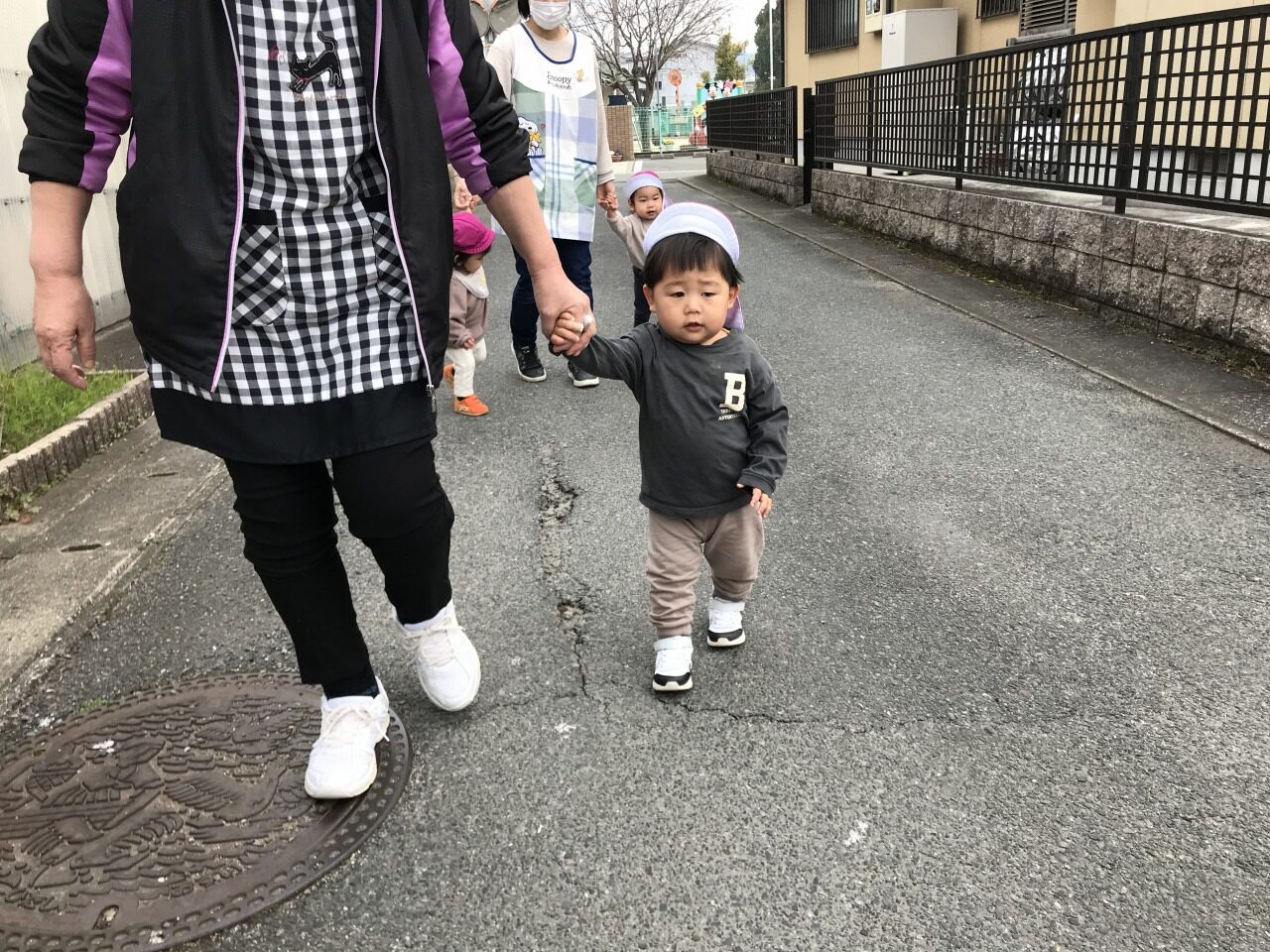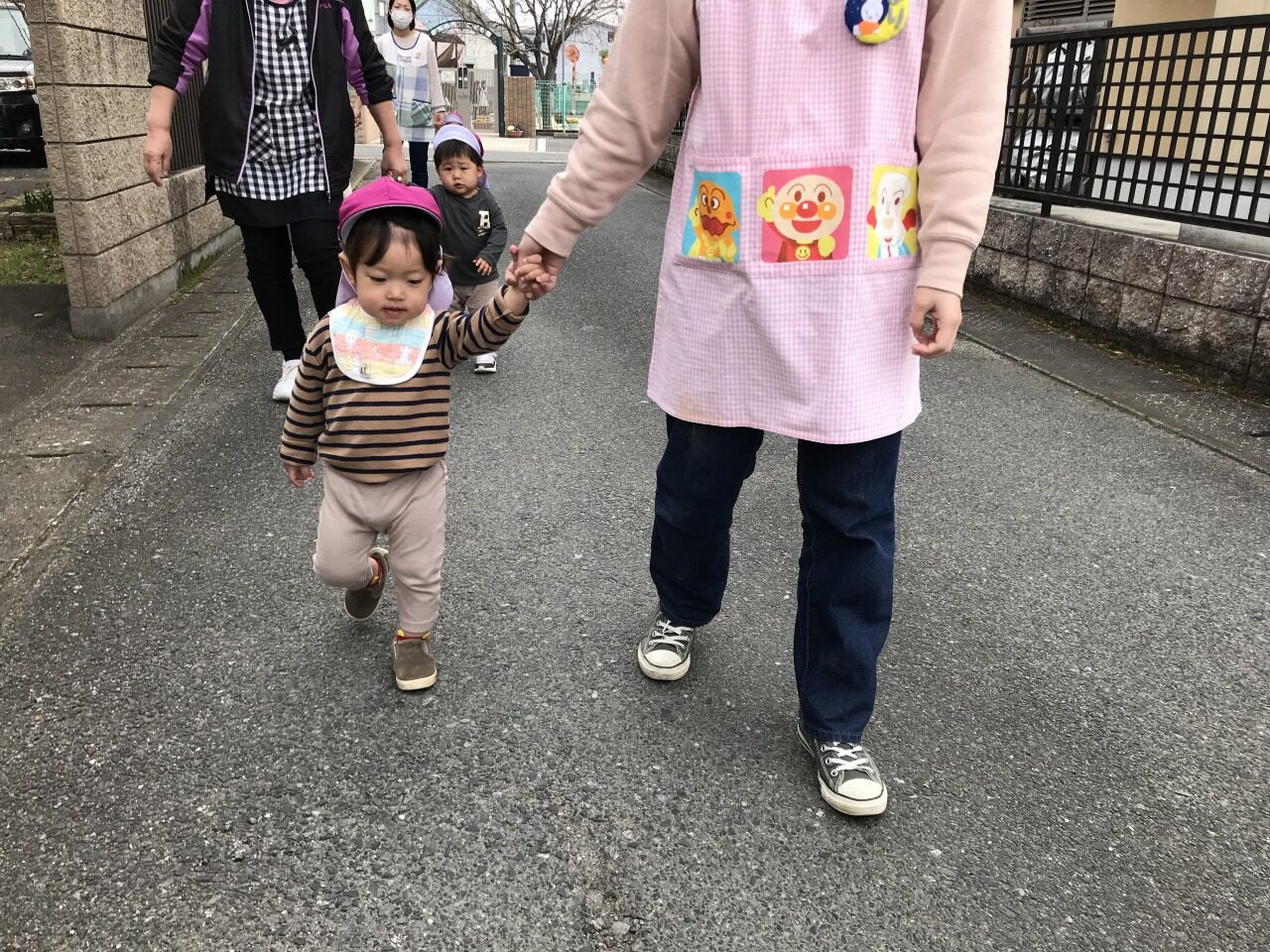 ひよこ組(0歳児)は散歩に出掛けました。水分補給をして自分で帽子を被ったり靴下を履いたりして戸外に行く準備をします。自分でしてみようとする姿を見守り、できないところはさりげなく援助をすることで、”自分でできた”という達成感を感じられるようにしています。戸外に行く準備ができたら散歩に出発です。靴も自分のマークが付いている靴箱から取り出して、自分で履こうとする姿が見られました。歩行が安定しているお友達は保育士等と手を繋いで歩きました。気温も暖かくなってきて道端には菜の花やホトケノザ、ナズナなど沢山のお花が咲いていました。保育士等に「取って~」と言ったり、自分で菜の花を摘んだりして、春の訪れを感じました。3月の後半には桜も咲くと思うので、見に行きたいと思います。