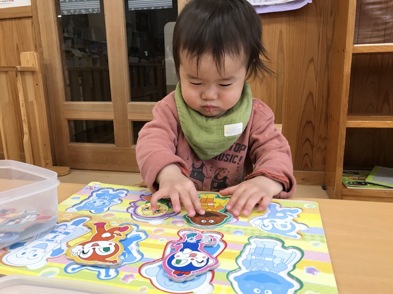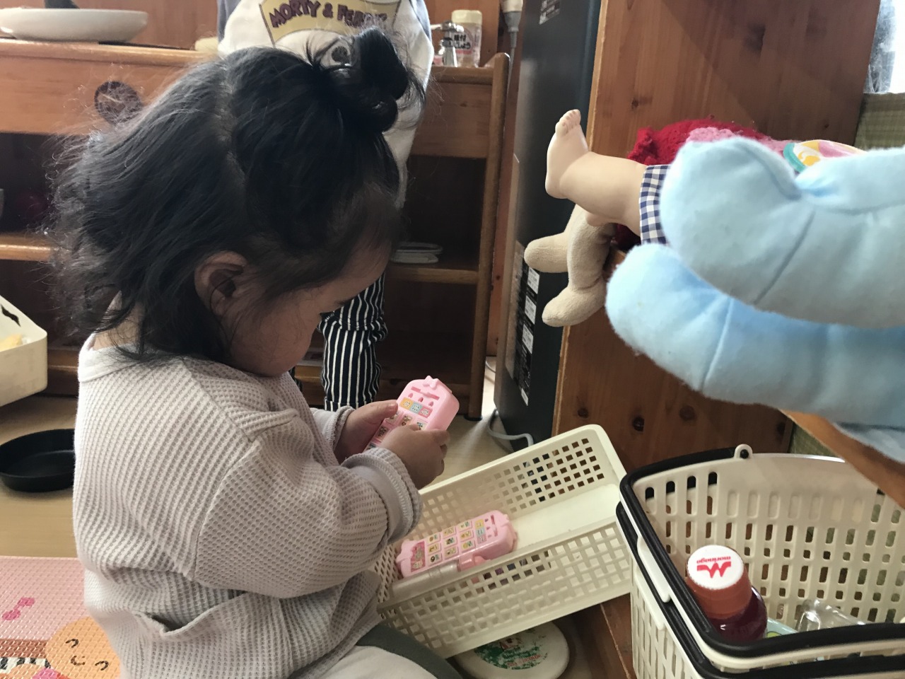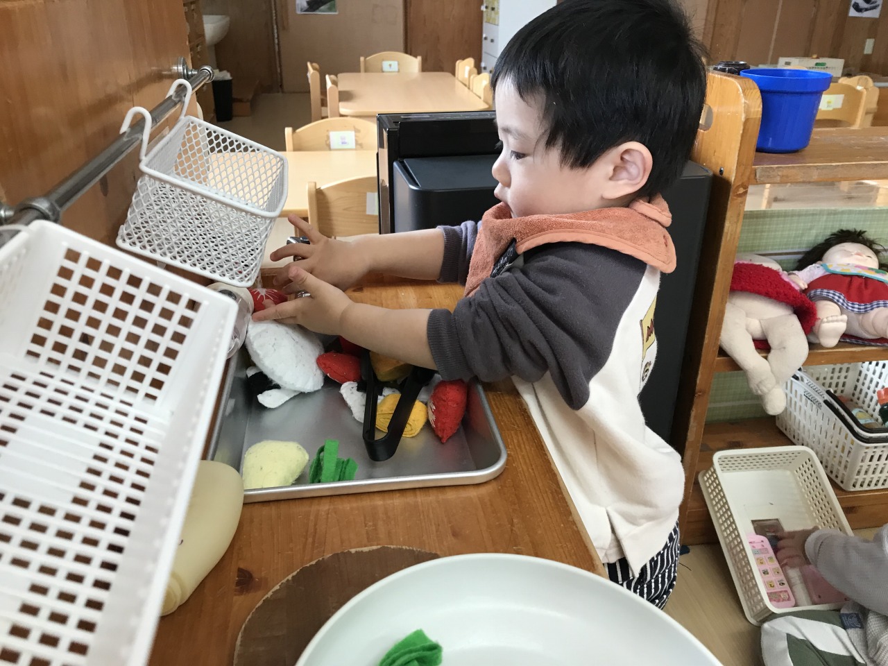 お部屋で過ごしたお友達はパズルをしたり、保育士等やすみれ組のお友達とままごとをしたりして遊びました。「はい、どーぞ」「あーんして」「美味しいね」などと見立て遊びを楽しんでいた子ども達です。
