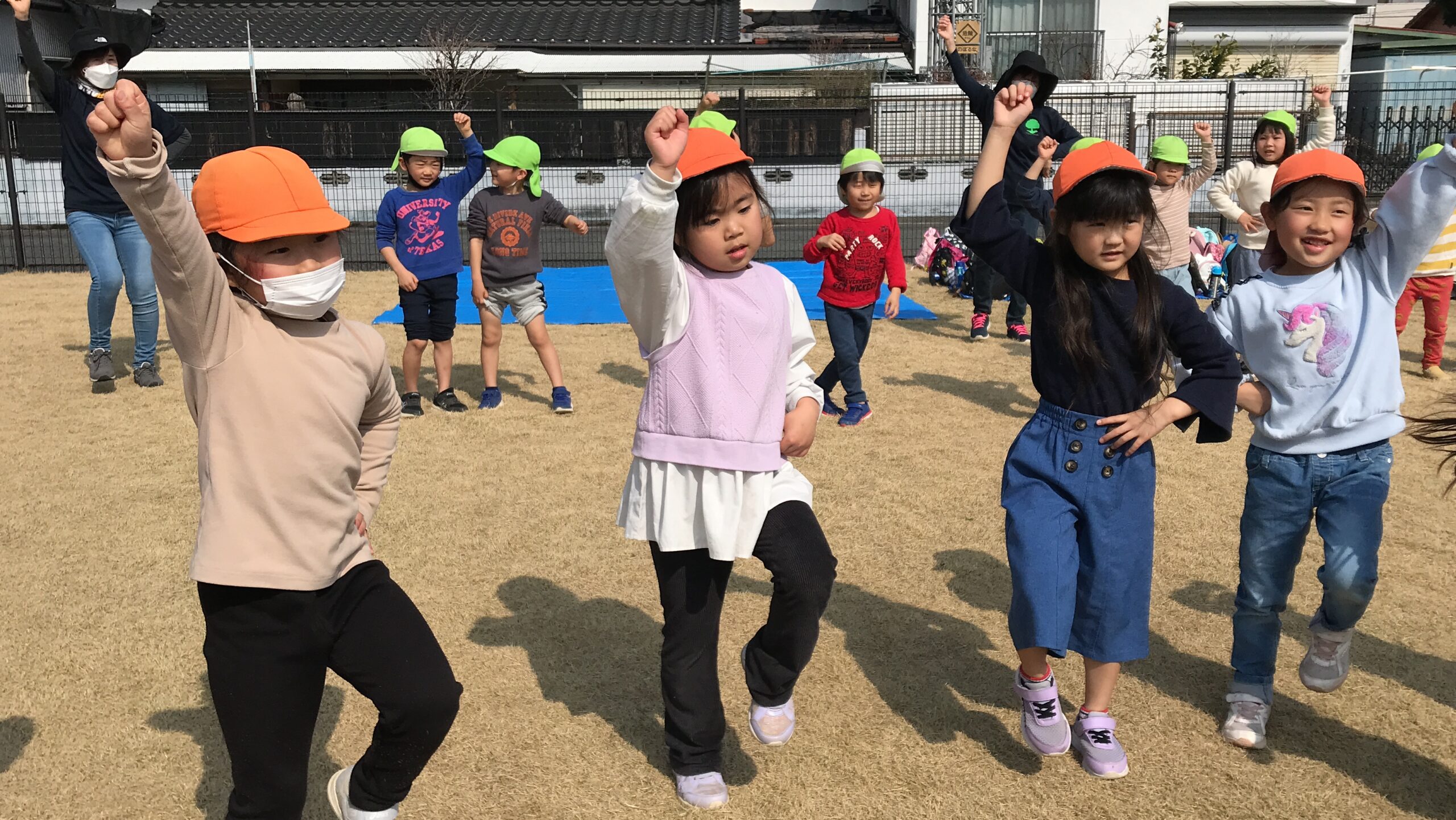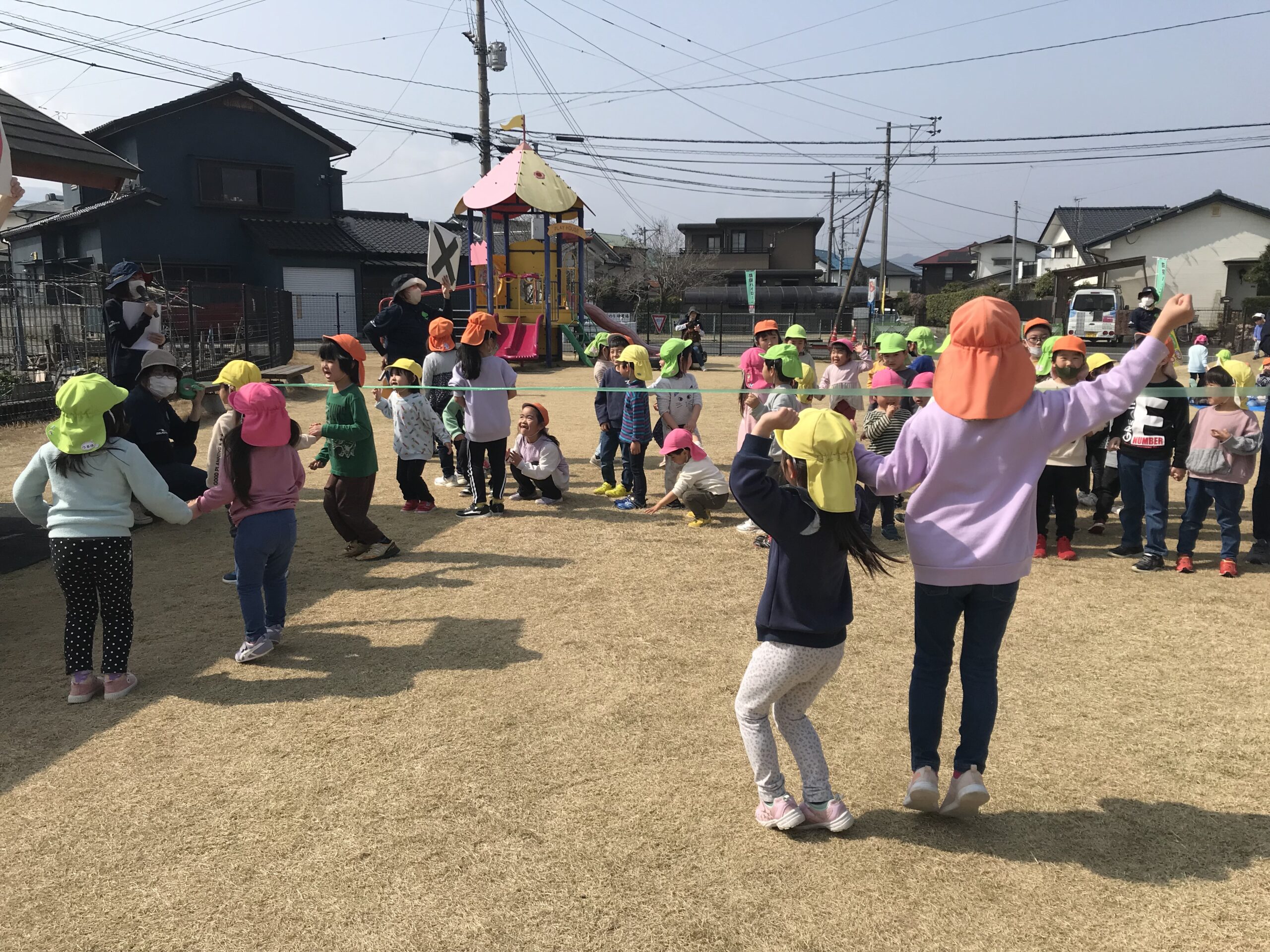お弁当におやつを持って出発です!お友達と手を繋いで丸の内公園まで楽しく歩きました。お天気も良く子ども達もニコニコです♪到着するとお楽しみ会が始まりました。ジャンボリーミッキーのダンスを踊ったり、丸の内こども園にちなんだ○×クイズを楽しみました。○×クイズでは、園庭の手押し車の数、マットの色などいつも側にあるけど意外と見ていない場所の難しいクイズもありましたが、子どもたちはよく見ています!難問も次々と正解していきます。全問正解のお友達には景品があり、盛り上がっていました♪