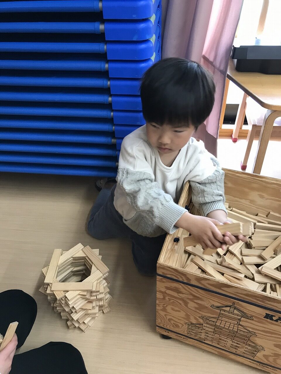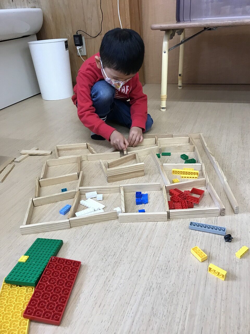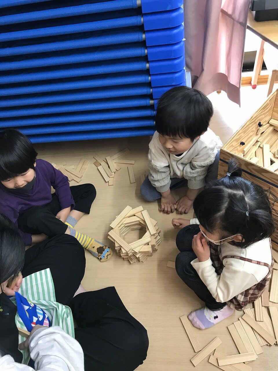 ブロックでは同じ色で車を造ったり立体の家を作る子もいれば、色々な積み木を使って家の中を想像しながら作る子もいました。