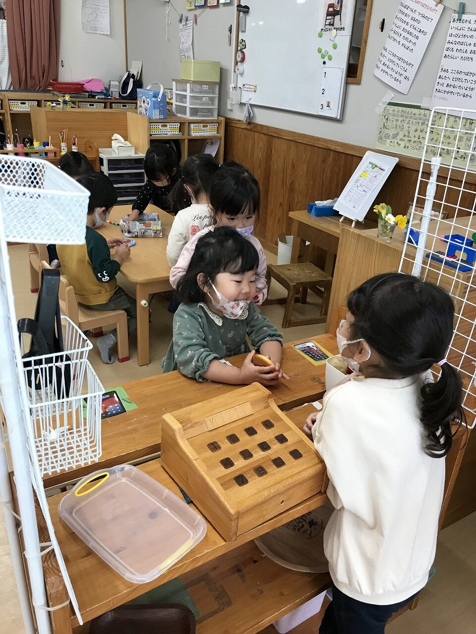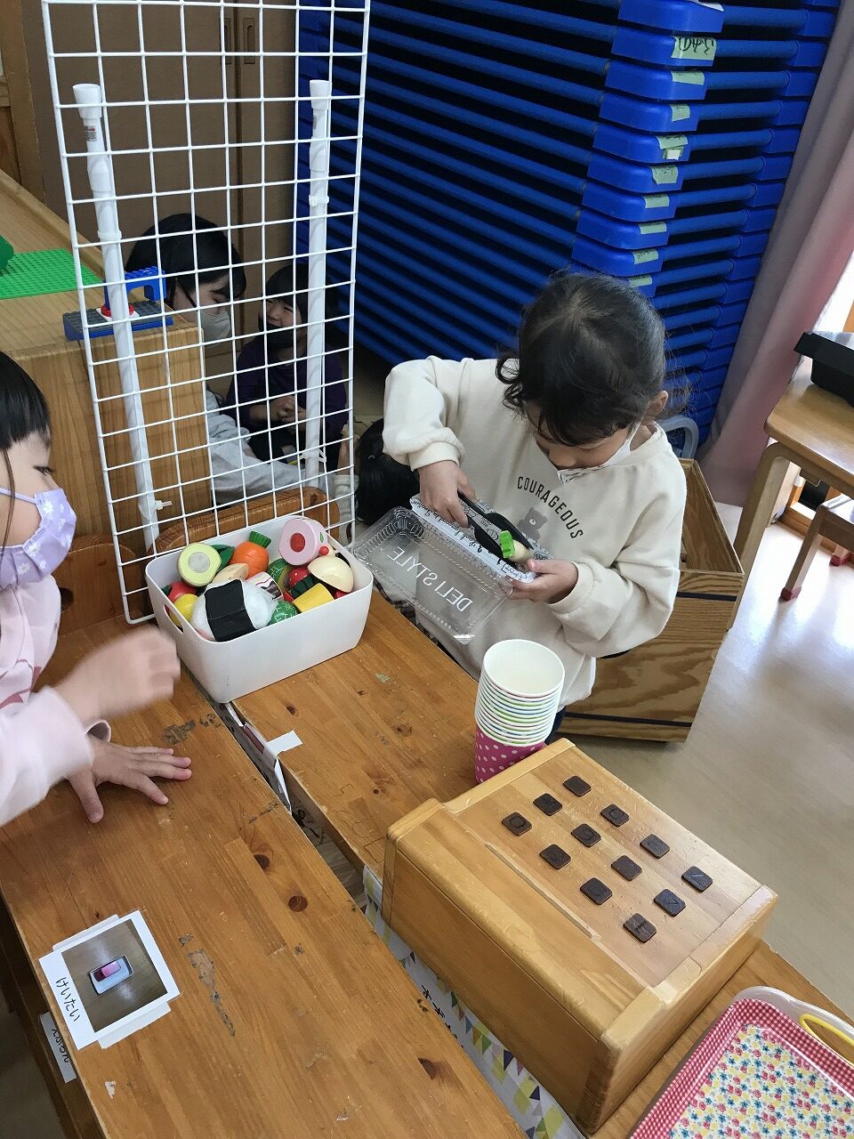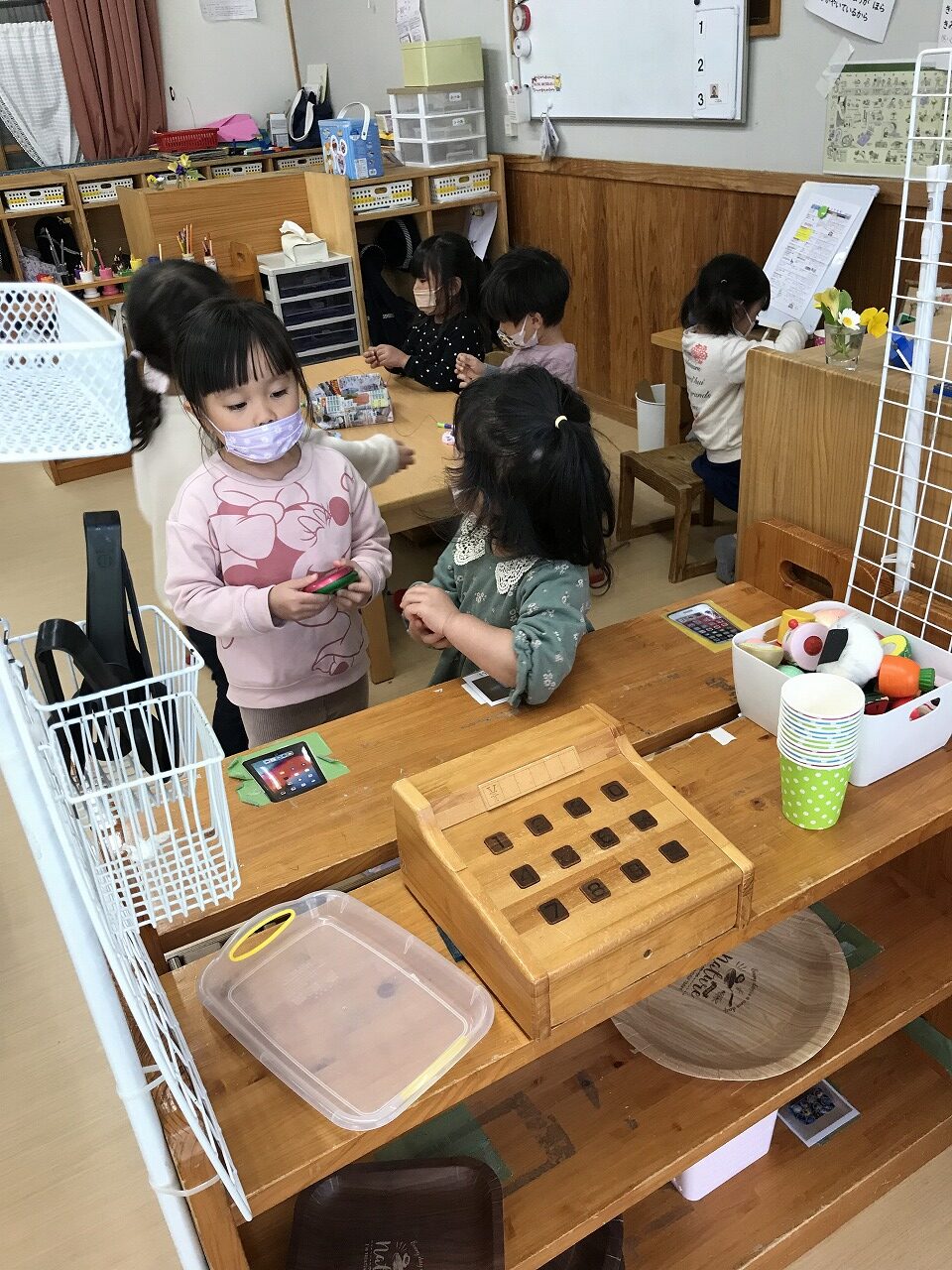 キッチンではお店屋さんごっこを行い「なにがいいですか?」とお弁当屋さんになりきっていました。