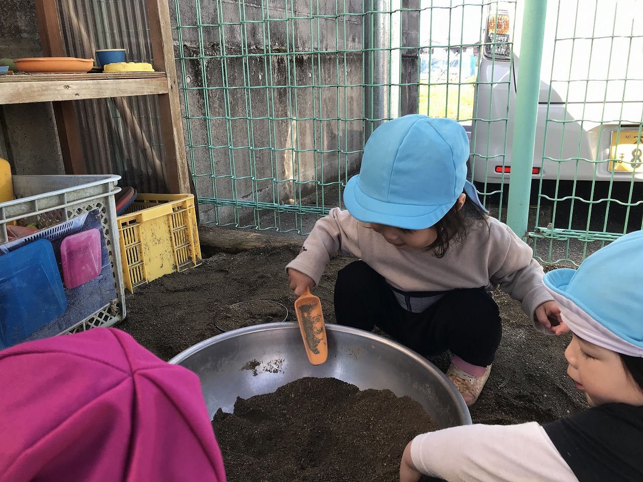 砂場で、ひよこ組(0歳児)さんと一緒にご飯づくりを楽しんだり、お友達と一緒に「ケーキ作ろうよ」とお話しながらごっこ遊びを楽しんでいたり、「押してあげるよー」とお友達の乗る三輪車を押してあげたり、一人で乗れるようになった子は自分でこいで乗り遊び楽しむ姿がたくさん見られました。