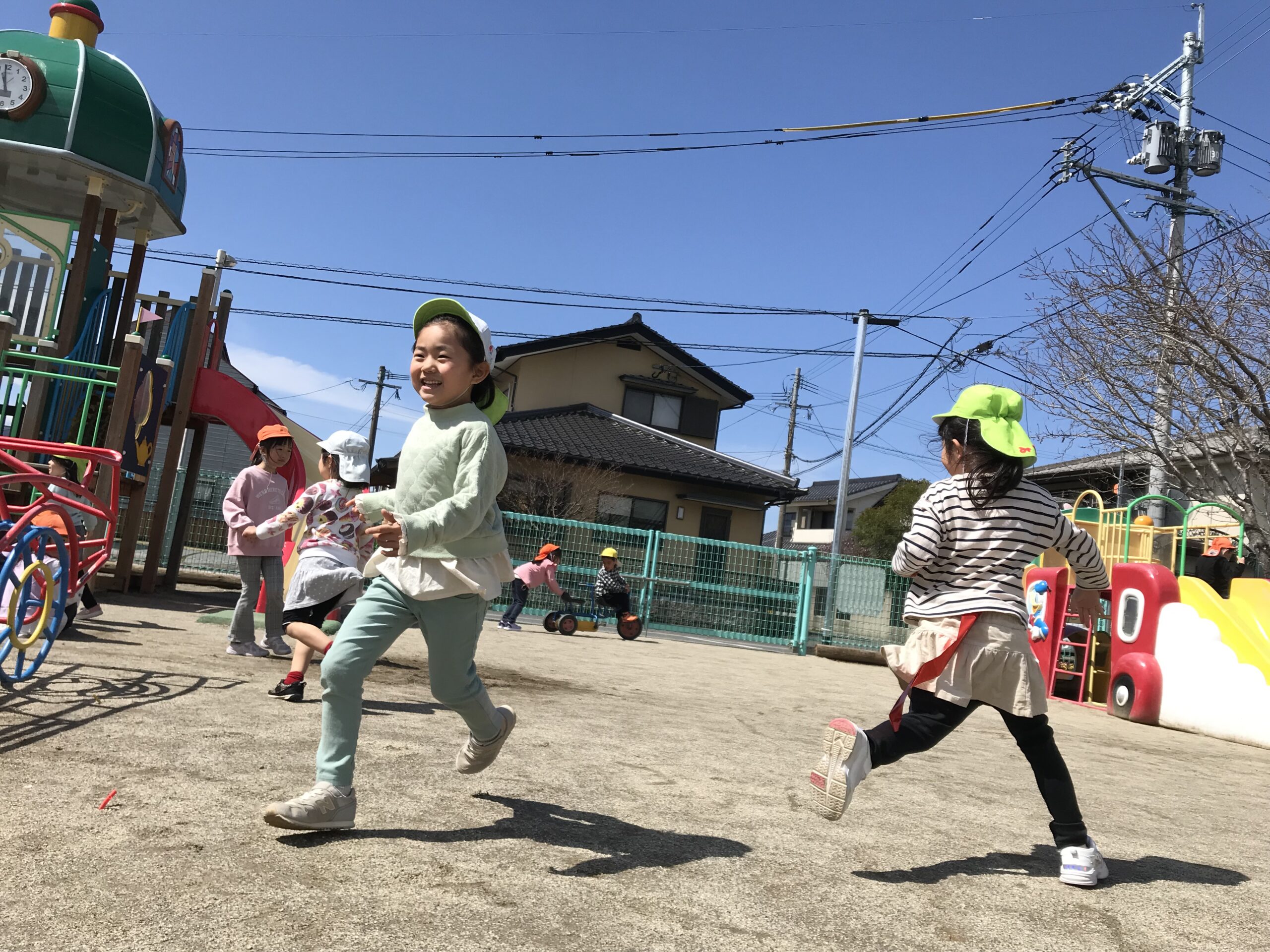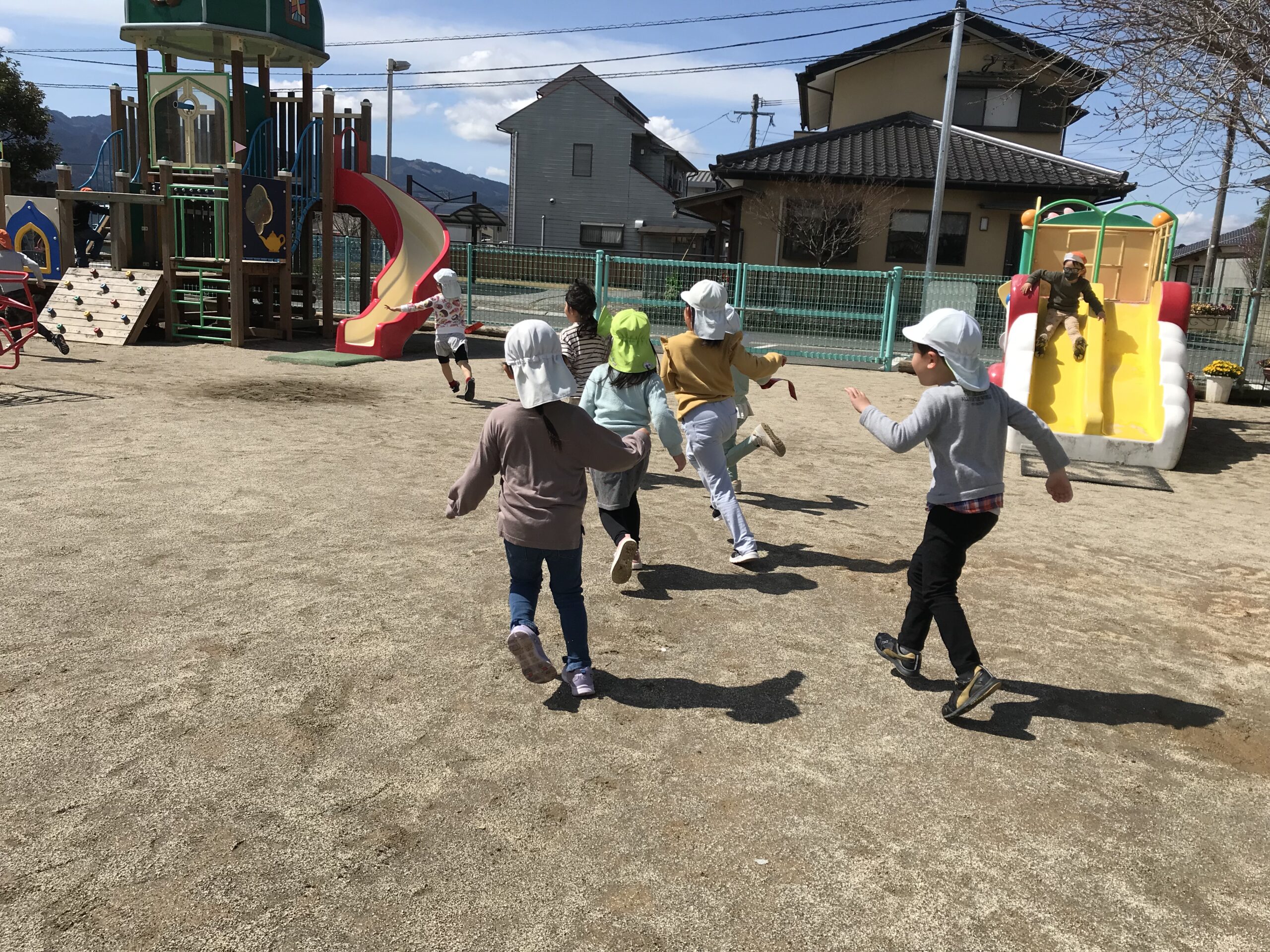 2チームに分かれてゲームスタート!園庭を思い切り走る子ども達。