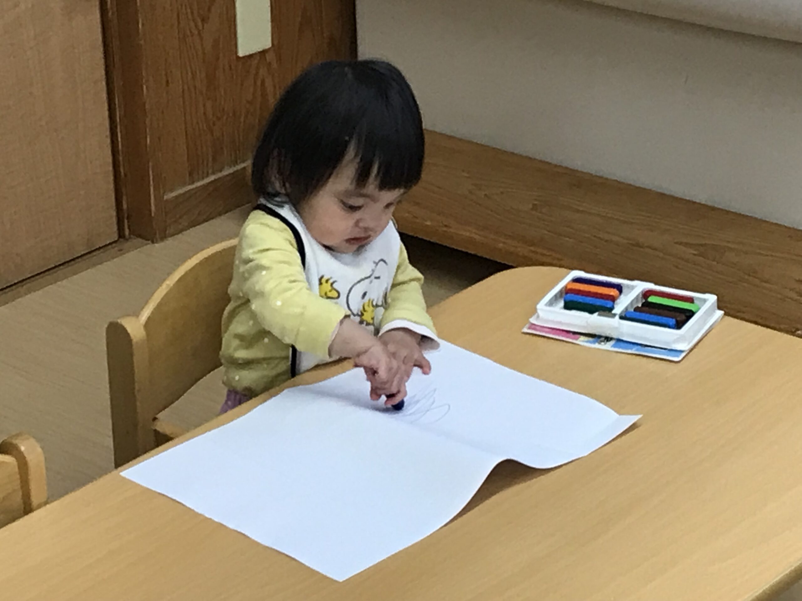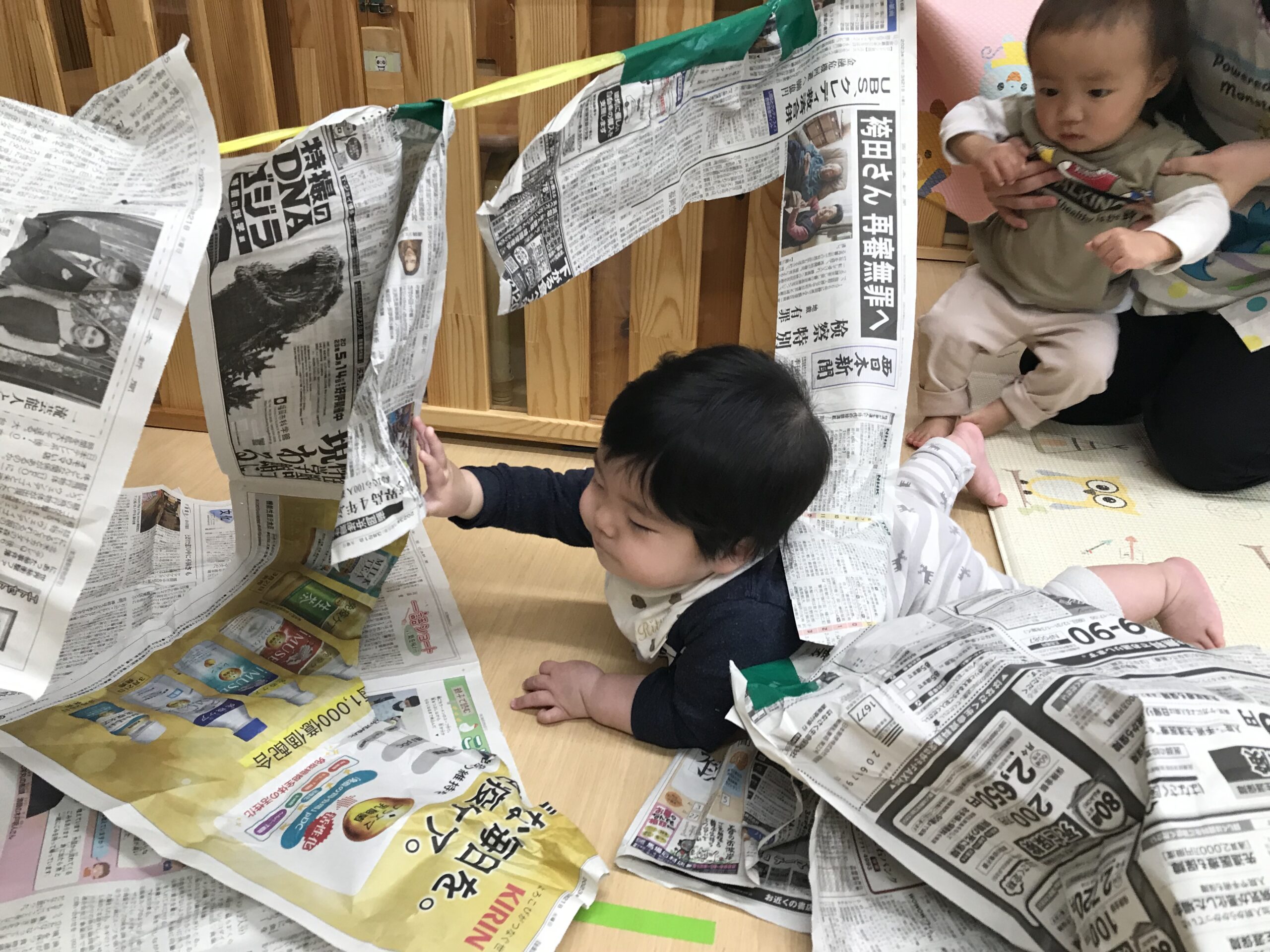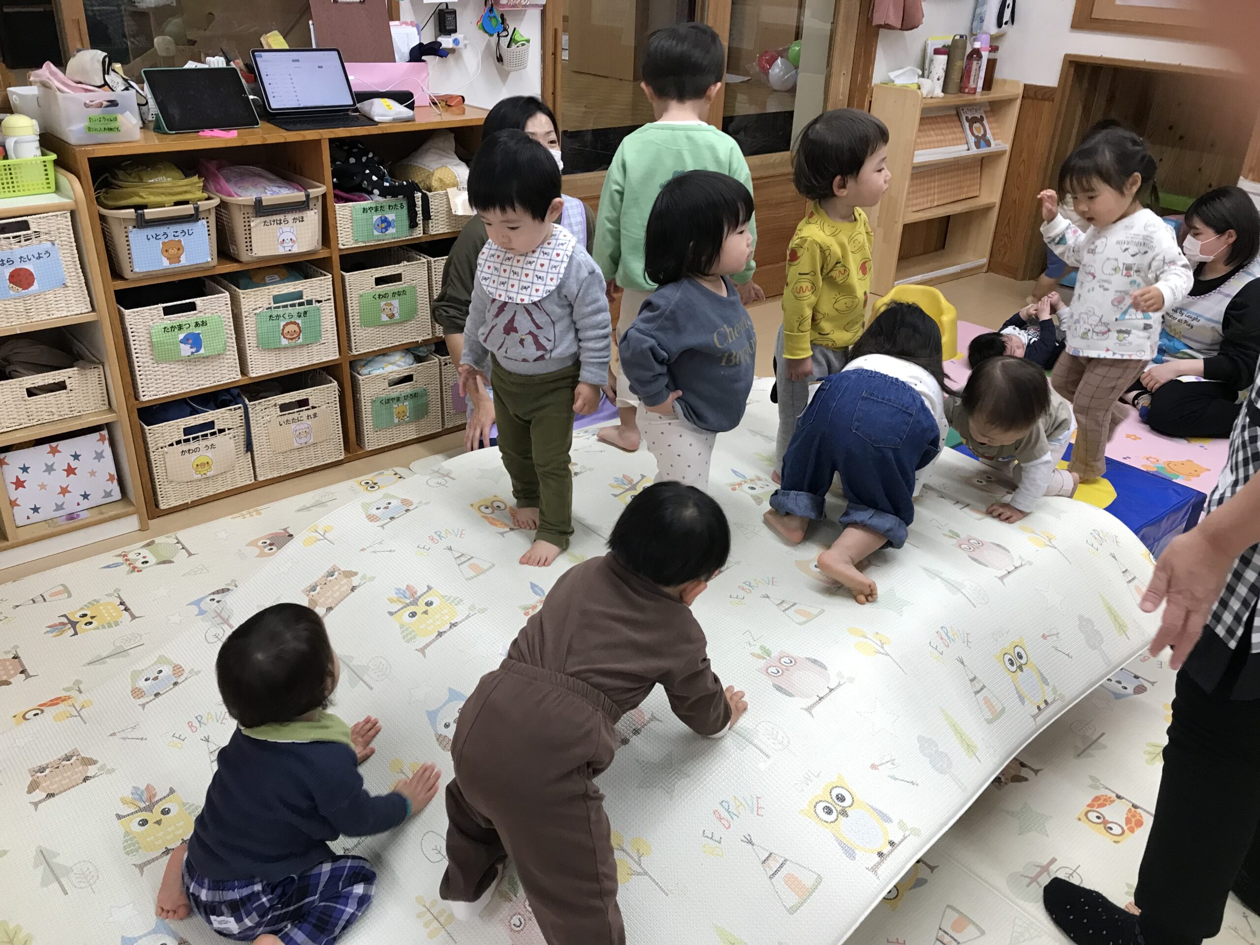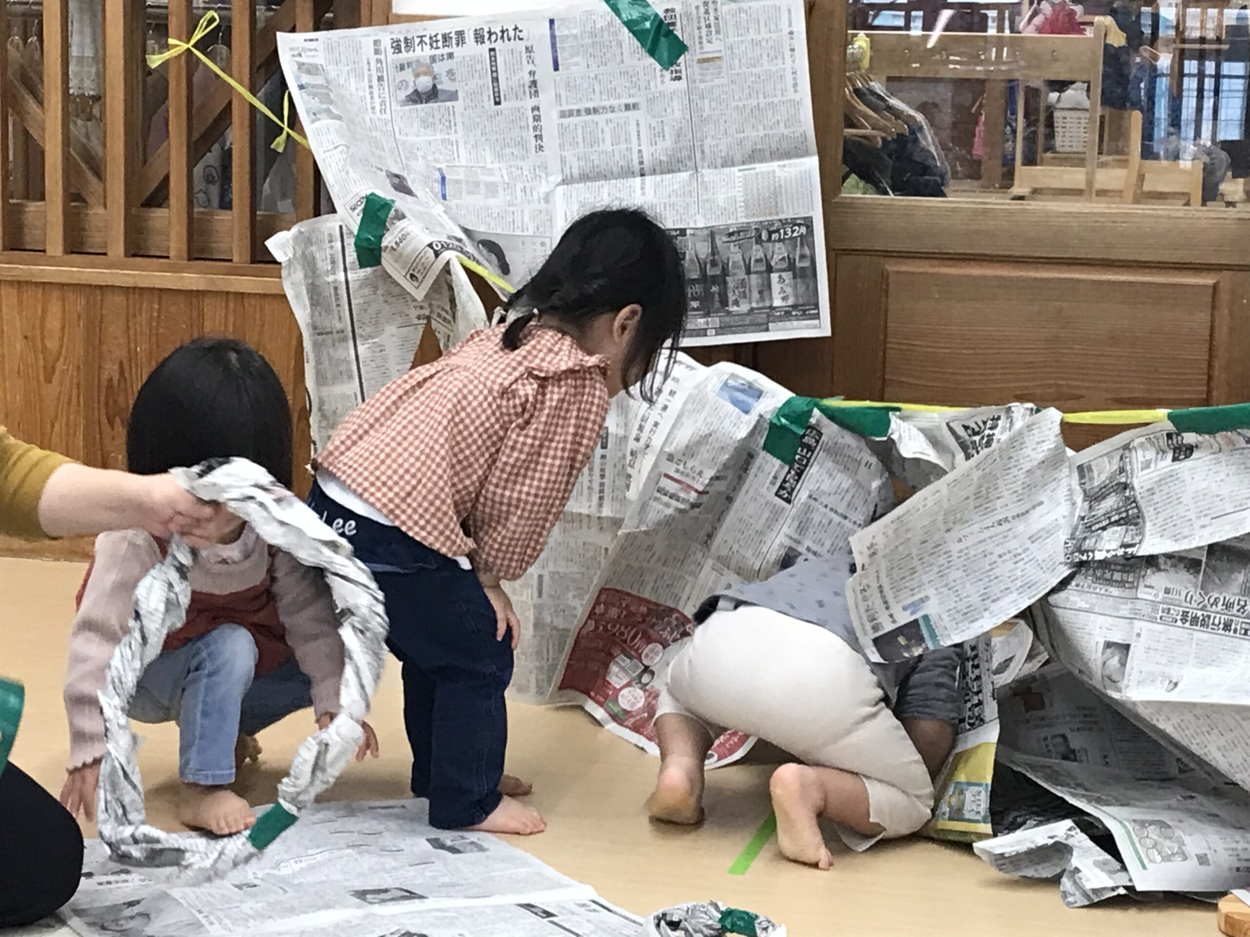 すみれ組(1歳児)とひよこ組(0歳児)は、雨天だったので、お部屋全体を広く使って一緒に室内遊びを楽しみました。いろんな遊びのコーナーを作り、粘土遊び・お絵描き・スタンプ遊び・新聞紙遊び・マットのお山・バスごっこ・他など、自分で好きな遊びを選び、「キャーキャー!」と夢中になって汗をかきながら、思いっきり楽しめていました。異年齢で触れ合って遊ぶ良い体験ができ、一緒に仲良く遊ぶ姿も見られ、とっても微笑ましかったです。