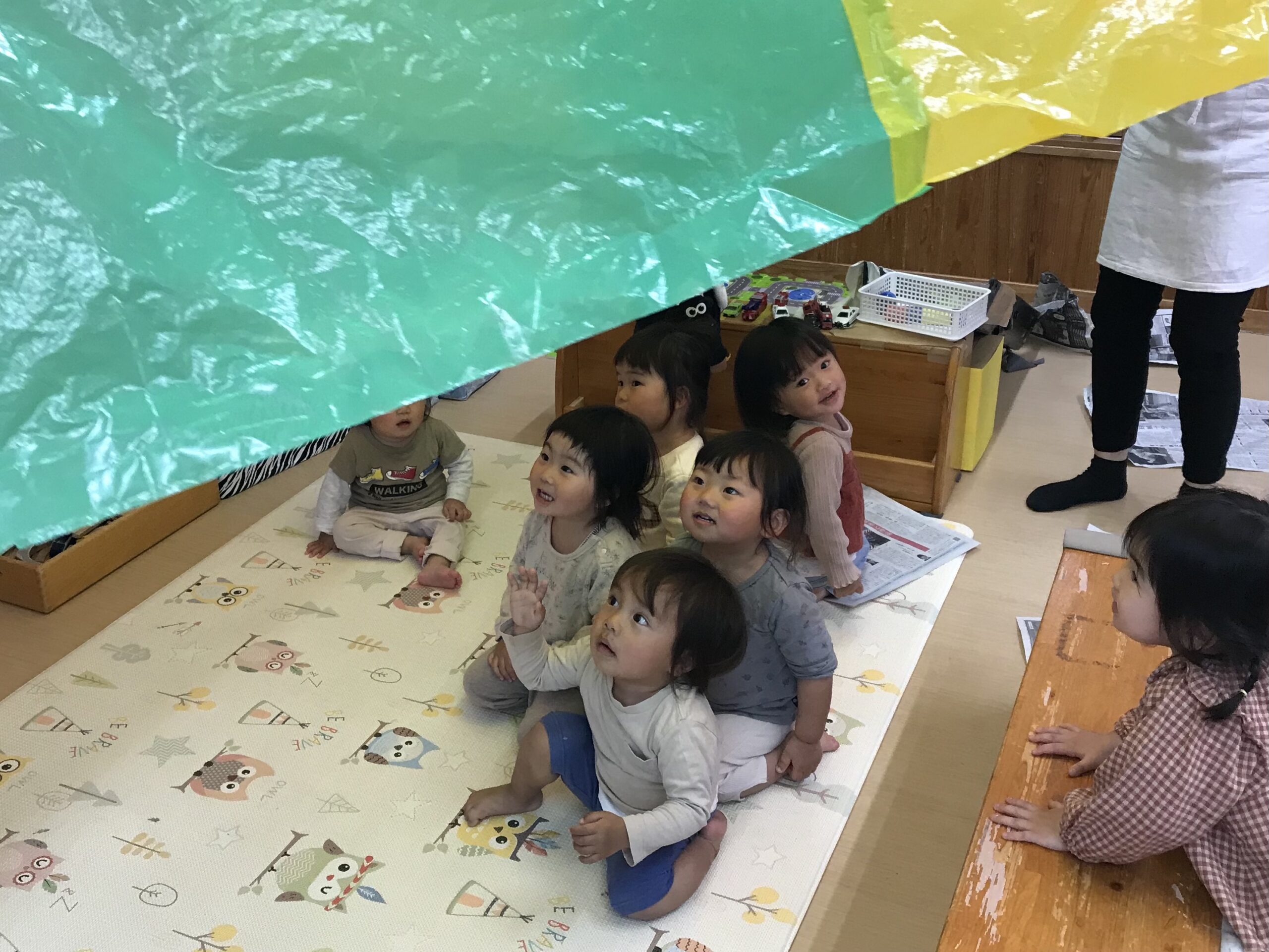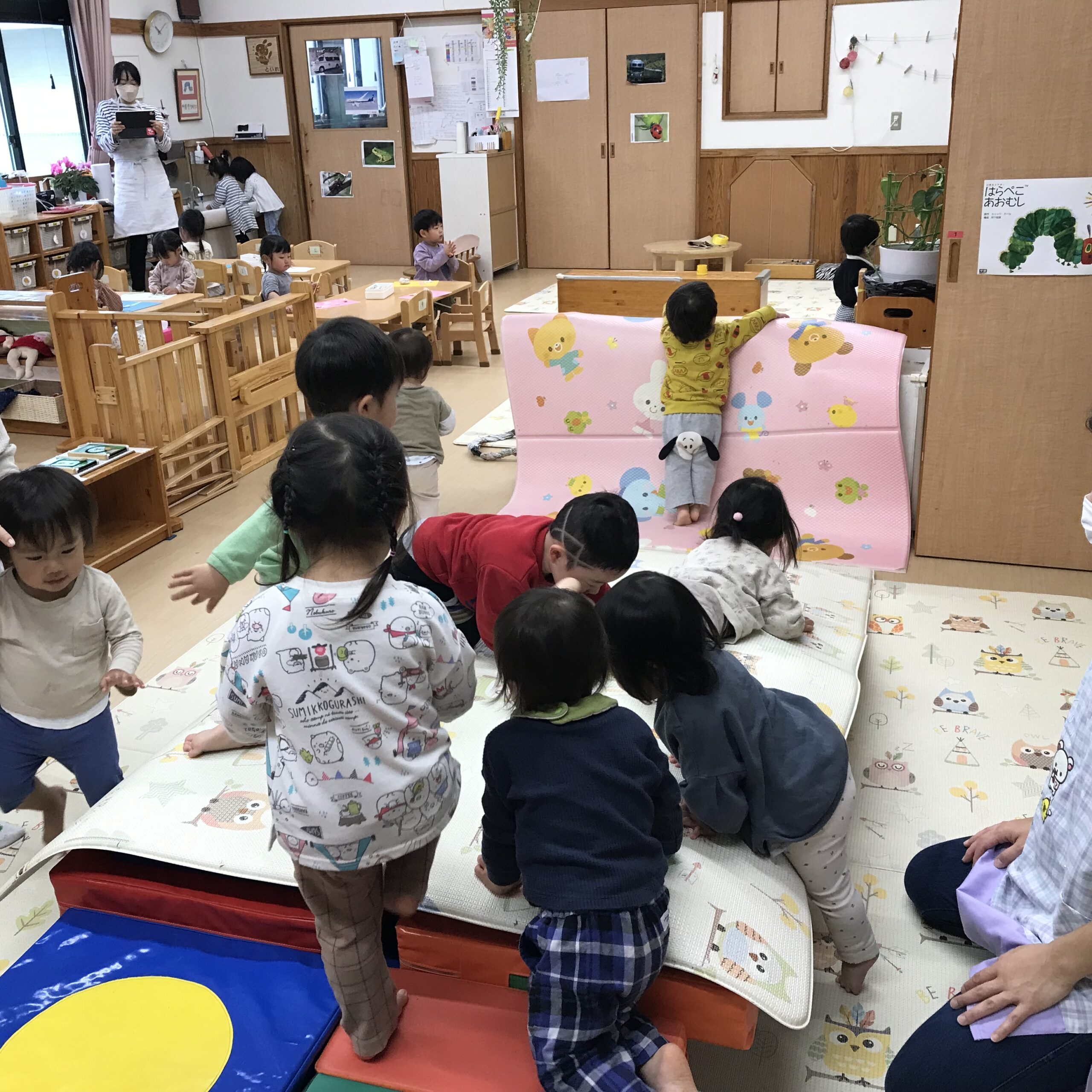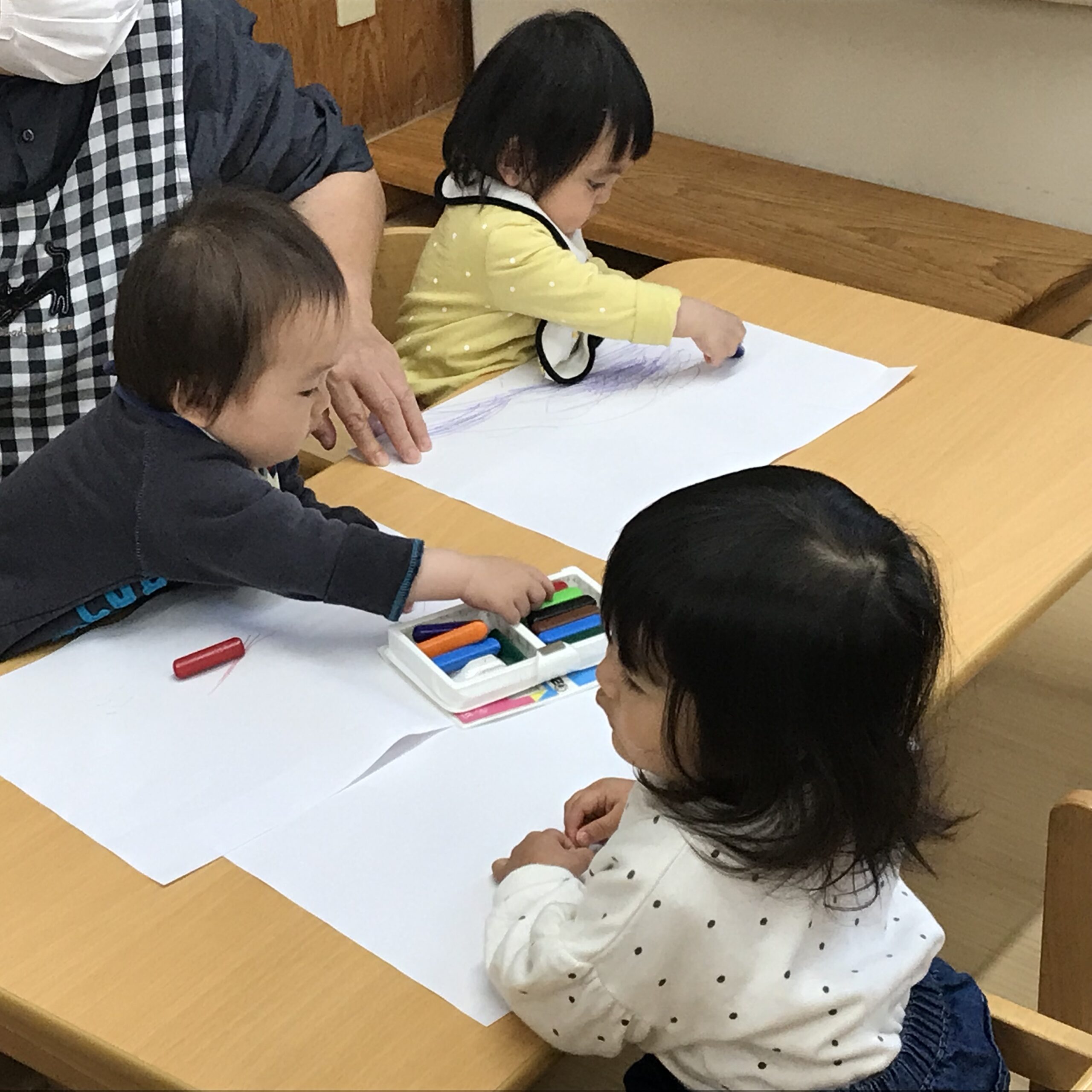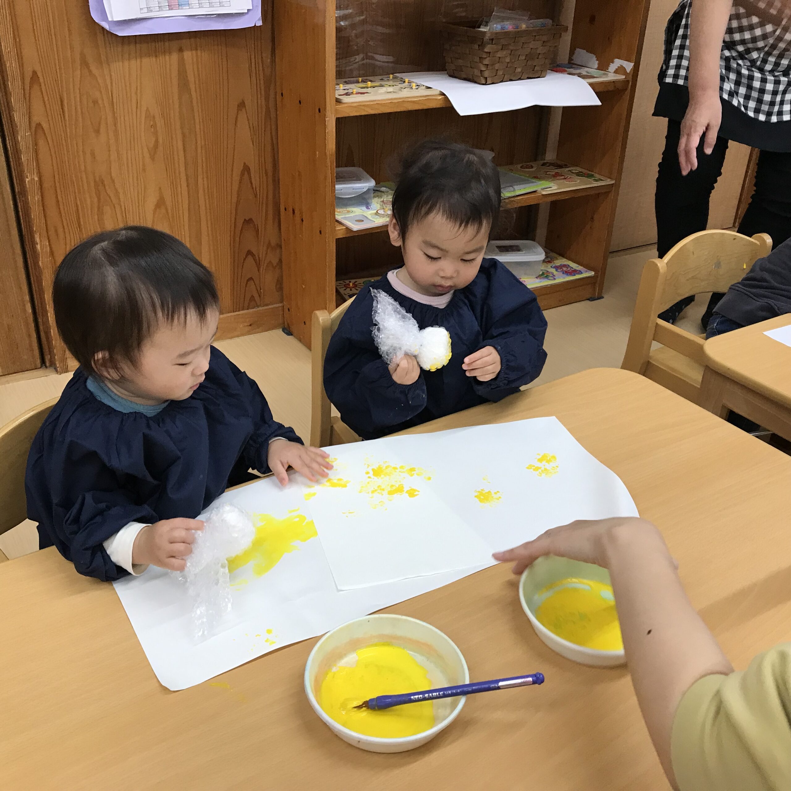 すみれ組(1歳児)とひよこ組(0歳児)は、雨天だったので、お部屋全体を広く使って一緒に室内遊びを楽しみました。いろんな遊びのコーナーを作り、粘土遊び・お絵描き・スタンプ遊び・新聞紙遊び・マットのお山・バスごっこ・他など、自分で好きな遊びを選び、「キャーキャー!」と夢中になって汗をかきながら、思いっきり楽しめていました。異年齢で触れ合って遊ぶ良い体験ができ、一緒に仲良く遊ぶ姿も見られ、とっても微笑ましかったです。