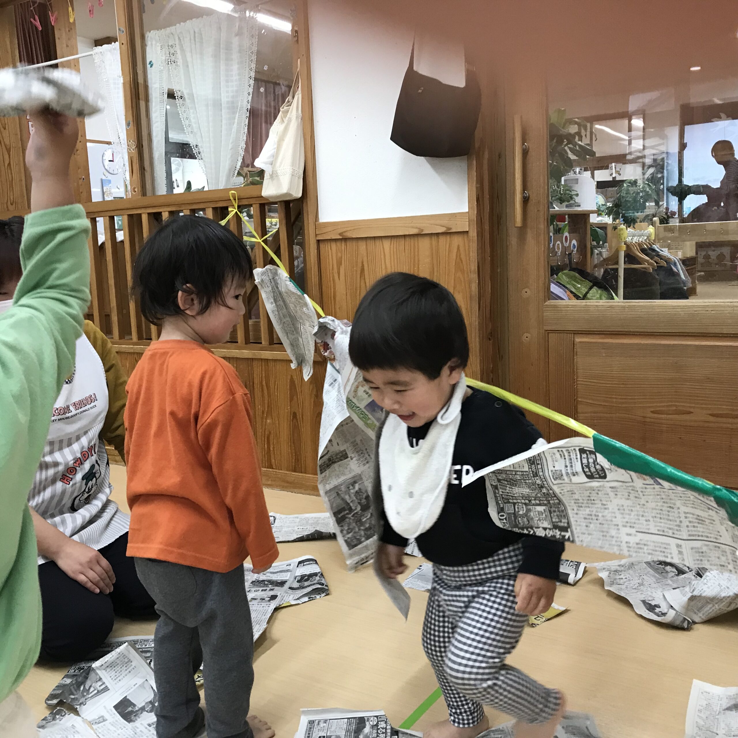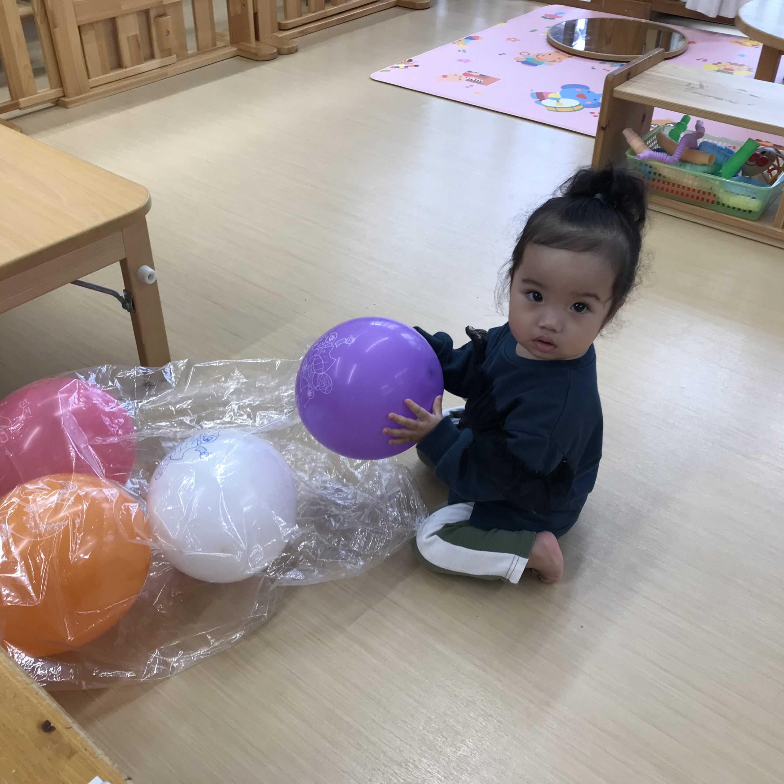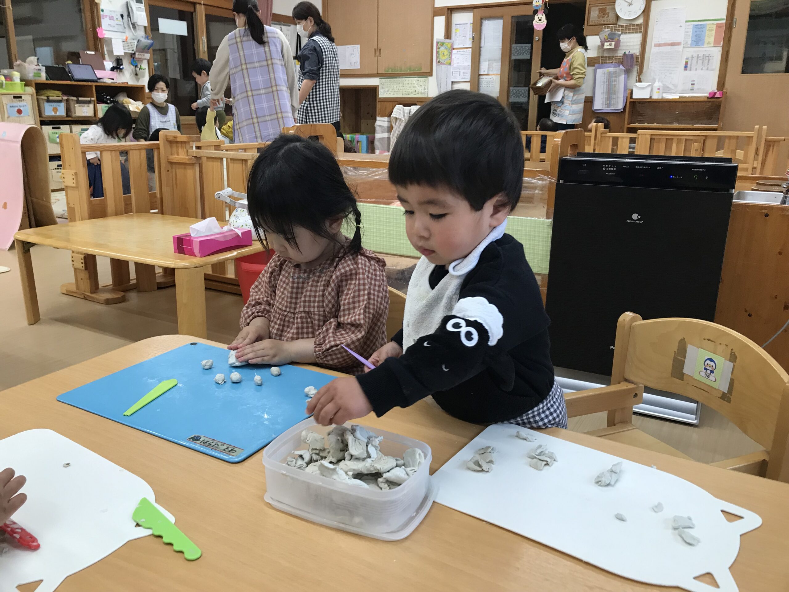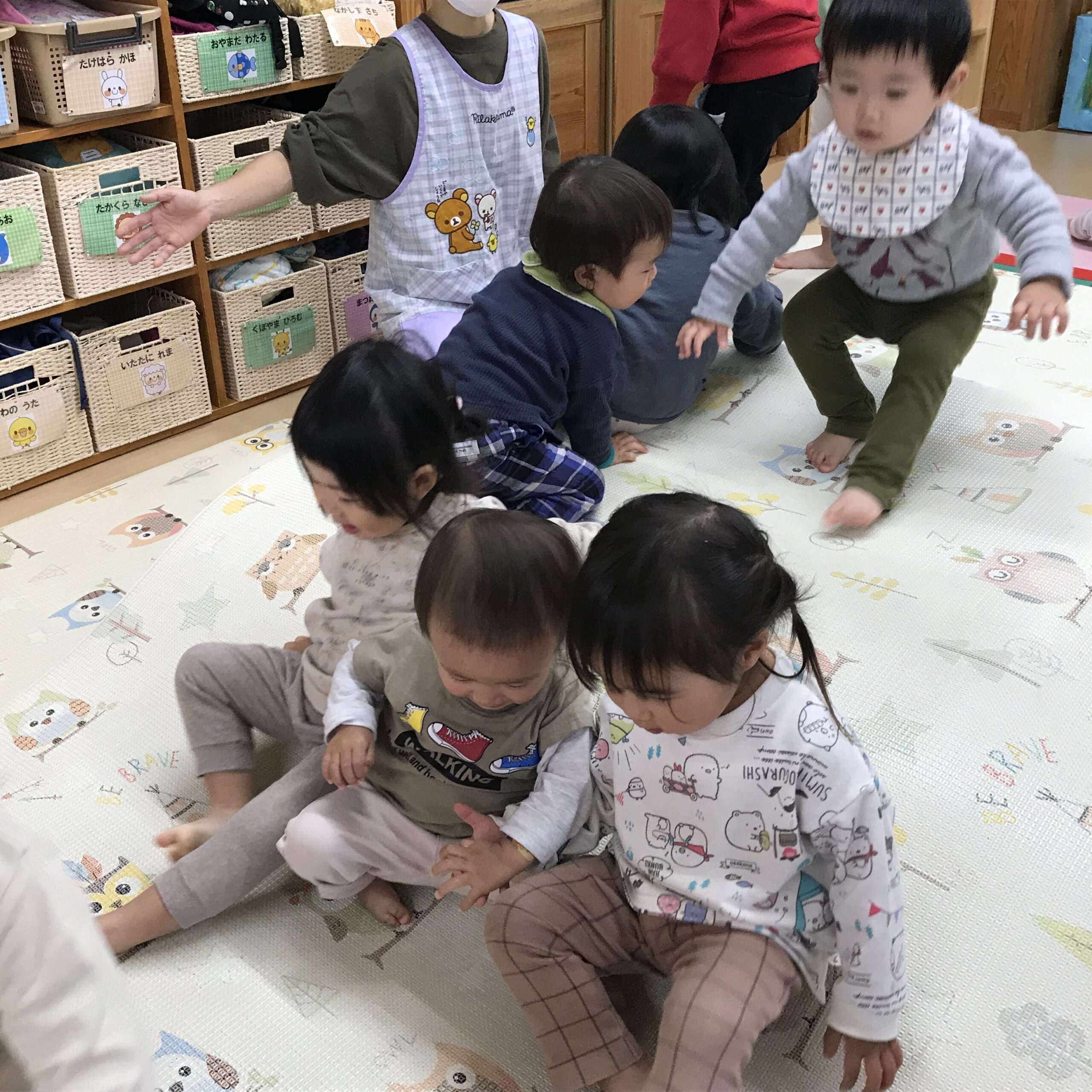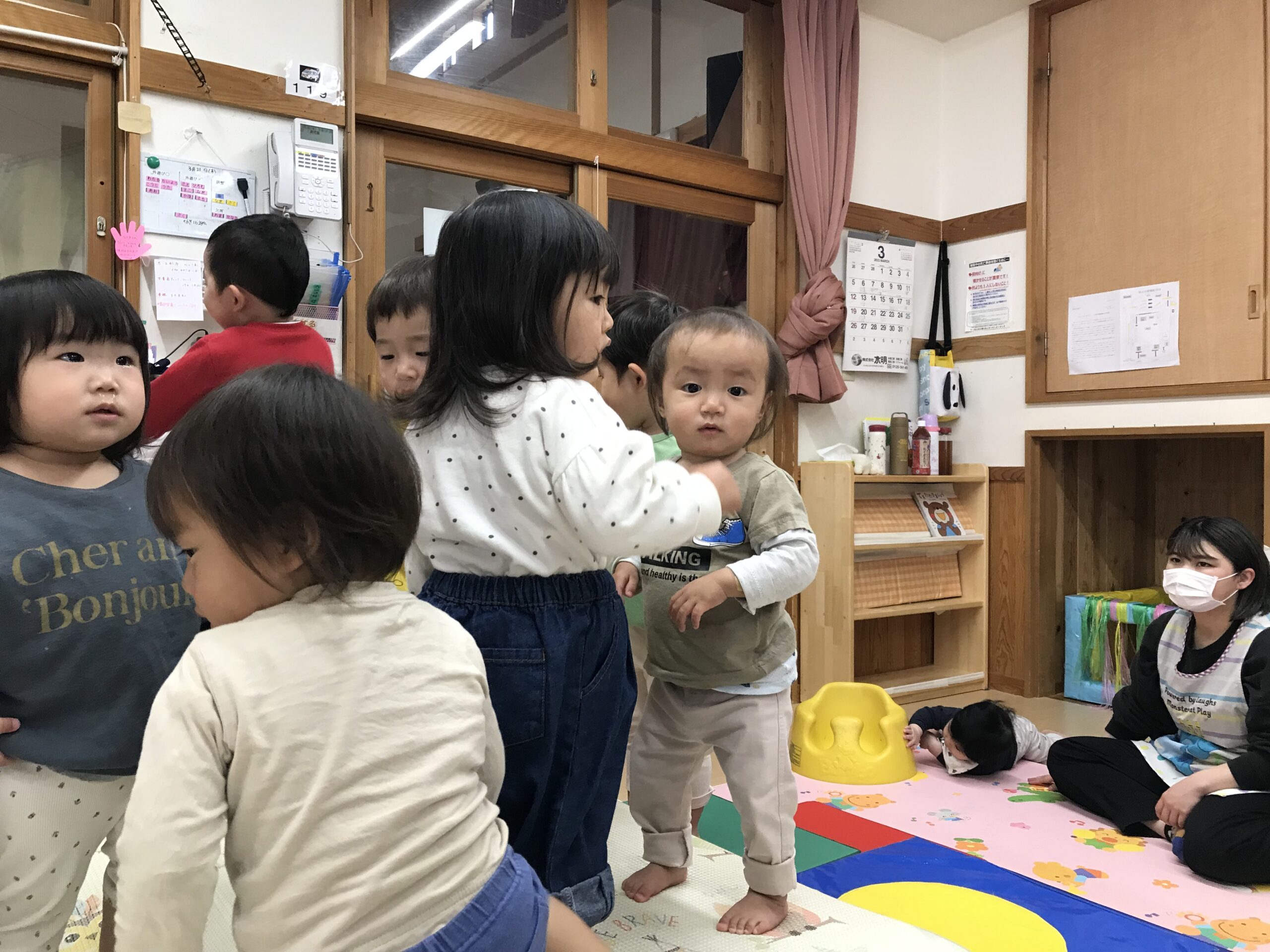 すみれ組(1歳児)とひよこ組(0歳児)は、雨天だったので、お部屋全体を広く使って一緒に室内遊びを楽しみました。いろんな遊びのコーナーを作り、粘土遊び・お絵描き・スタンプ遊び・新聞紙遊び・マットのお山・バスごっこ・他など、自分で好きな遊びを選び、「キャーキャー!」と夢中になって汗をかきながら、思いっきり楽しめていました。異年齢で触れ合って遊ぶ良い体験ができ、一緒に仲良く遊ぶ姿も見られ、とっても微笑ましかったです。