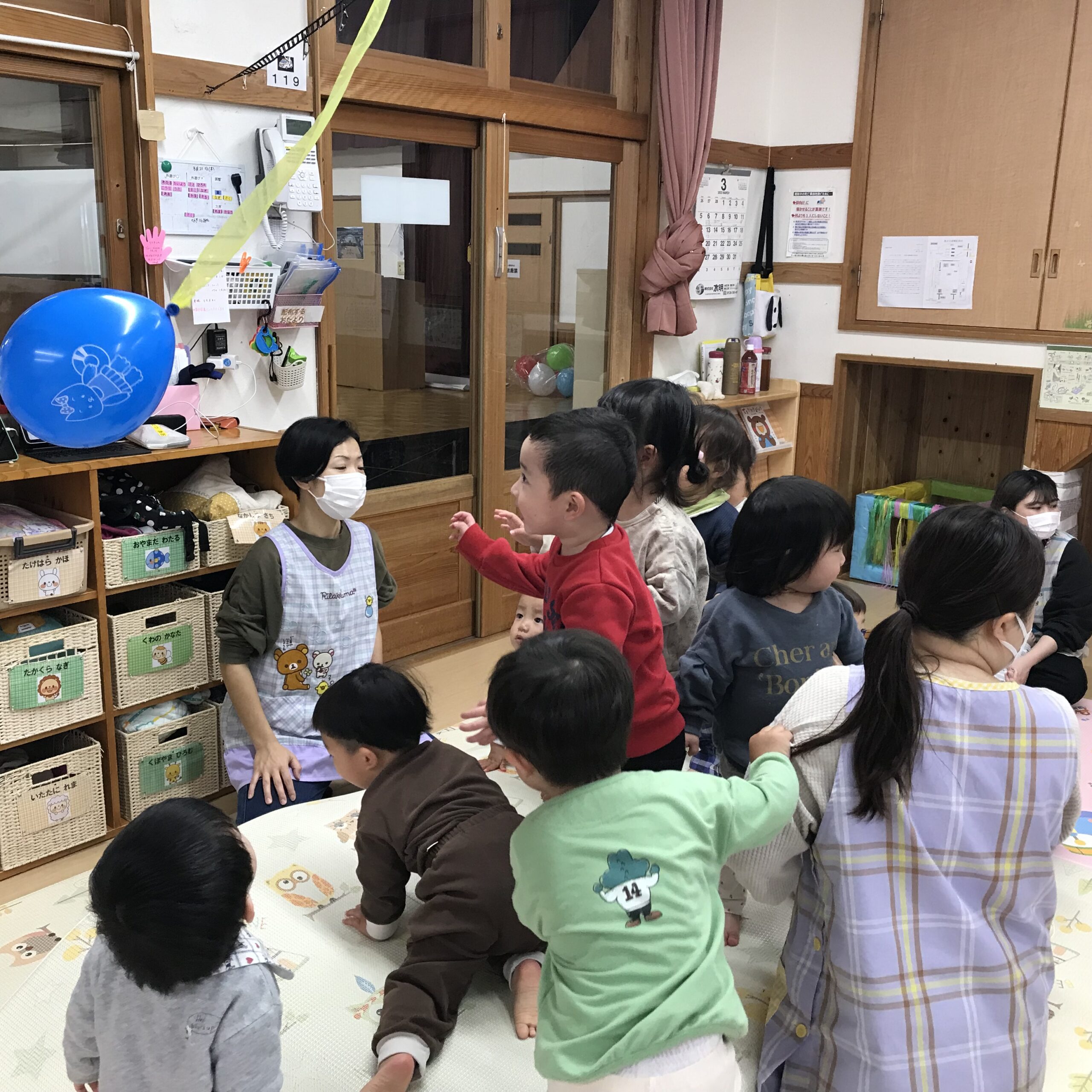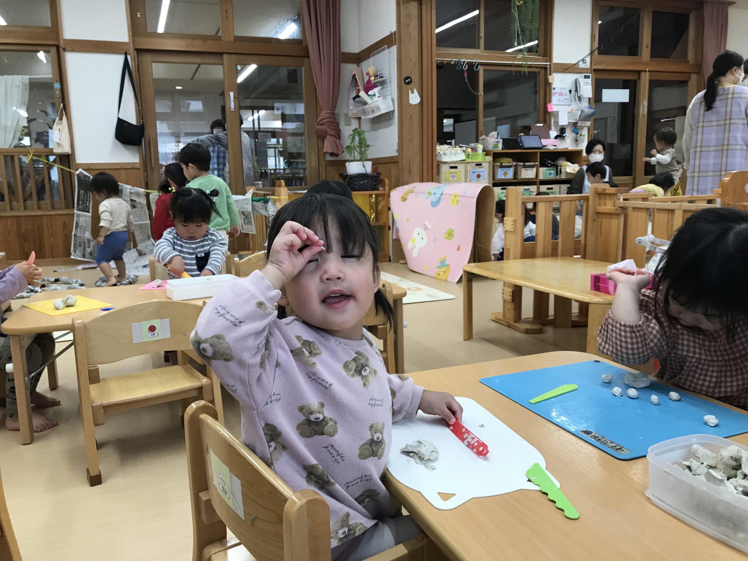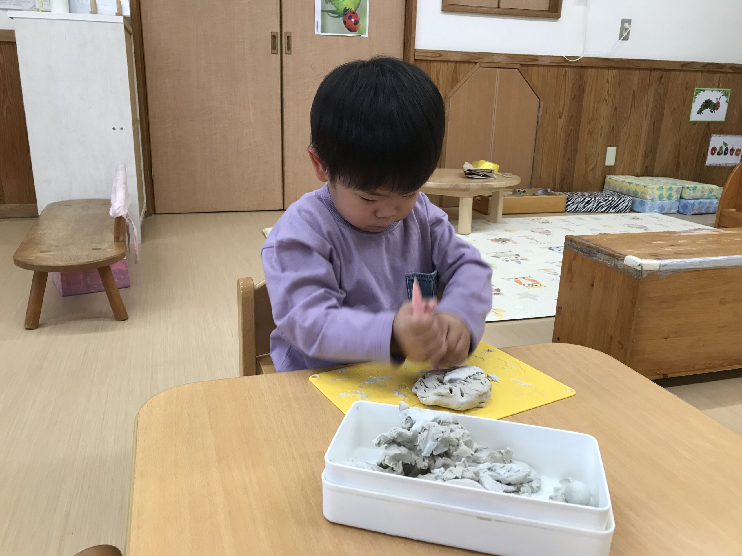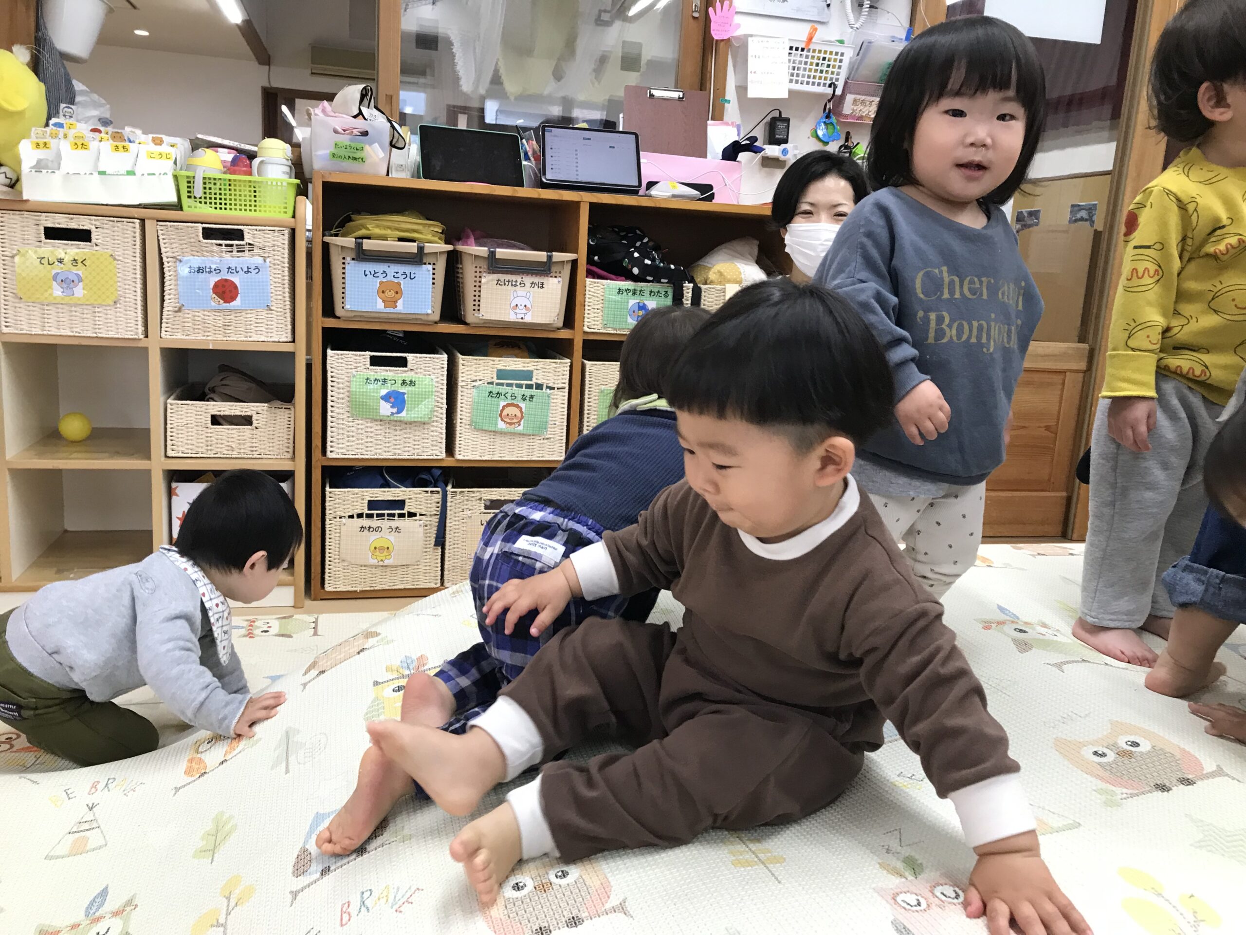 すみれ組(1歳児)とひよこ組(0歳児)は、雨天だったので、お部屋全体を広く使って一緒に室内遊びを楽しみました。いろんな遊びのコーナーを作り、粘土遊び・お絵描き・スタンプ遊び・新聞紙遊び・マットのお山・バスごっこ・他など、自分で好きな遊びを選び、「キャーキャー!」と夢中になって汗をかきながら、思いっきり楽しめていました。異年齢で触れ合って遊ぶ良い体験ができ、一緒に仲良く遊ぶ姿も見られ、とっても微笑ましかったです。