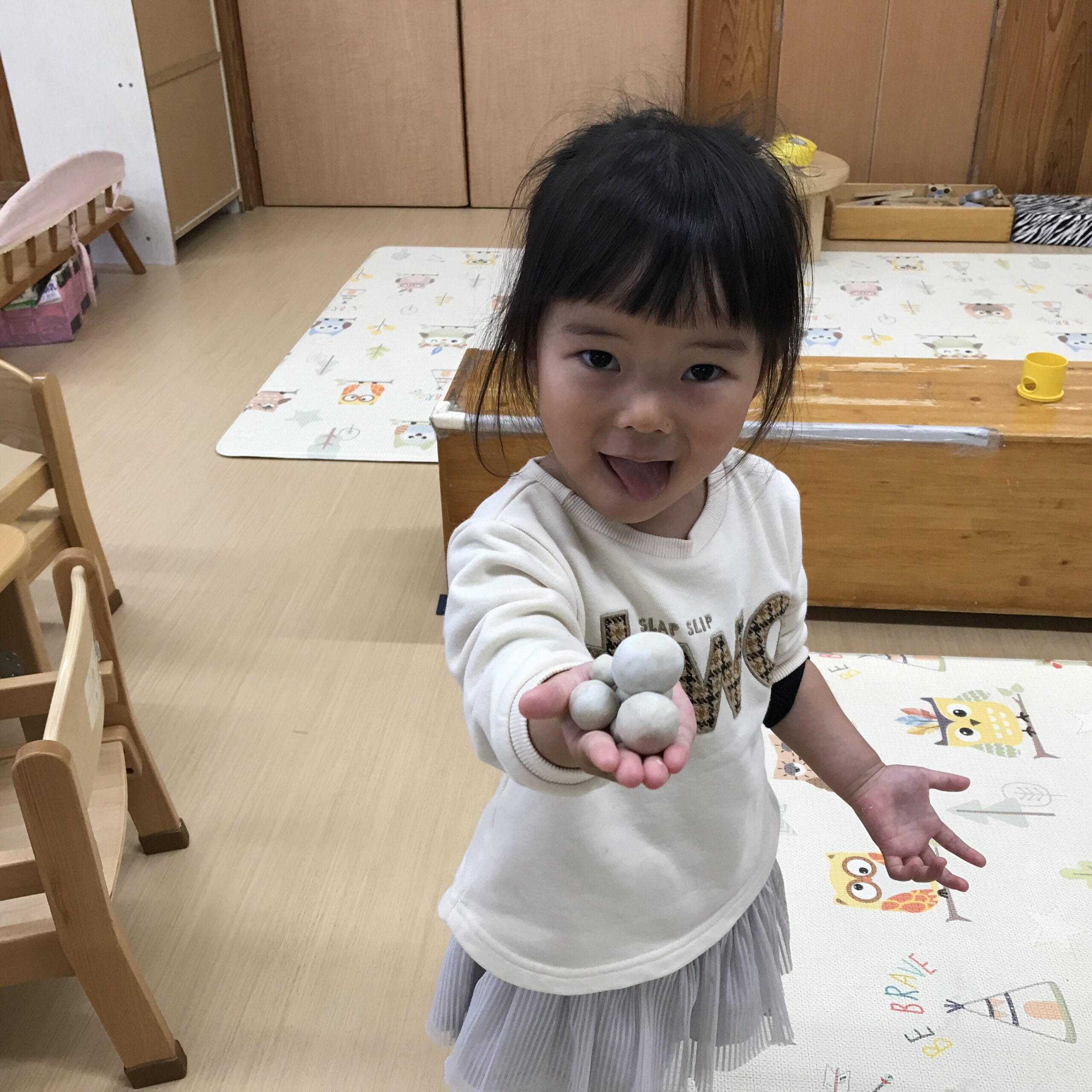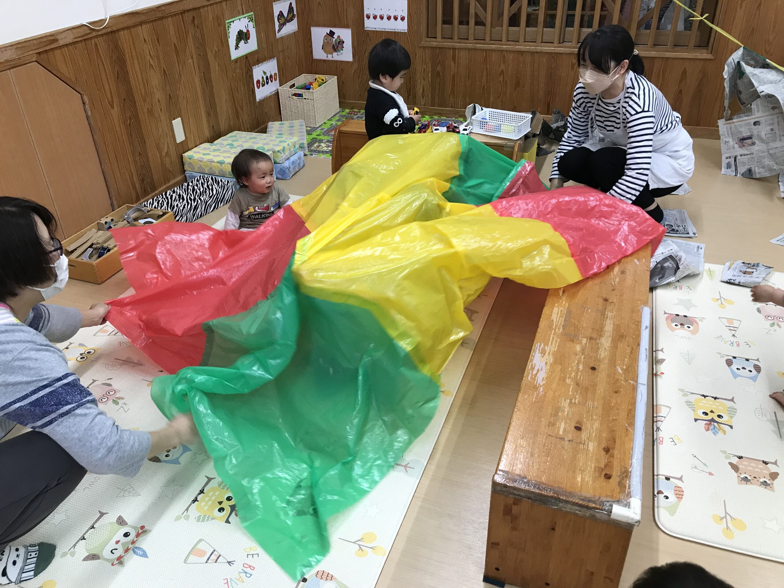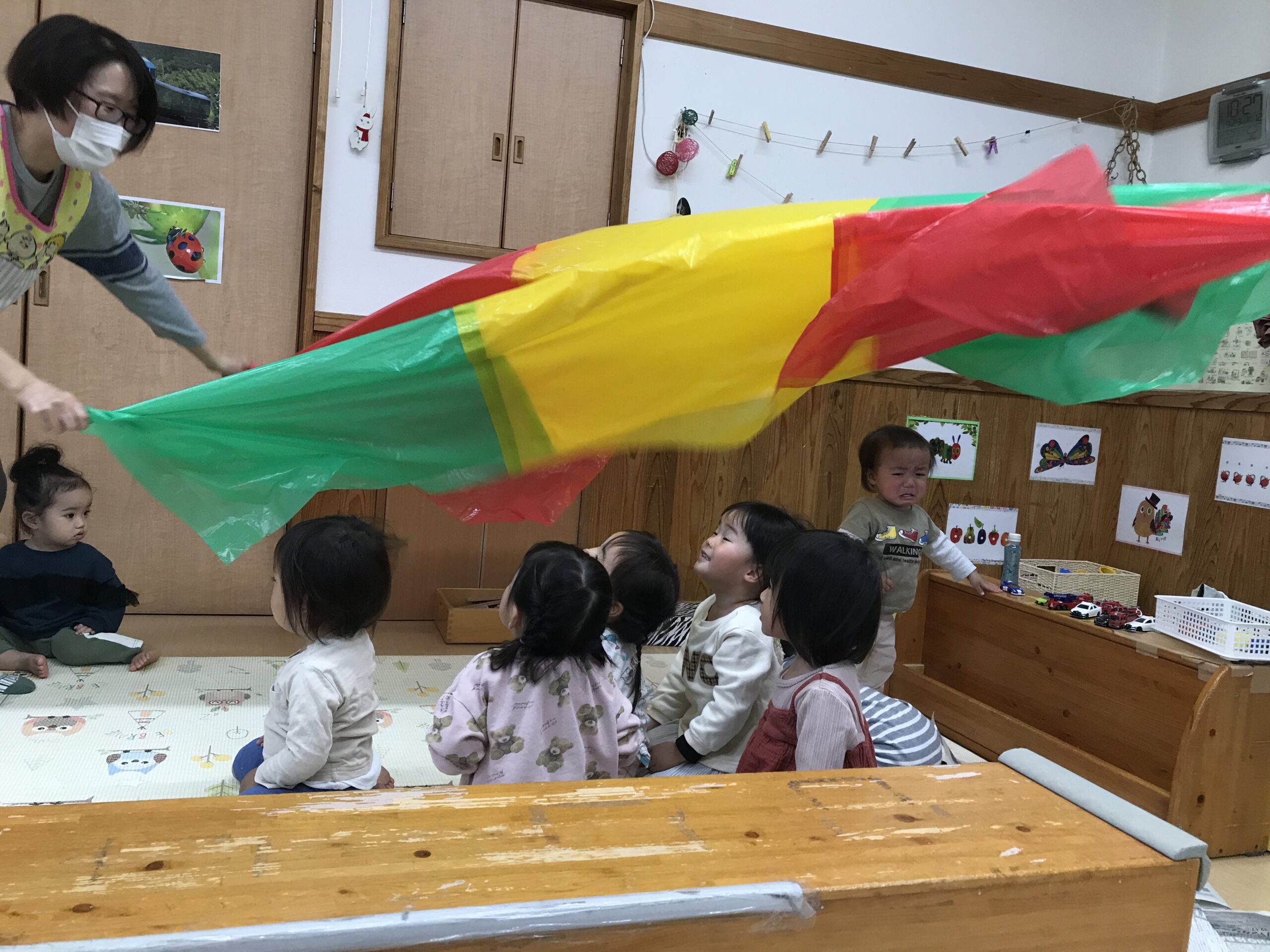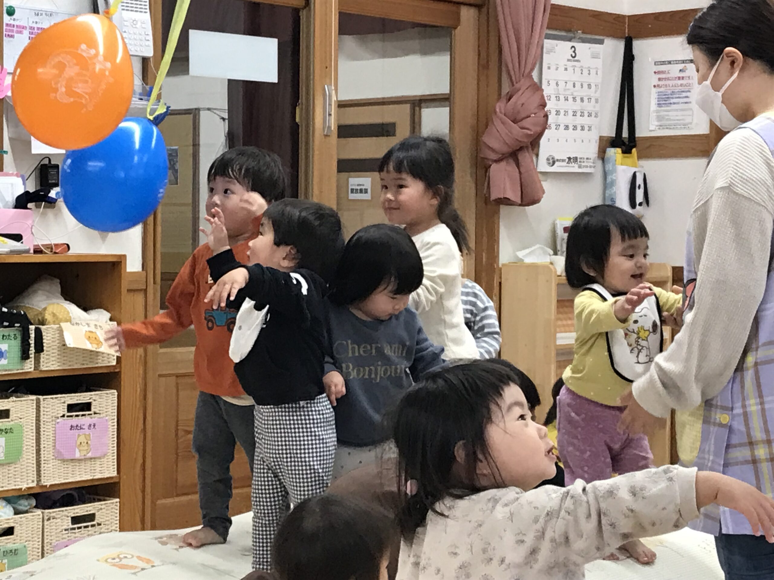 すみれ組(1歳児)とひよこ組(0歳児)は、雨天だったので、お部屋全体を広く使って一緒に室内遊びを楽しみました。いろんな遊びのコーナーを作り、粘土遊び・お絵描き・スタンプ遊び・新聞紙遊び・マットのお山・バスごっこ・他など、自分で好きな遊びを選び、「キャーキャー!」と夢中になって汗をかきながら、思いっきり楽しめていました。異年齢で触れ合って遊ぶ良い体験ができ、一緒に仲良く遊ぶ姿も見られ、とっても微笑ましかったです。
