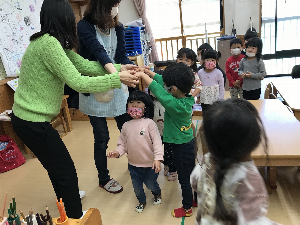 「ハロー」と挨拶から始まり英語の曲に合わせ身体を動かしました。