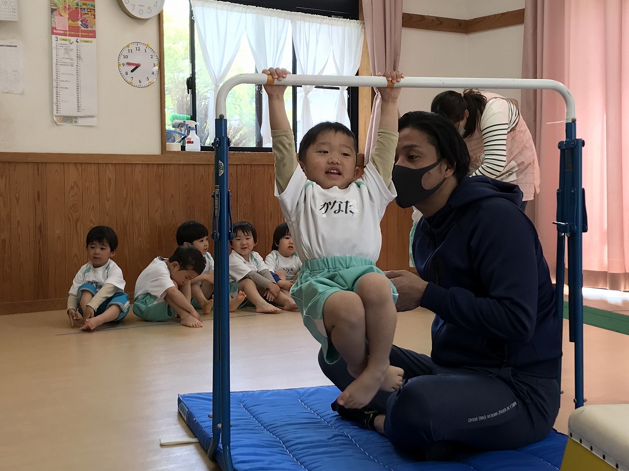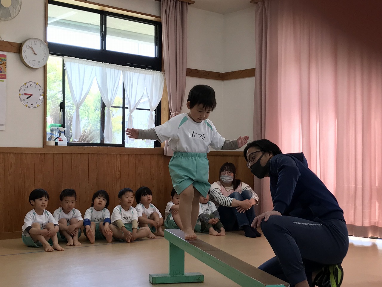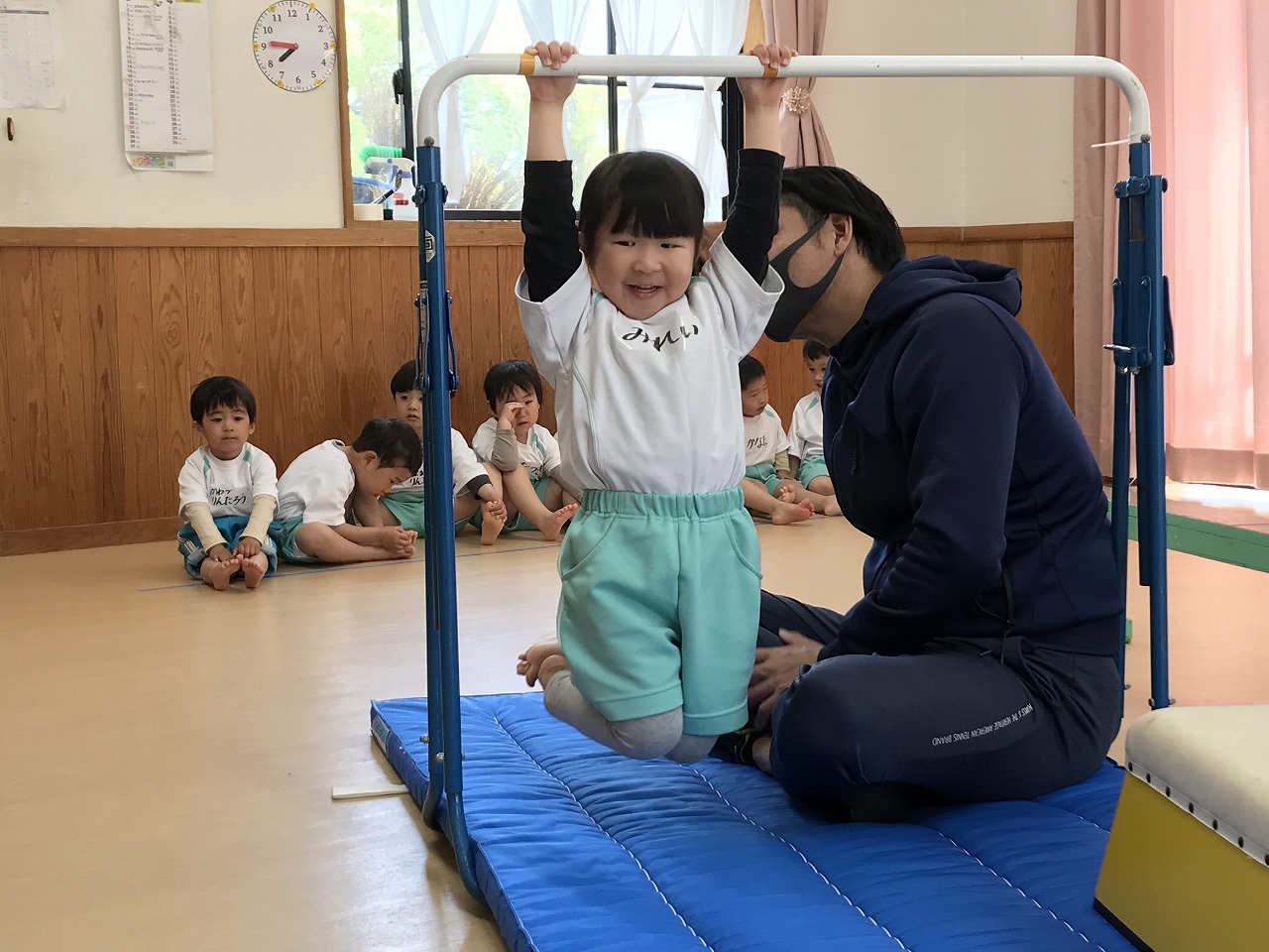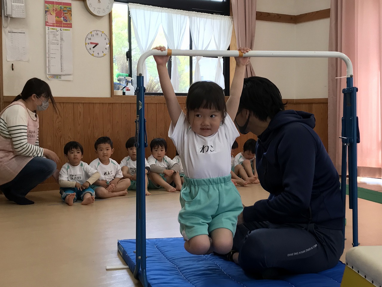 今日、以上児3クラスは、「体操教室」に参加しました。今年度、うめ組(3歳児)での初めての体操教室です。前日から「明日は、体操服着て来るね!」と、張り切っていたうめ組さん。指導の先生のお話をきちんと聞きながら、一人一人順番にマット・平均台・鉄棒にチャレンジしました。最初はマット、先生に補助されながらの前回り。次の平均台は、バランスを上手に取りながら、まっすぐ歩いたり、横歩きをしました。最後の鉄棒は、腕で全身を支えてのぶら下がり。子ども達は、とても積極的に楽しみながら参加することができていました。終わった後、「またしたいね!」と子ども達からの声が聞こえ、次回の体操教室を楽しみにしているようです。