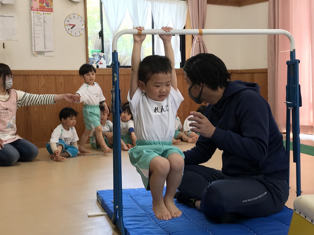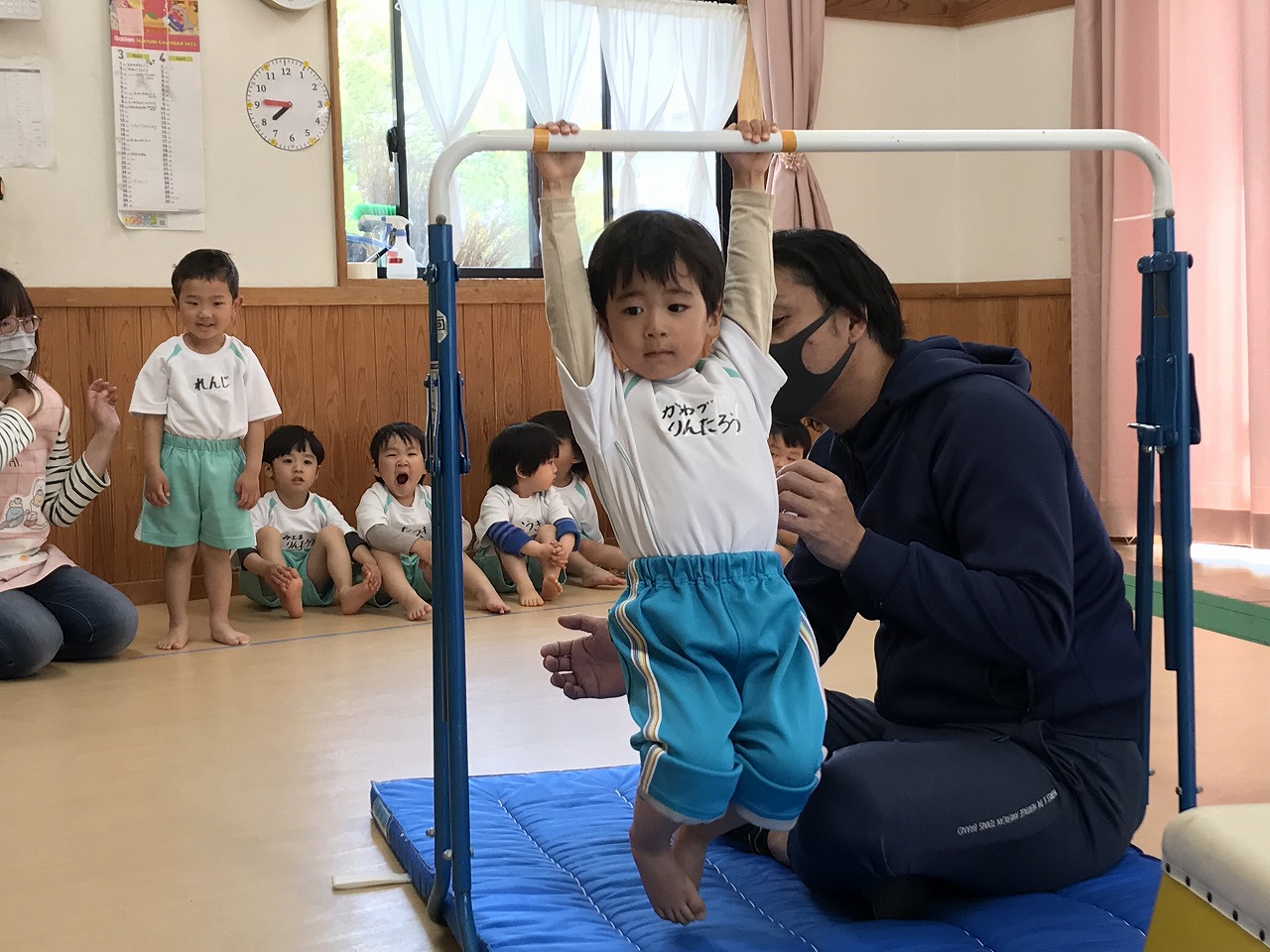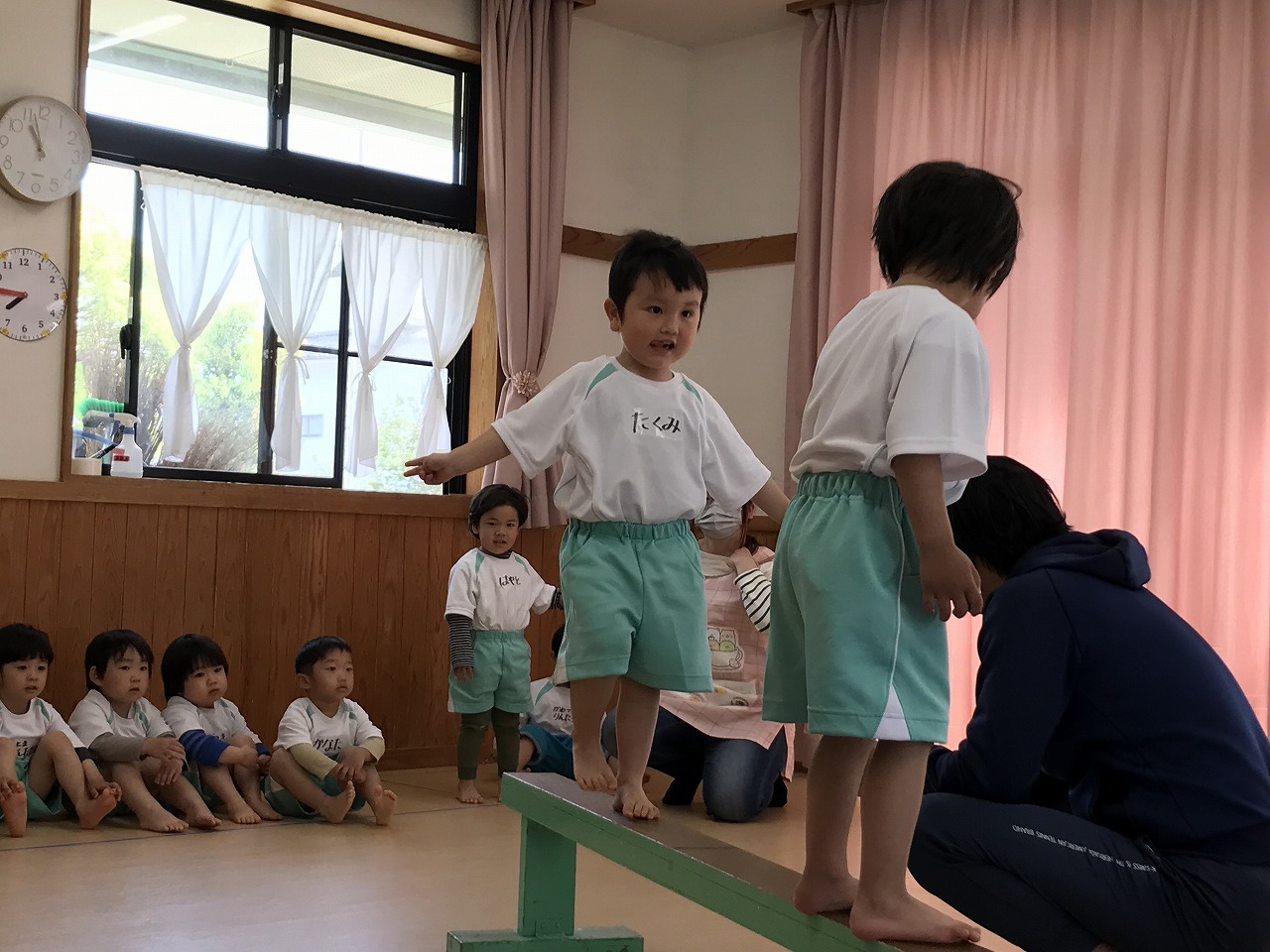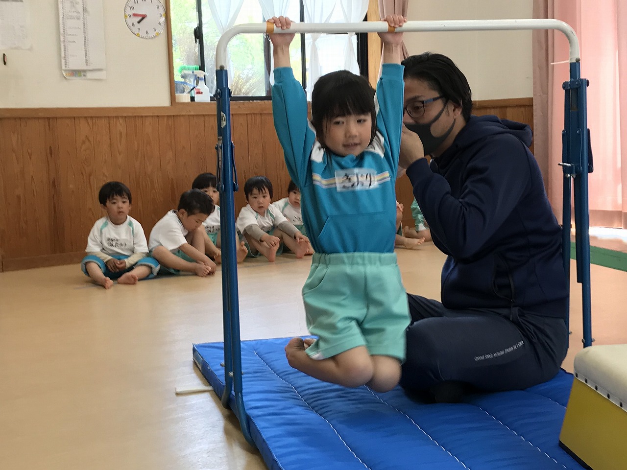 今日、以上児3クラスは、「体操教室」に参加しました。今年度、うめ組(3歳児)での初めての体操教室です。前日から「明日は、体操服着て来るね!」と、張り切っていたうめ組さん。指導の先生のお話をきちんと聞きながら、一人一人順番にマット・平均台・鉄棒にチャレンジしました。最初はマット、先生に補助されながらの前回り。次の平均台は、バランスを上手に取りながら、まっすぐ歩いたり、横歩きをしました。最後の鉄棒は、腕で全身を支えてのぶら下がり。子ども達は、とても積極的に楽しみながら参加することができていました。終わった後、「またしたいね!」と子ども達からの声が聞こえ、次回の体操教室を楽しみにしているようです。