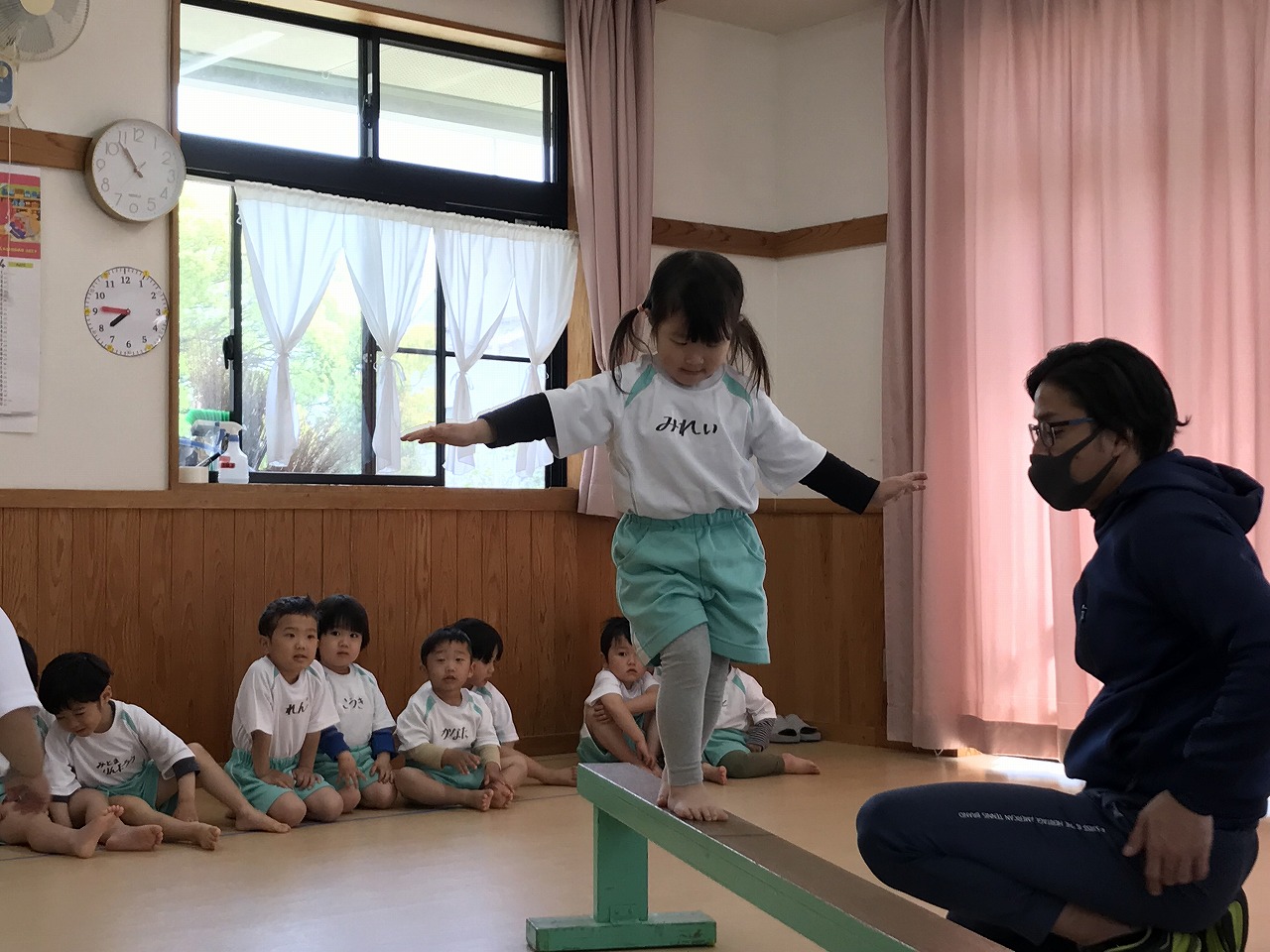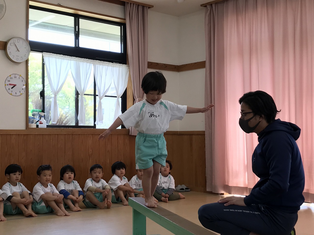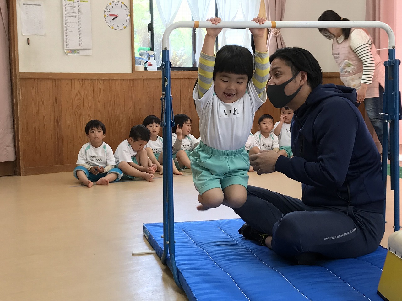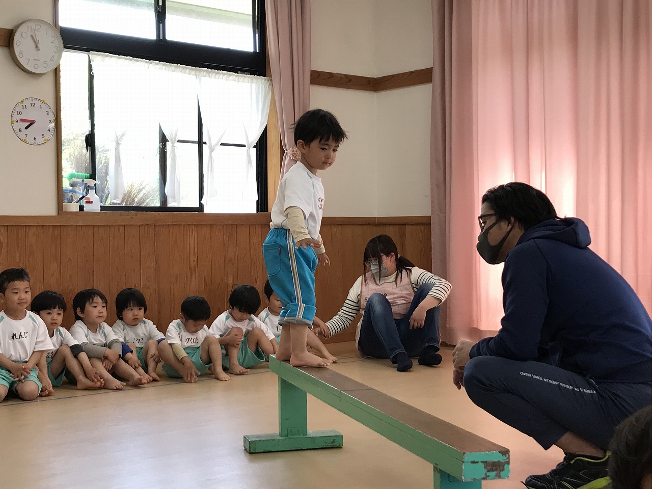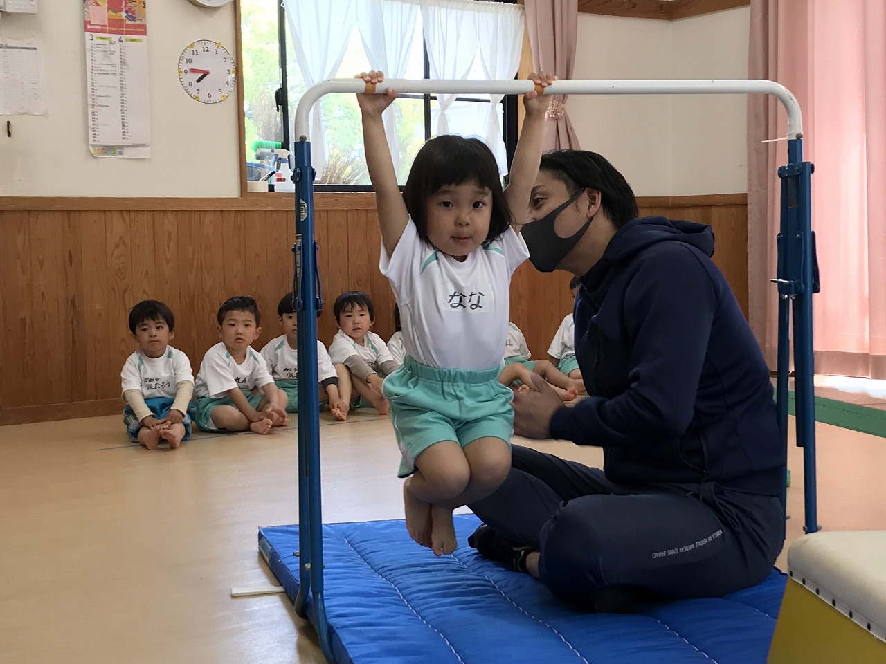 今日、以上児3クラスは、「体操教室」に参加しました。今年度、うめ組(3歳児)での初めての体操教室です。前日から「明日は、体操服着て来るね!」と、張り切っていたうめ組さん。指導の先生のお話をきちんと聞きながら、一人一人順番にマット・平均台・鉄棒にチャレンジしました。最初はマット、先生に補助されながらの前回り。次の平均台は、バランスを上手に取りながら、まっすぐ歩いたり、横歩きをしました。最後の鉄棒は、腕で全身を支えてのぶら下がり。子ども達は、とても積極的に楽しみながら参加することができていました。終わった後、「またしたいね!」と子ども達からの声が聞こえ、次回の体操教室を楽しみにしているようです。