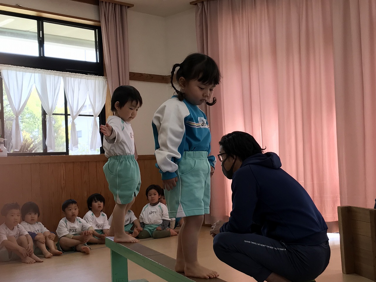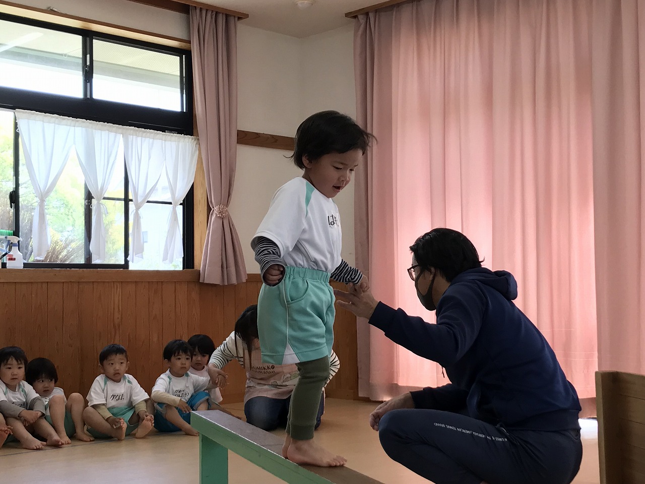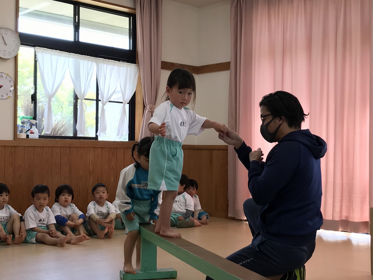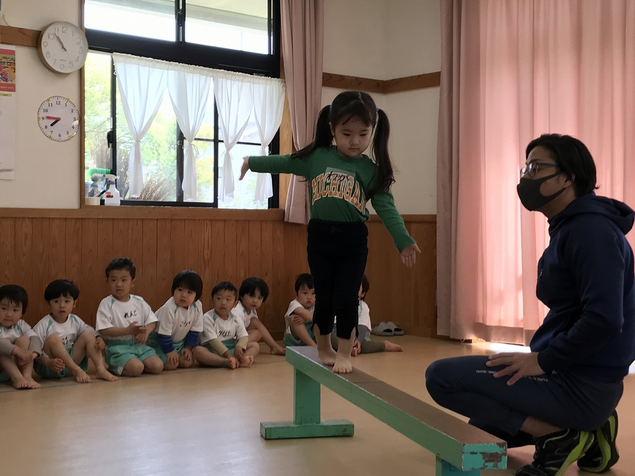 今日、以上児3クラスは、「体操教室」に参加しました。今年度、うめ組(3歳児)での初めての体操教室です。前日から「明日は、体操服着て来るね!」と、張り切っていたうめ組さん。指導の先生のお話をきちんと聞きながら、一人一人順番にマット・平均台・鉄棒にチャレンジしました。最初はマット、先生に補助されながらの前回り。次の平均台は、バランスを上手に取りながら、まっすぐ歩いたり、横歩きをしました。最後の鉄棒は、腕で全身を支えてのぶら下がり。子ども達は、とても積極的に楽しみながら参加することができていました。終わった後、「またしたいね!」と子ども達からの声が聞こえ、次回の体操教室を楽しみにしているようです。