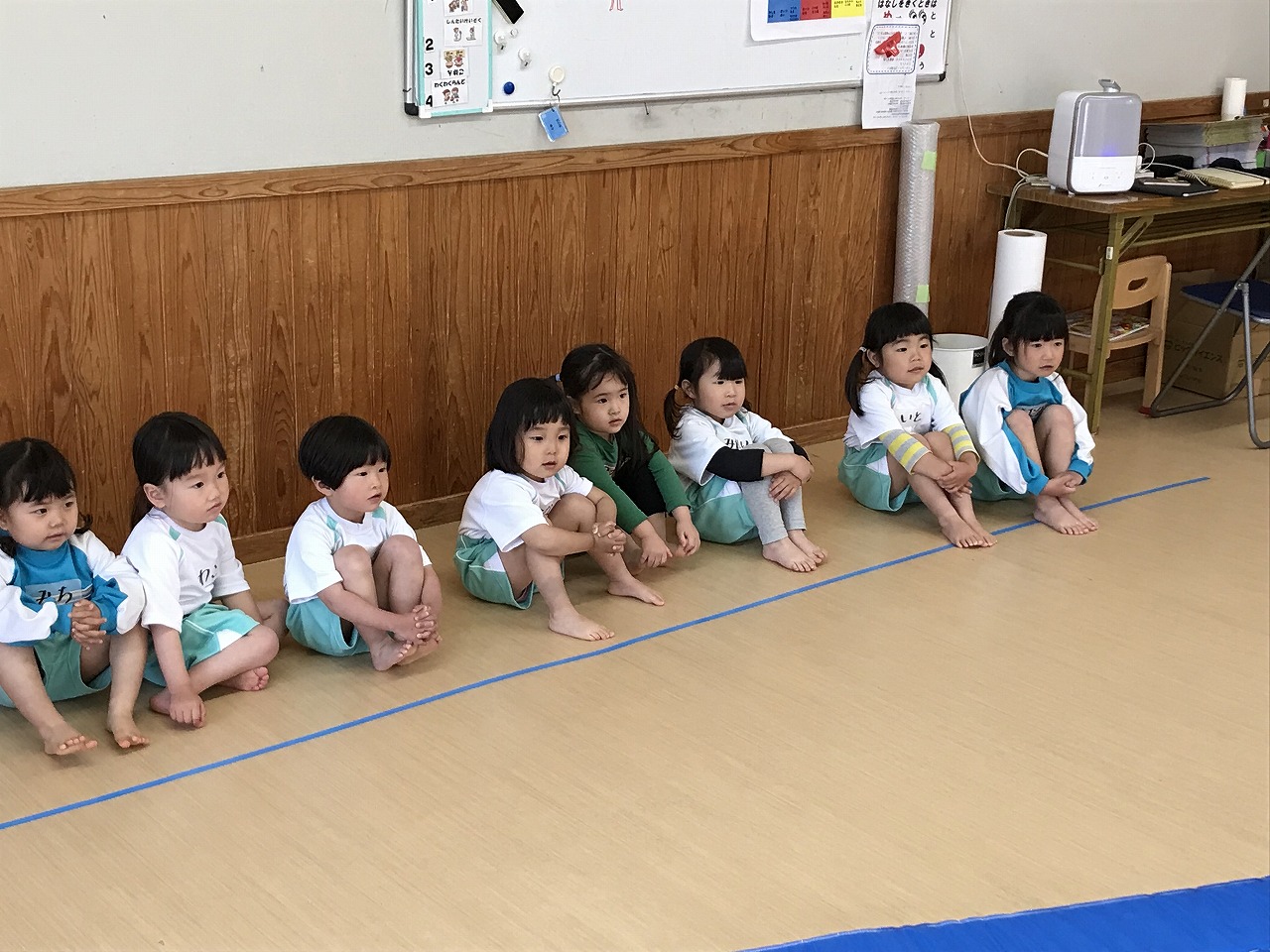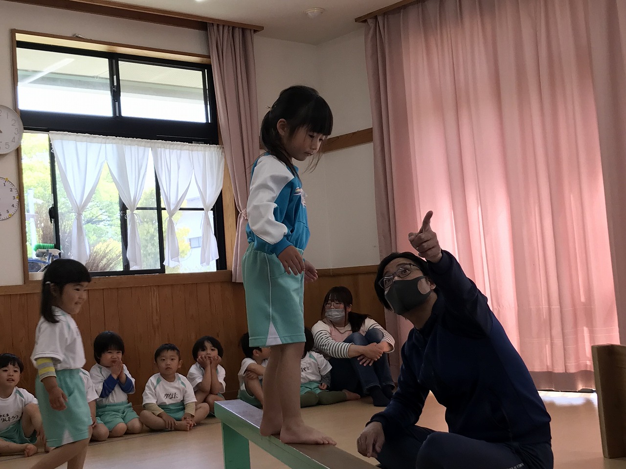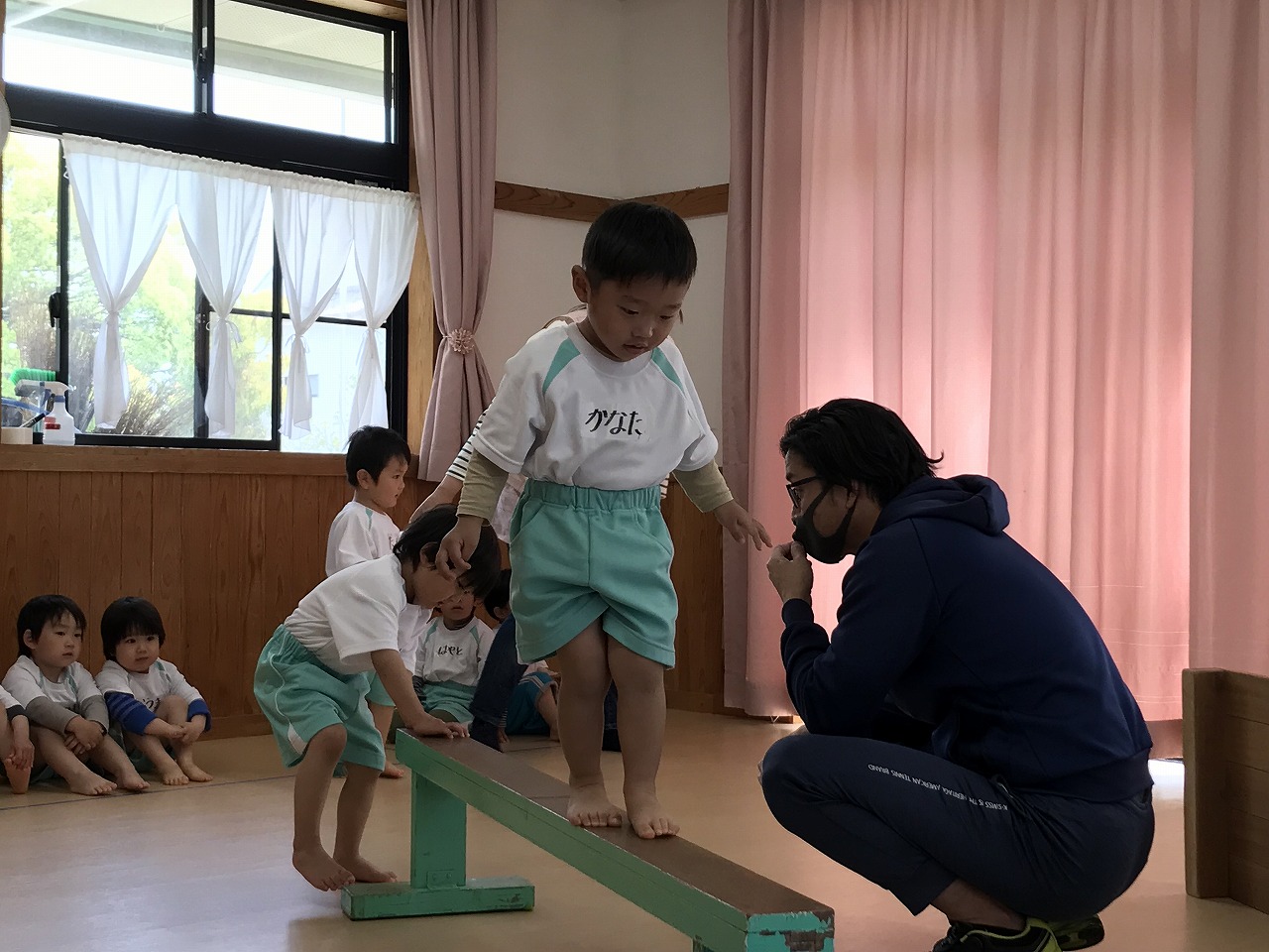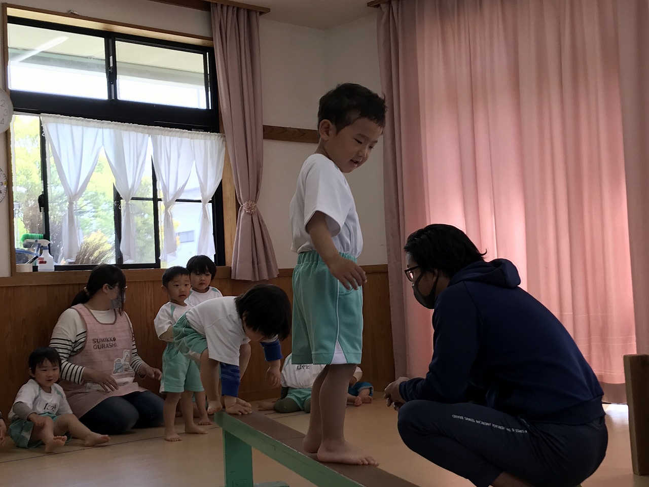 今日、以上児3クラスは、「体操教室」に参加しました。今年度、うめ組(3歳児)での初めての体操教室です。前日から「明日は、体操服着て来るね!」と、張り切っていたうめ組さん。指導の先生のお話をきちんと聞きながら、一人一人順番にマット・平均台・鉄棒にチャレンジしました。最初はマット、先生に補助されながらの前回り。次の平均台は、バランスを上手に取りながら、まっすぐ歩いたり、横歩きをしました。最後の鉄棒は、腕で全身を支えてのぶら下がり。子ども達は、とても積極的に楽しみながら参加することができていました。終わった後、「またしたいね!」と子ども達からの声が聞こえ、次回の体操教室を楽しみにしているようです。