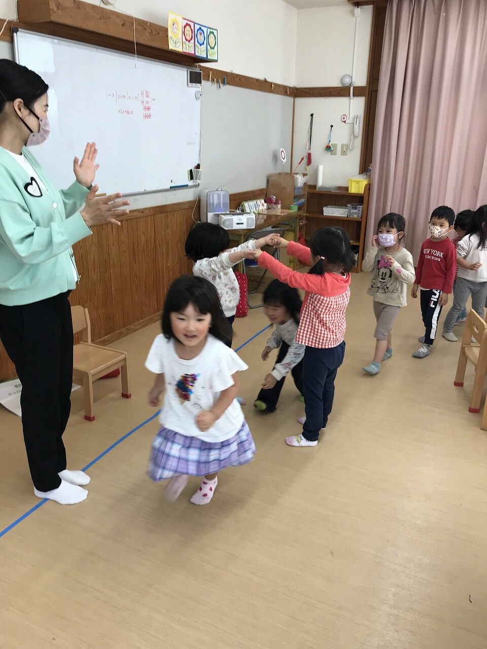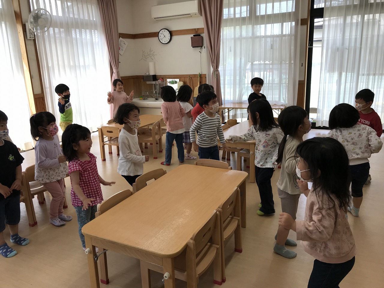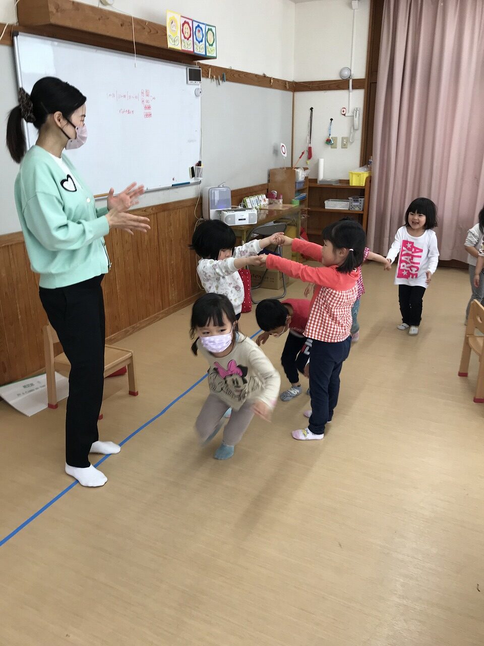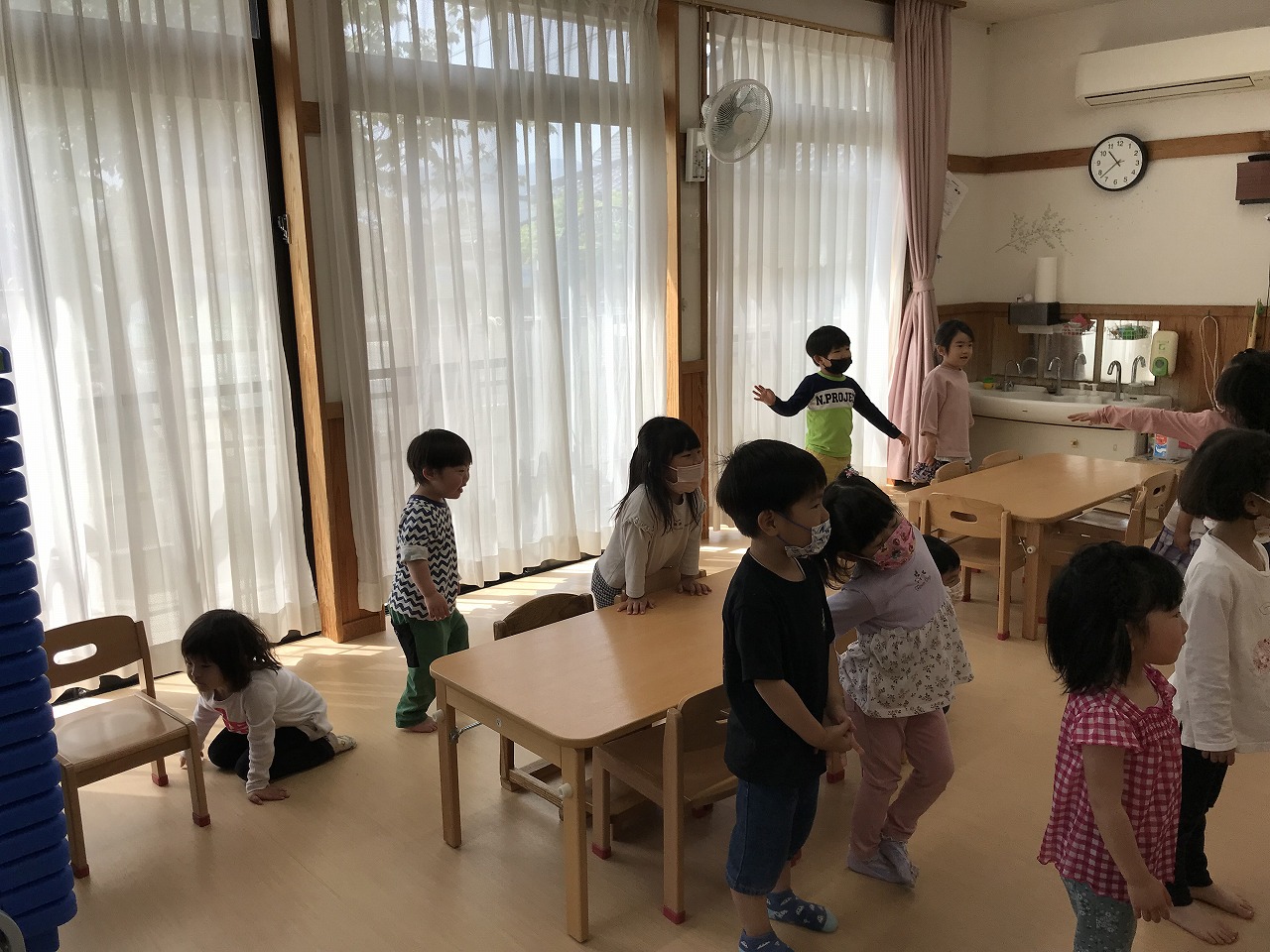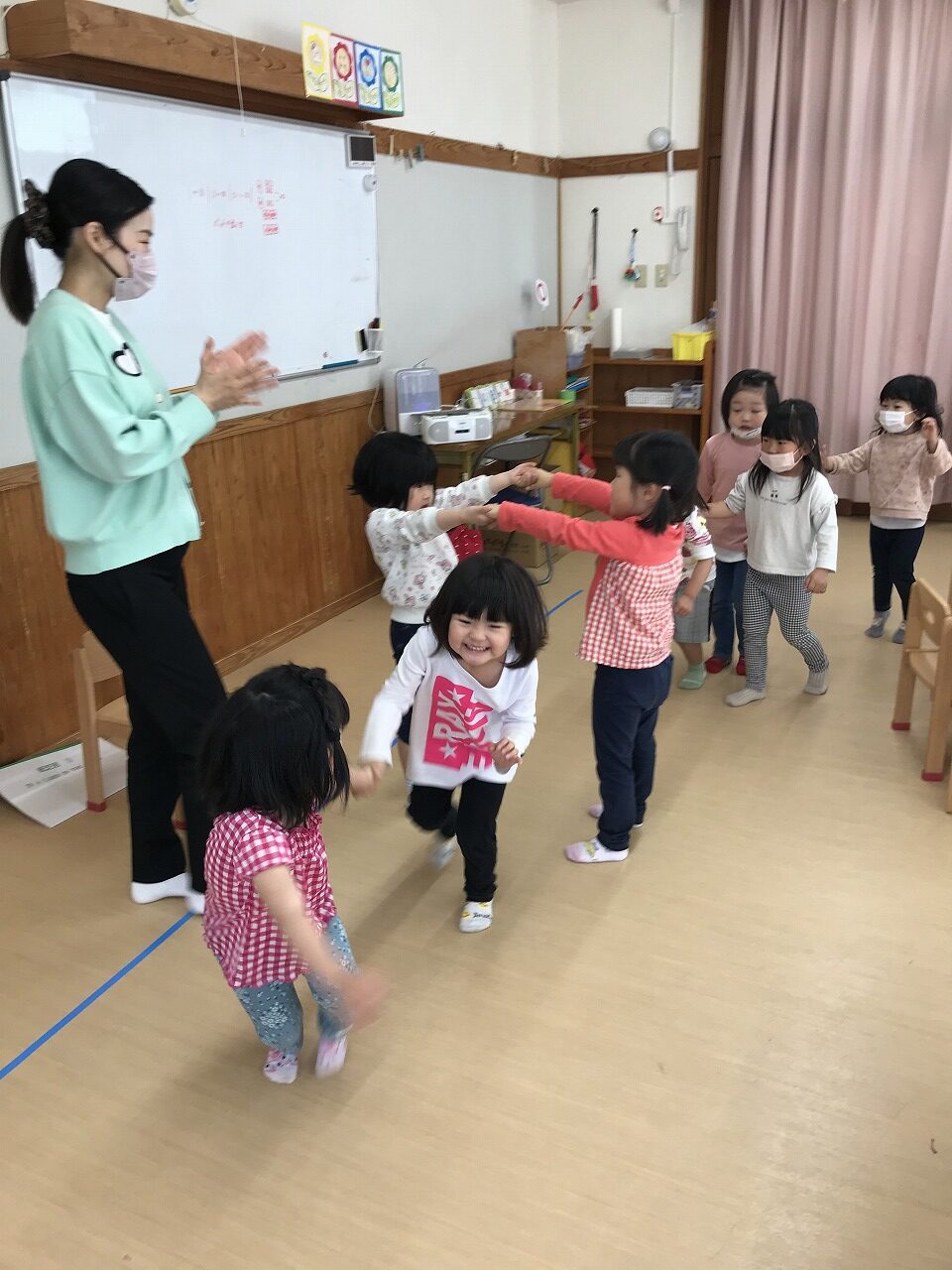 最後は、子ども達から「ロンド橋したいー」のリクエストに応え、曲が流れると歌を口ずさみながら楽しそうに橋をくぐりぬけていたさくら組(4愛児)さんです。