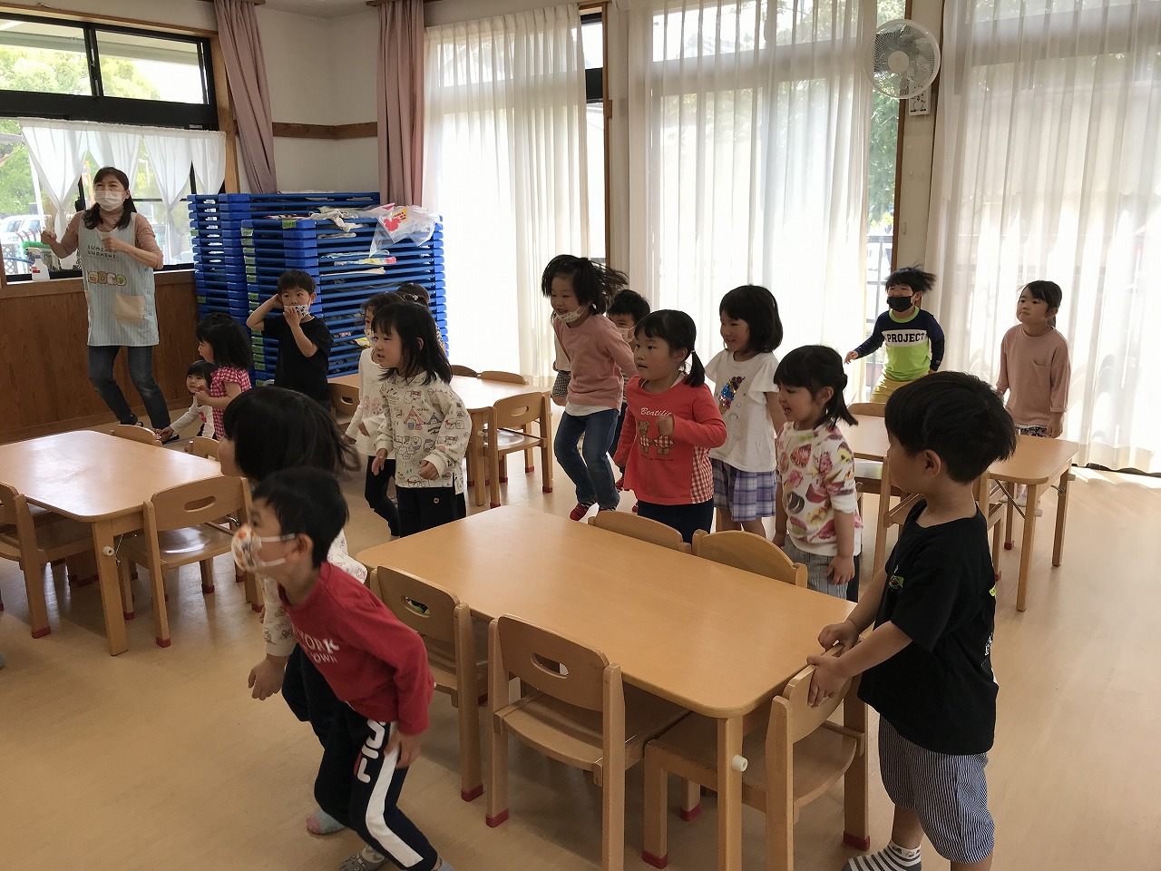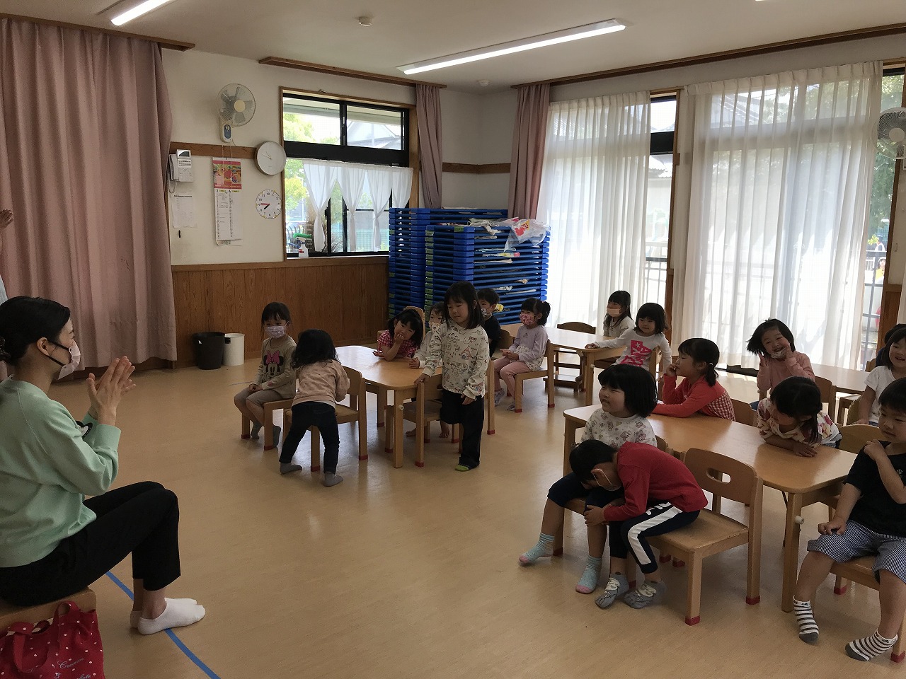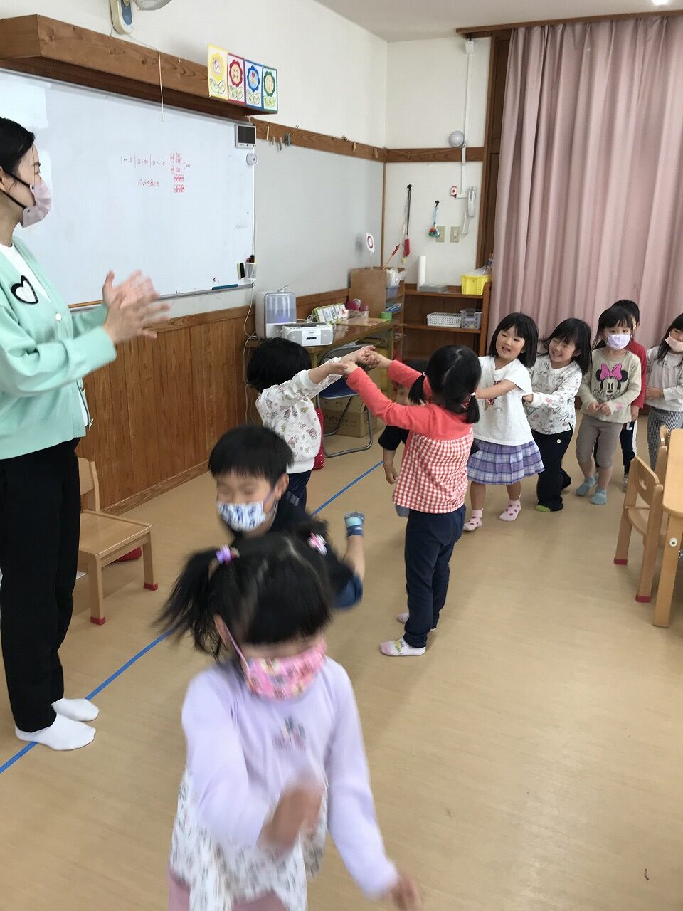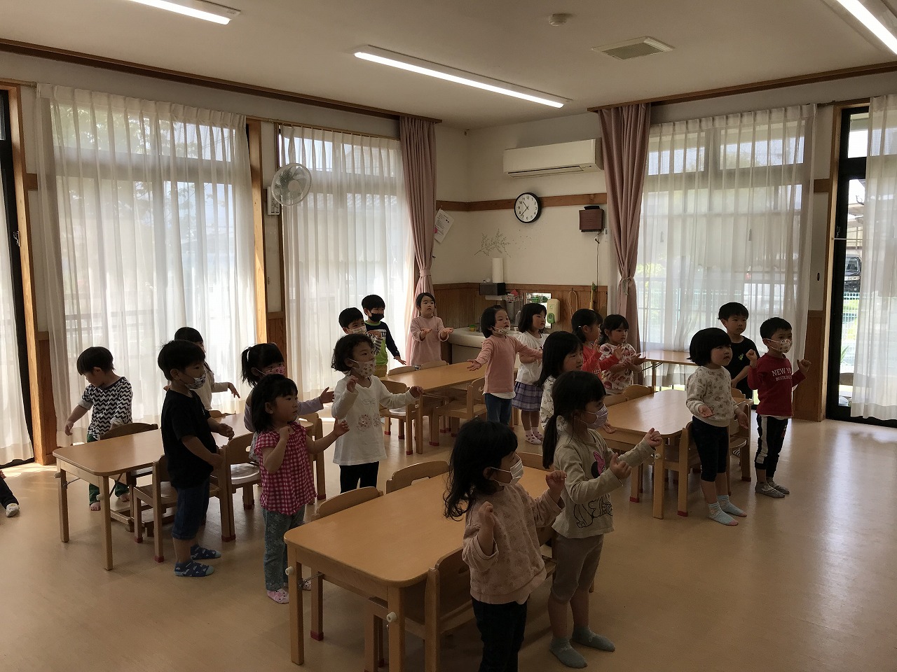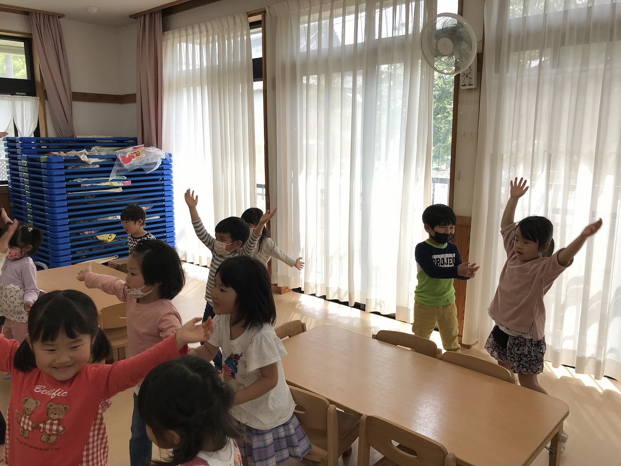 最後は、子ども達から「ロンド橋したいー」のリクエストに応え、曲が流れると歌を口ずさみながら楽しそうに橋をくぐりぬけていたさくら組(4愛児)さんです。
