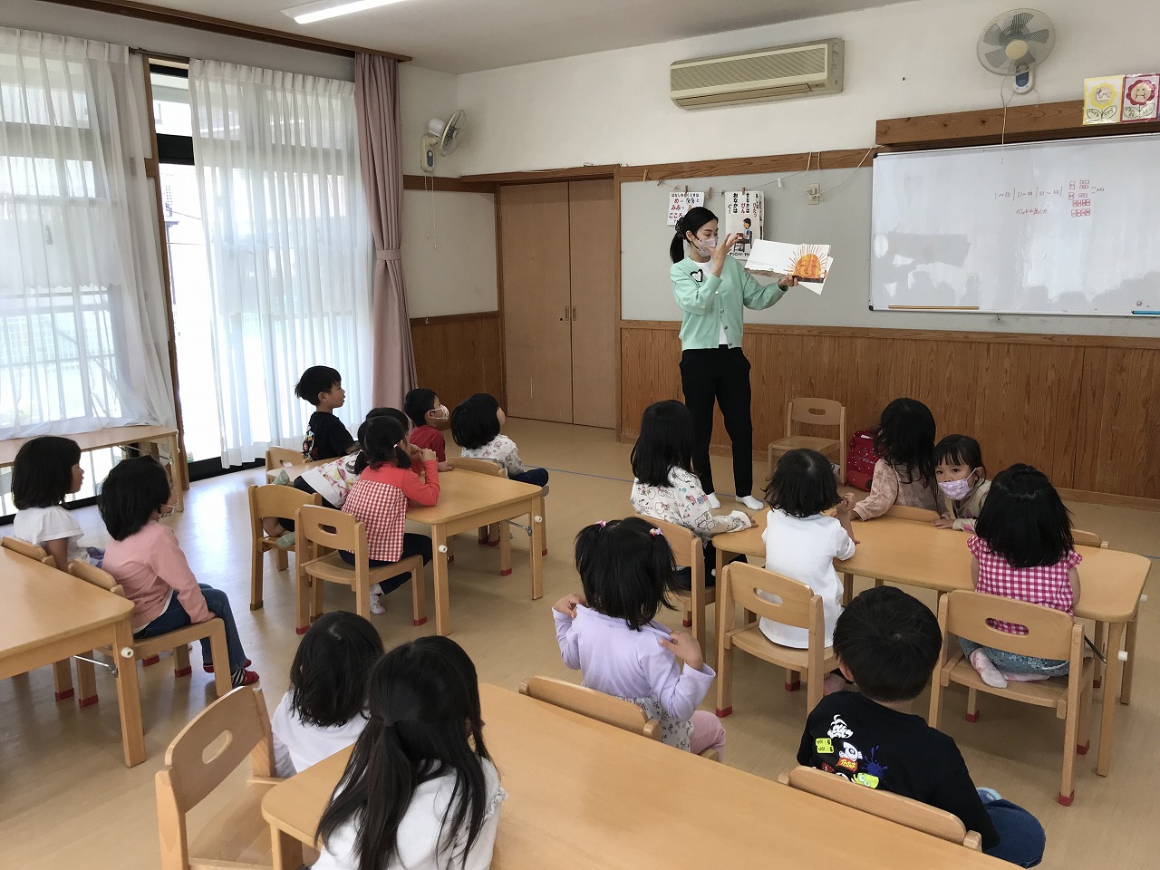 はらぺこあおむしの絵本を英語バージョンで聞き、絵本の中にでてきた食べ物や果物を英語で答えるクイズにも挑戦し楽しむ姿も見られました。